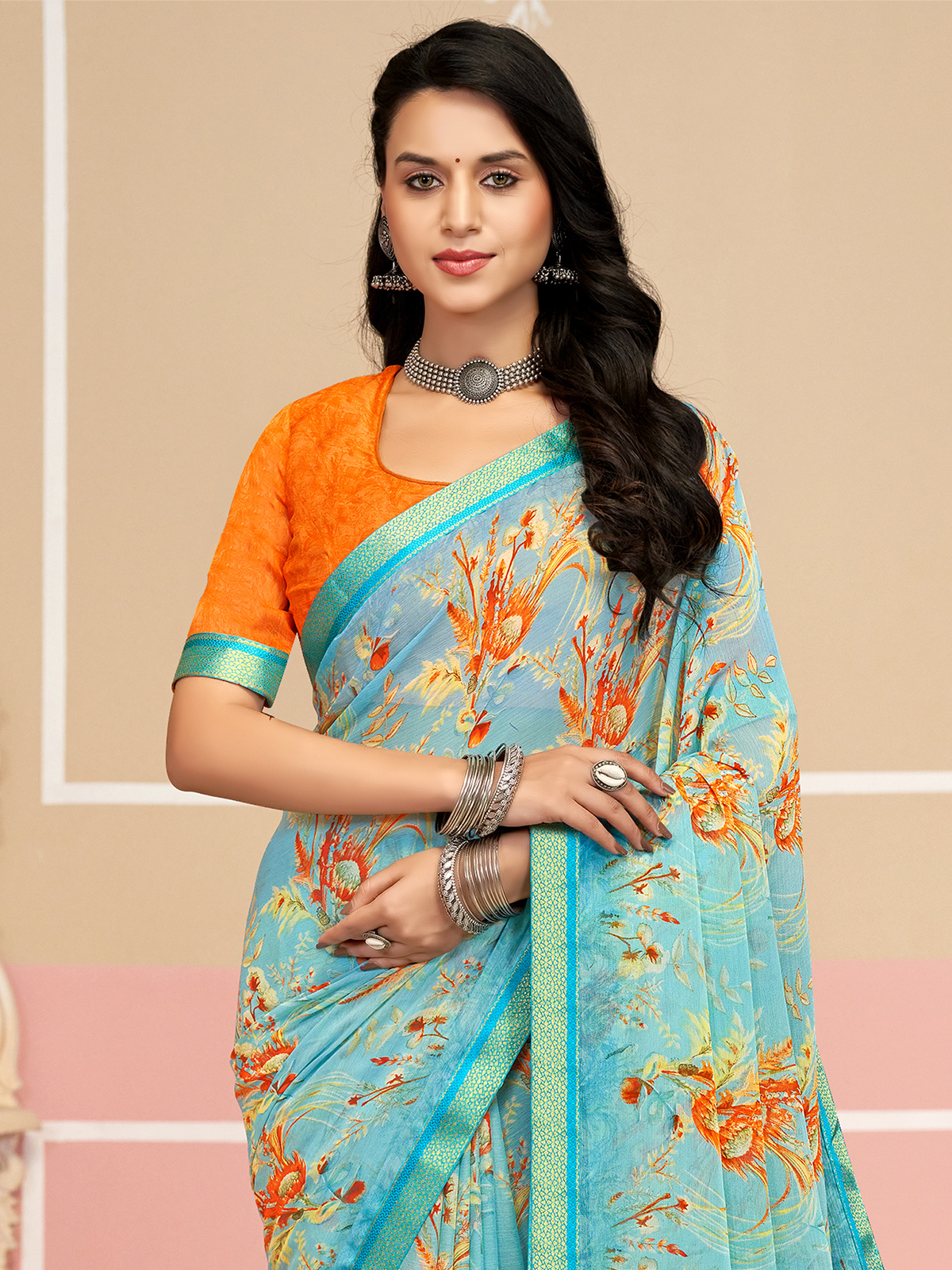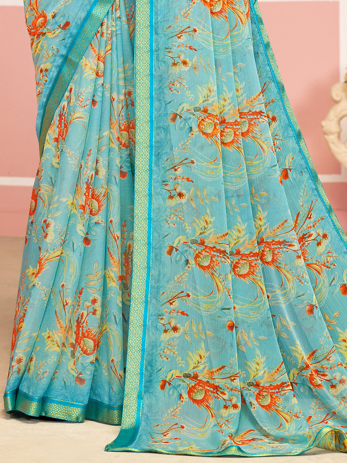 Designed in airy chiffon, this blue saree displays stylish digital prints highlighted with zari lace work along the borders. Lightweight and graceful, it drapes beautifully for all-day ease. Paired with an unstitched blouse piece, it is well suited for festive celebrations, puja rituals and casual ethnic outings.