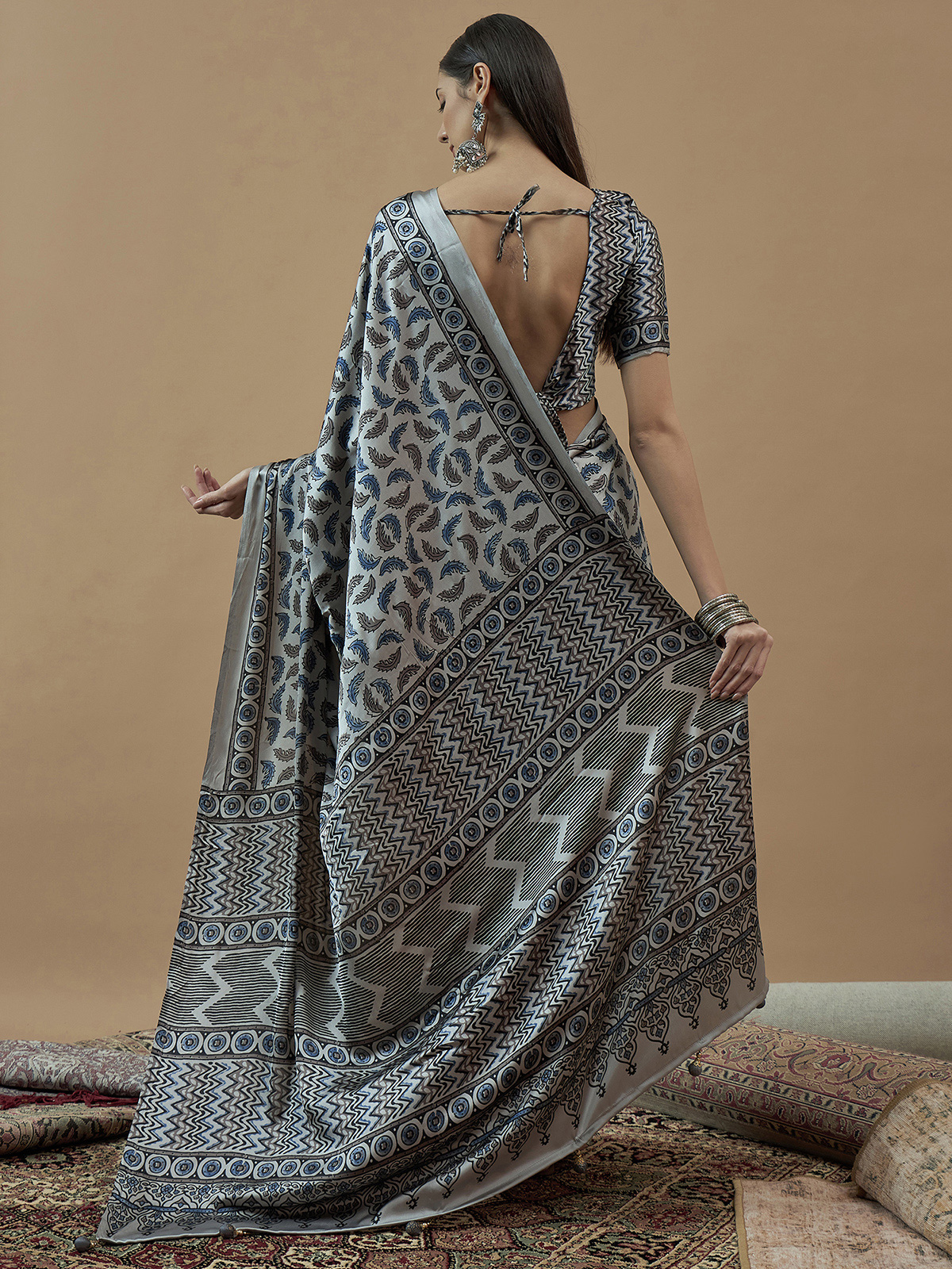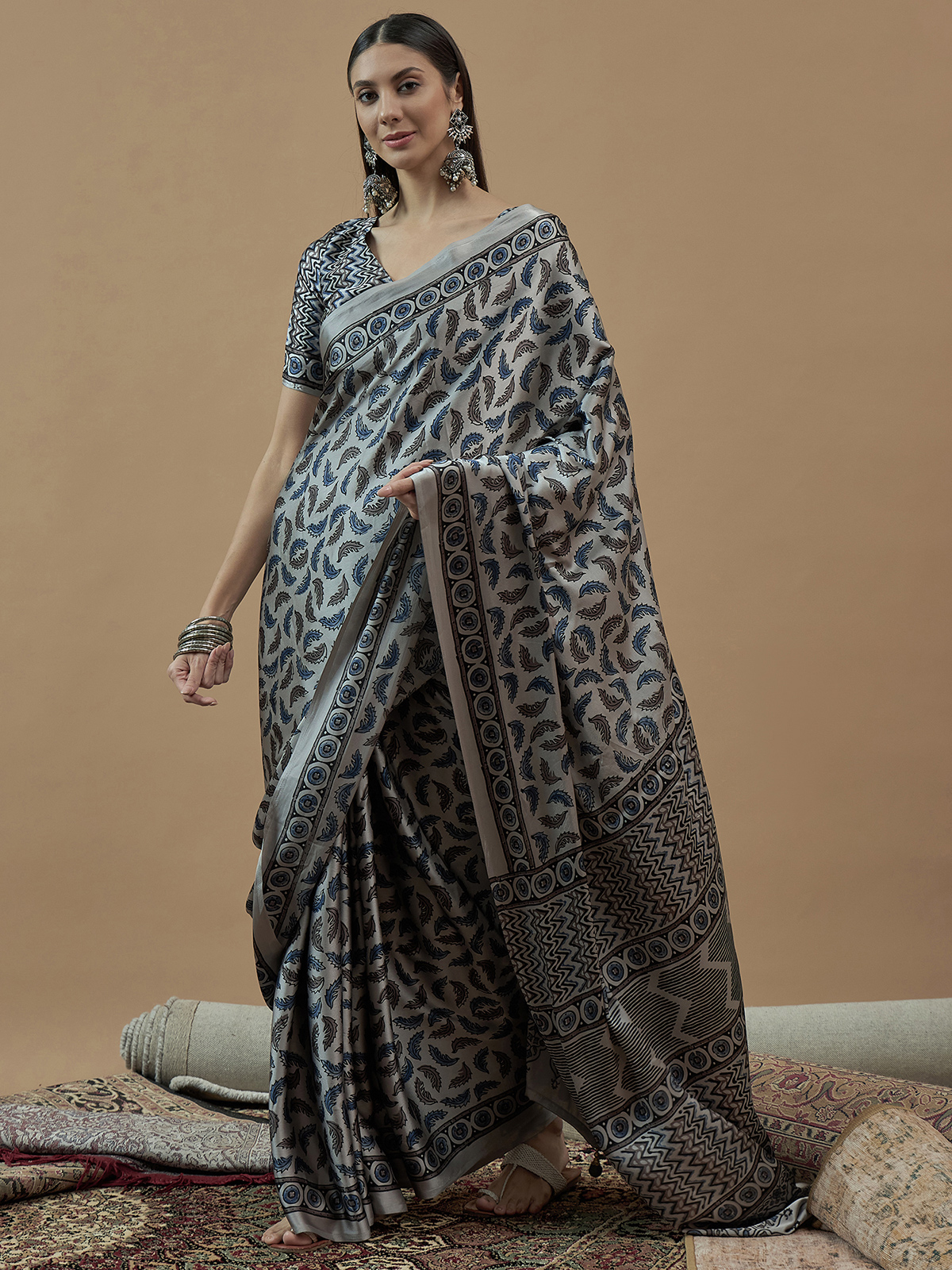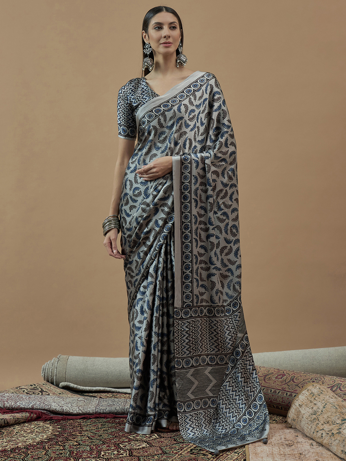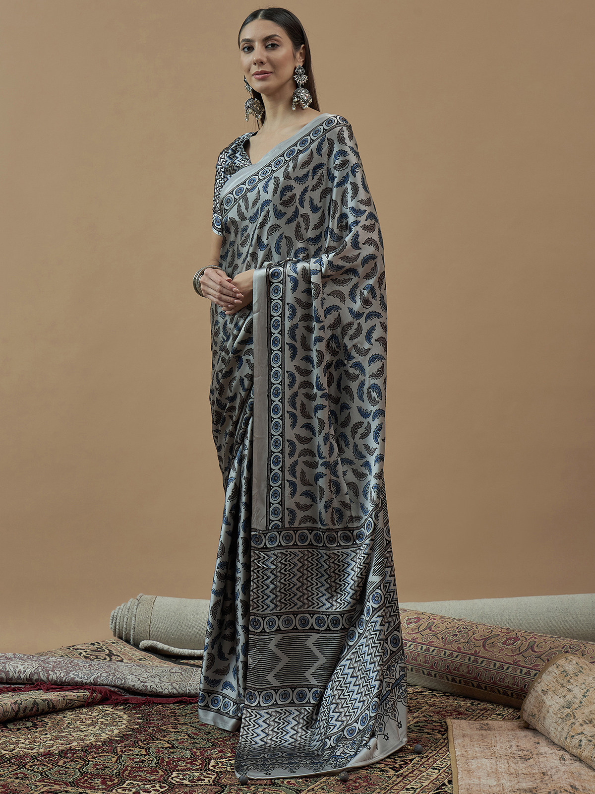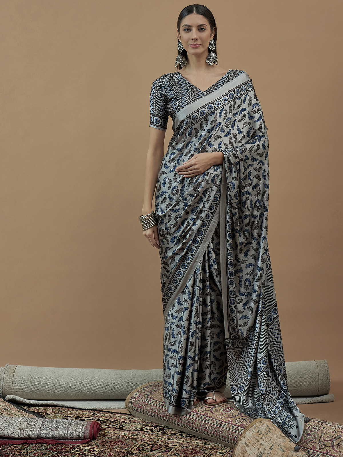 Showcase timeless grace in this blue japan satin saree, crafted with luxurious fabric and adorned with intricate prints. A beautiful choice for traditional events, it includes a coordinating unstitched blouse piece.