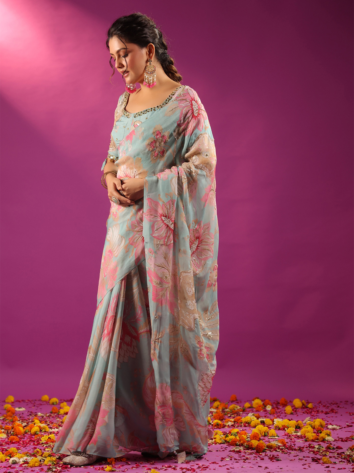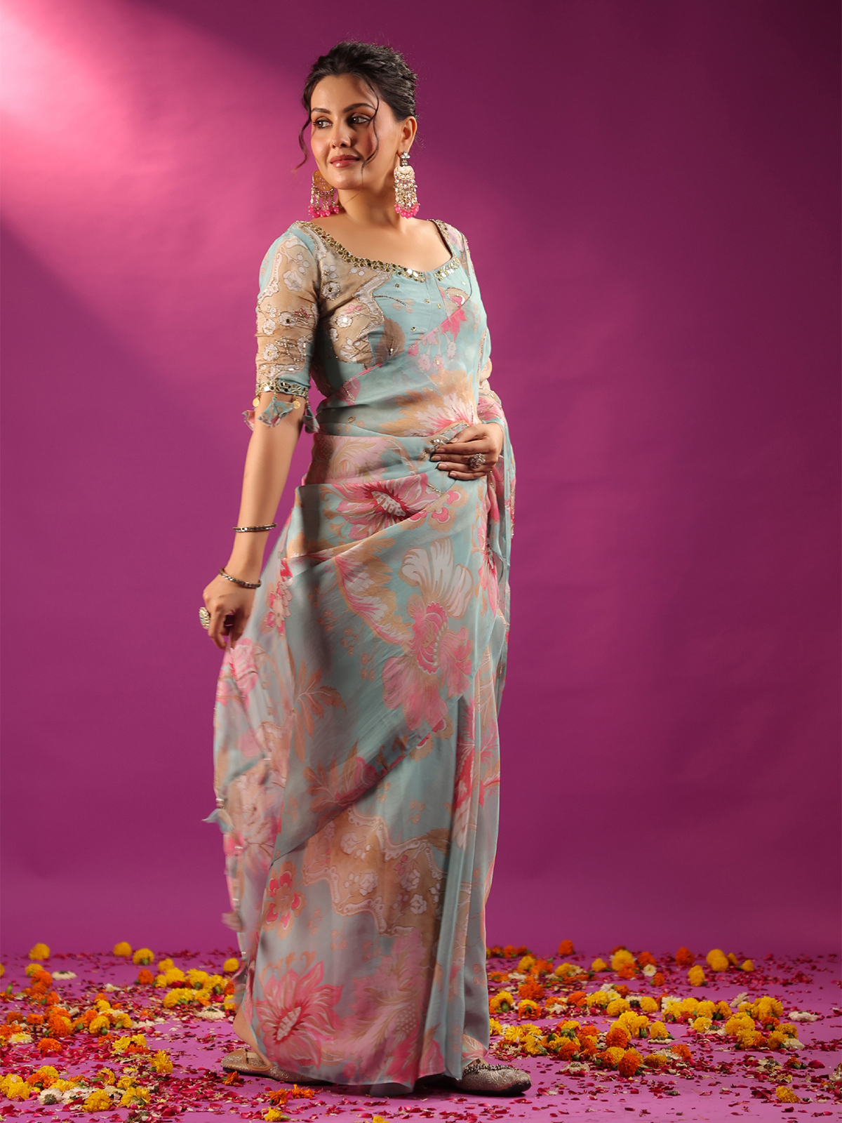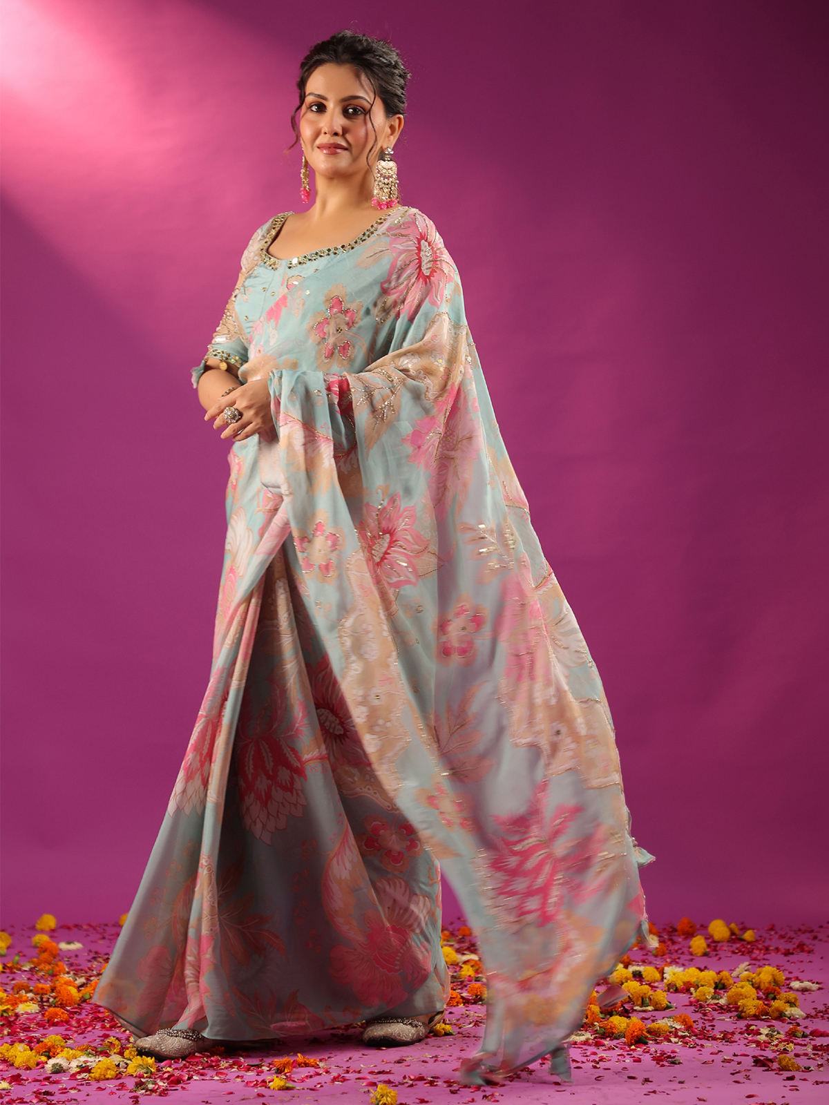This blue crepe georgette blouse is adorned with dazzling mirror, cutdana, bead, and sequin work. Ideal for weddings and festive evenings, it offers a radiant, glamorous look rooted in traditional Indian embroidery styles.