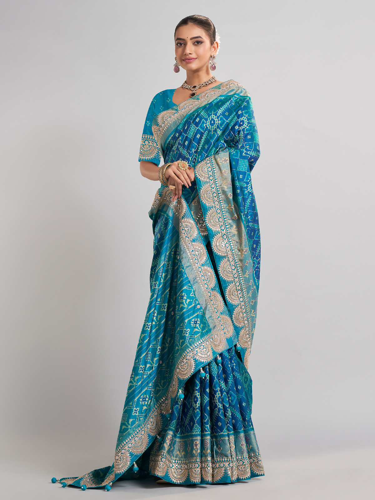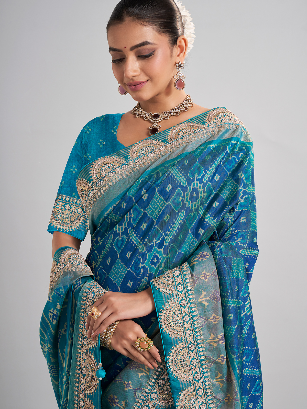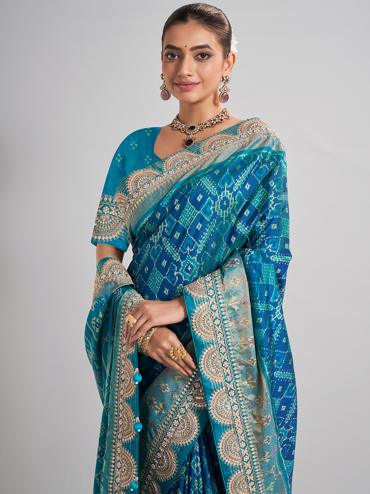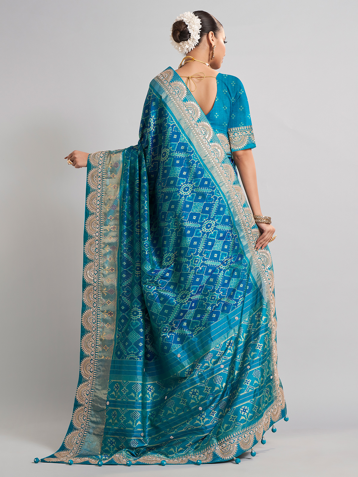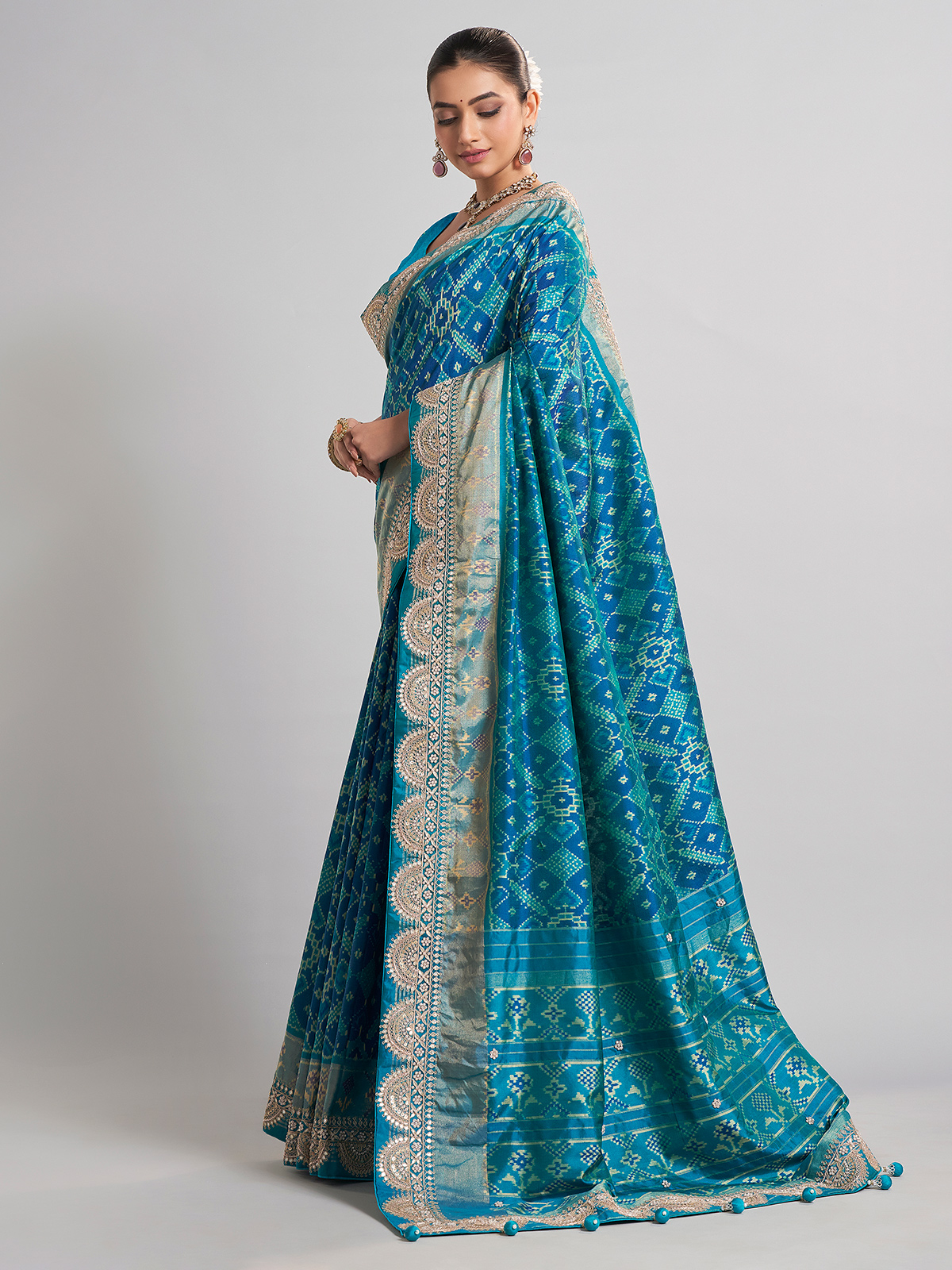 Celebrate heritage in this blue patola silk saree featuring thread, zardosi, sequins, beads, gota, pearls, and zari work. A luxurious addition to your festive wardrobe, complete with an unstitched blouse piece.