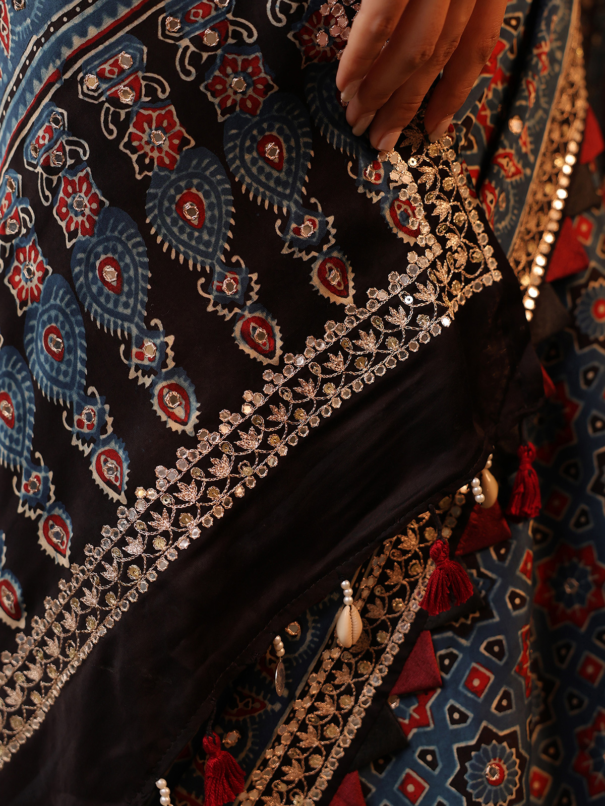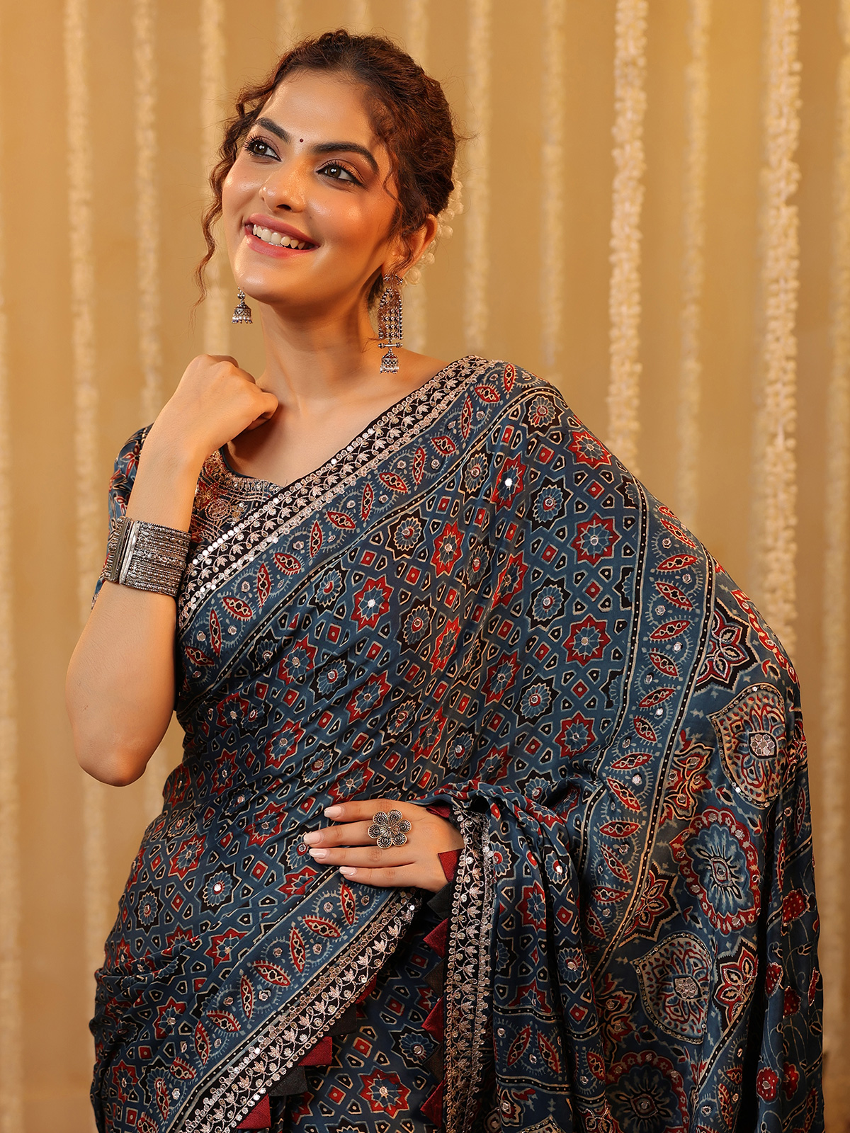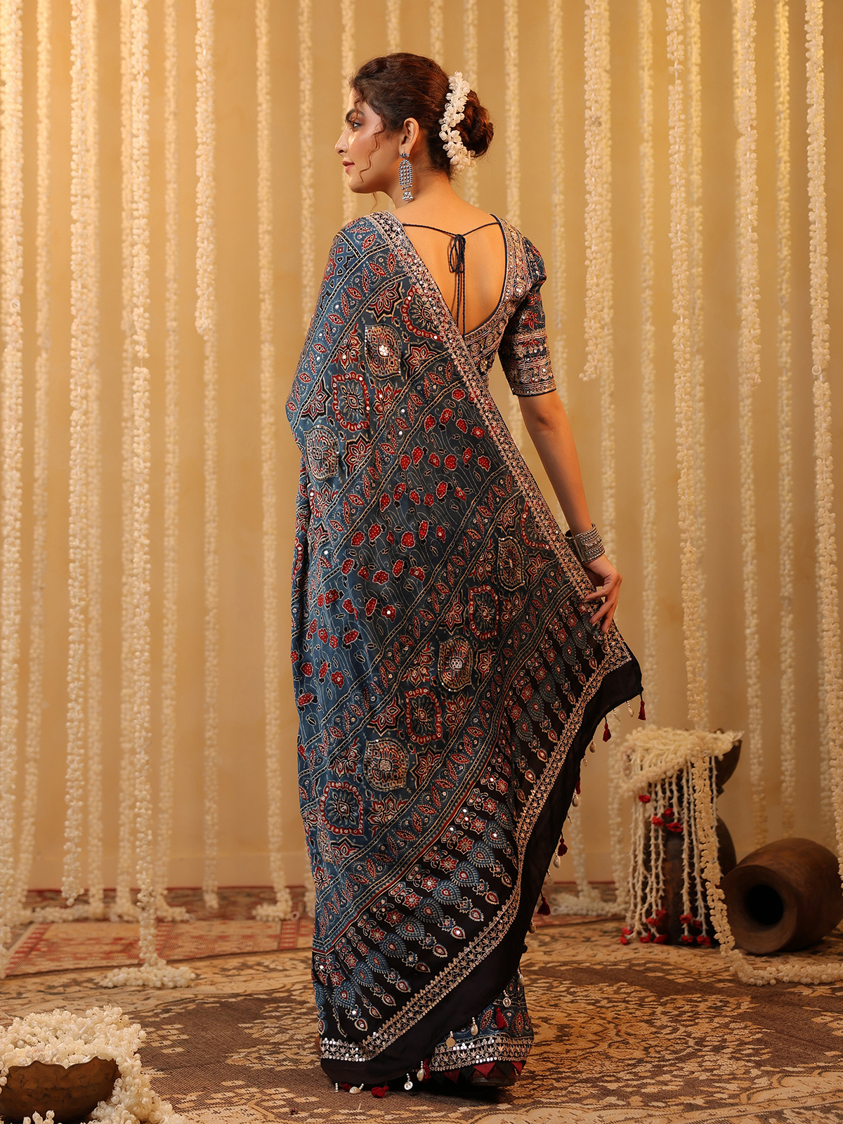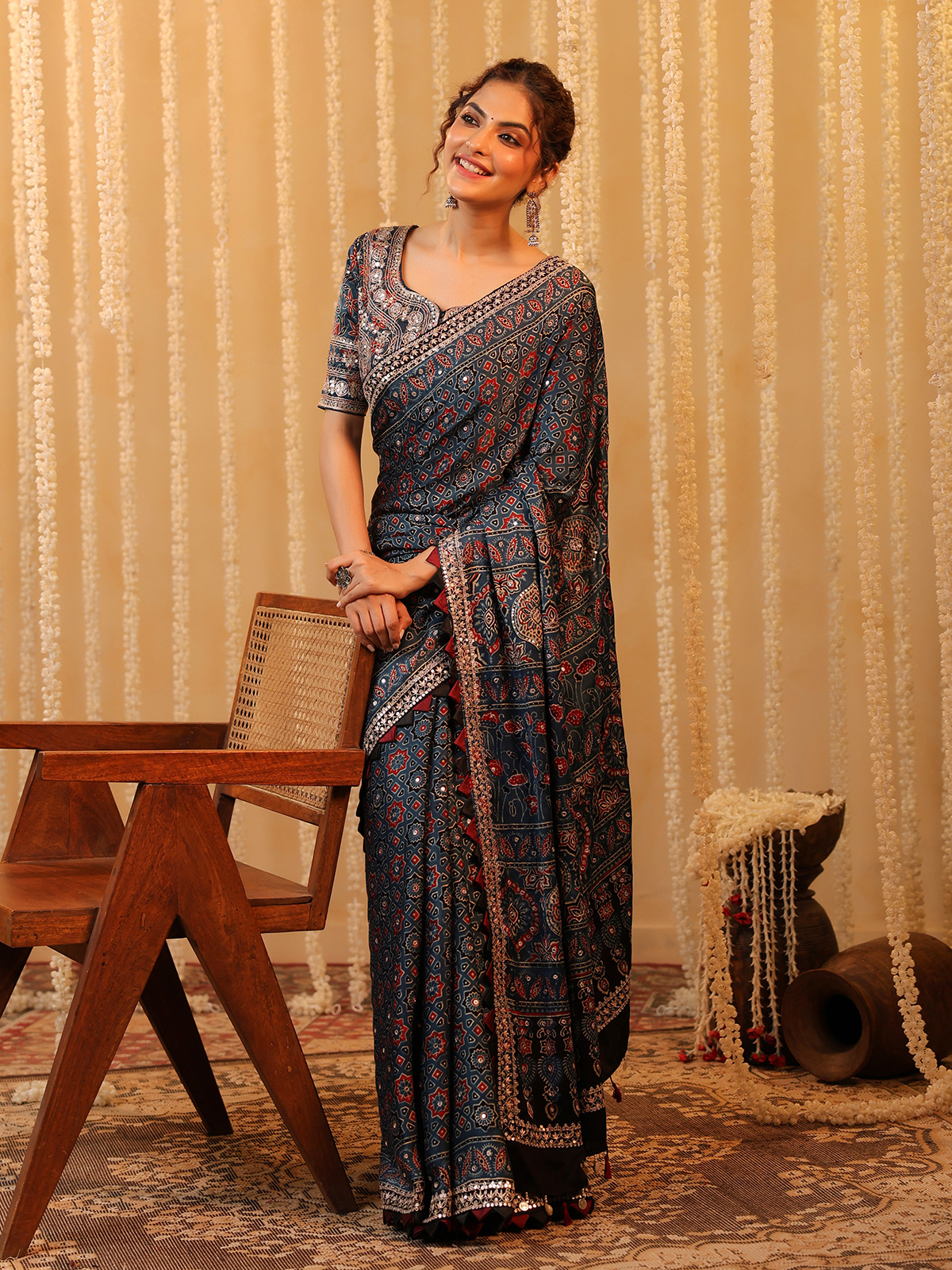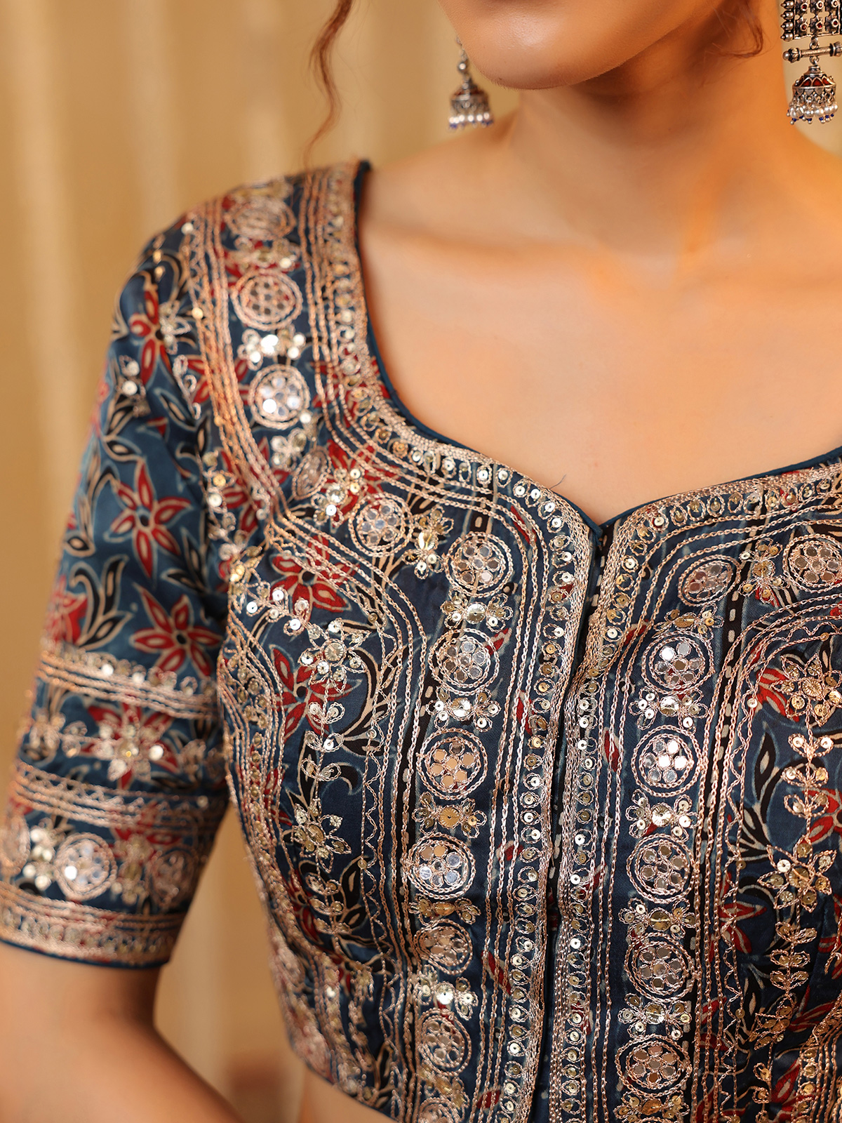 Serene blue cotton silk printed saree glows with resham, sequins, beads, cowrie shells, and mirror work, lighting up every fold with festive beauty. Teamed with a readymade blouse, it carries cultural artistry wrapped in elegance. Perfect for gatherings, it weaves timeless tradition into graceful celebration.