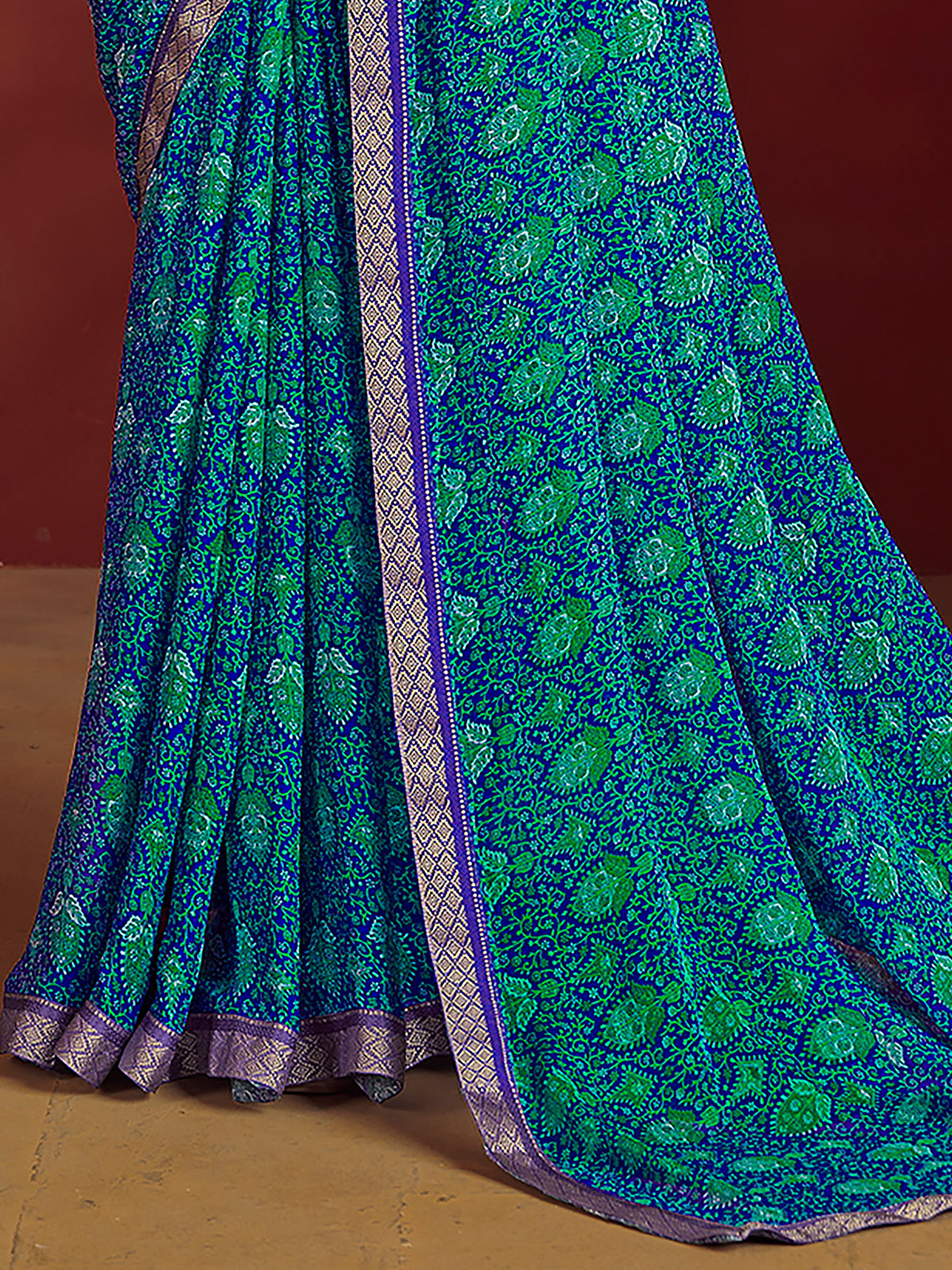 Designed in soft chiffon, this blue saree features stylish printed patterns enhanced with delicate lace detailing and zari work along the borders. Its flowy texture creates a refined silhouette. Paired with an unstitched blouse piece, it is ideal for festive gatherings, puja rituals and elegant casual occasions.