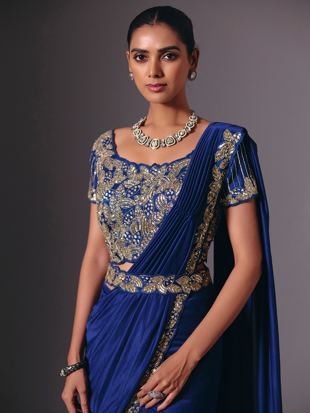 Smooth satin lycra defines this blue saree, highlighted by cutdana, bead, and sequin artistry. The designer waist belt brings a flattering fit, perfect for weddings, receptions, and festive evening gatherings.