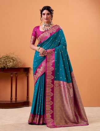 This blue soft satin silk saree showcases intricate zari craftsmanship and delicate motif artistry. The unstitched blouse allows personalized styling for festive and wedding occasions. With its silky flow and rich tone, it brings a timeless elegance and beautifully balanced traditional charm.