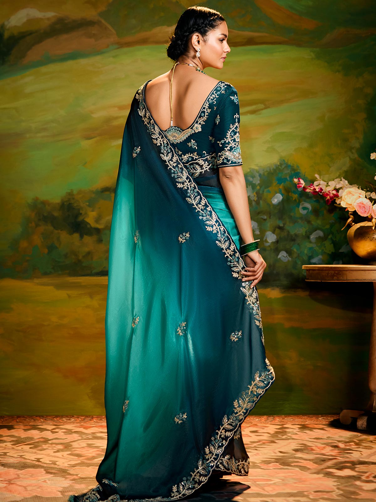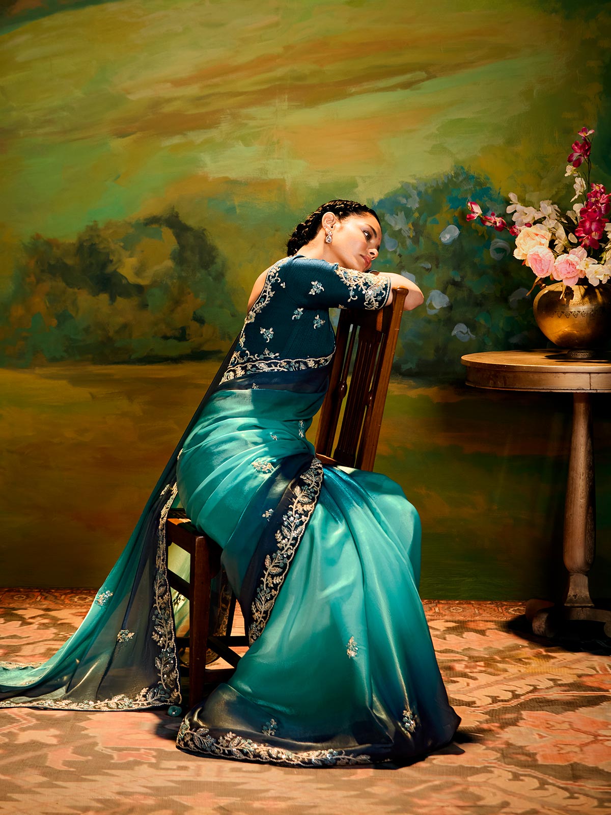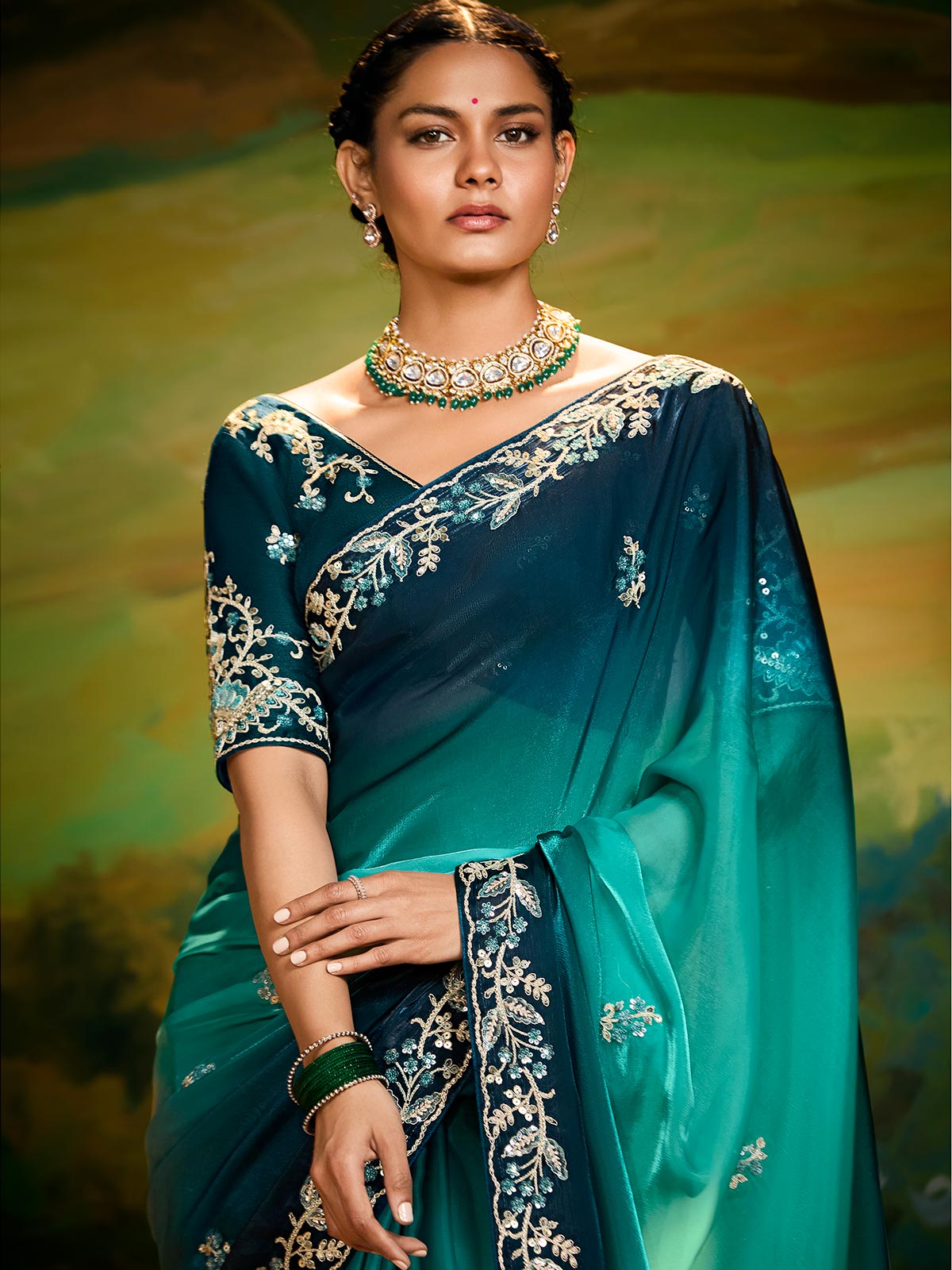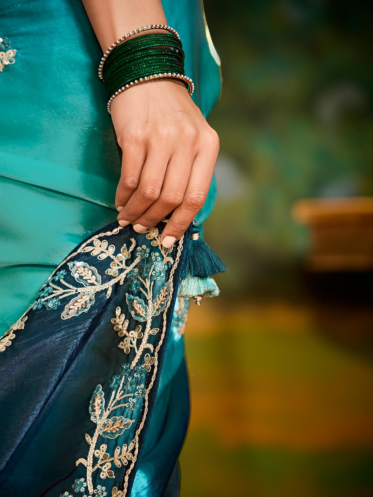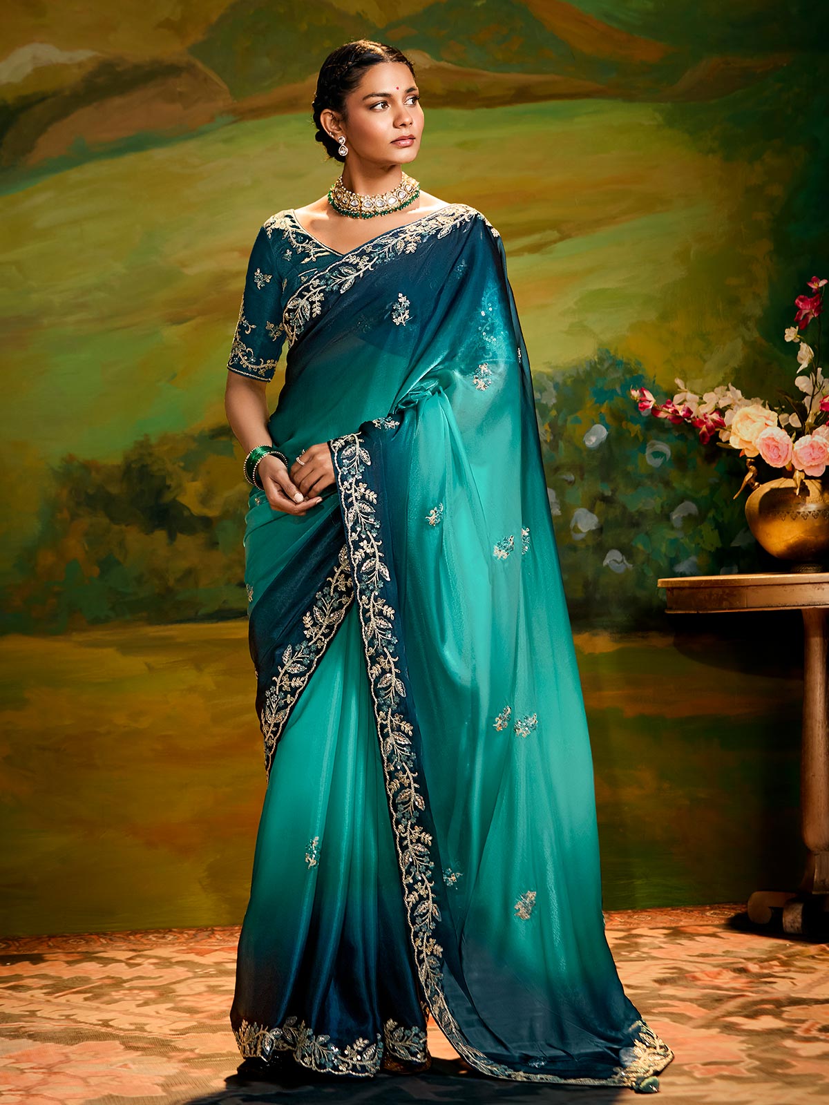 The blue silk saree displays detailed sequins and resham craftsmanship, offering a polished and graceful look. Comes with an unstitched blouse piece for tailored fitting.