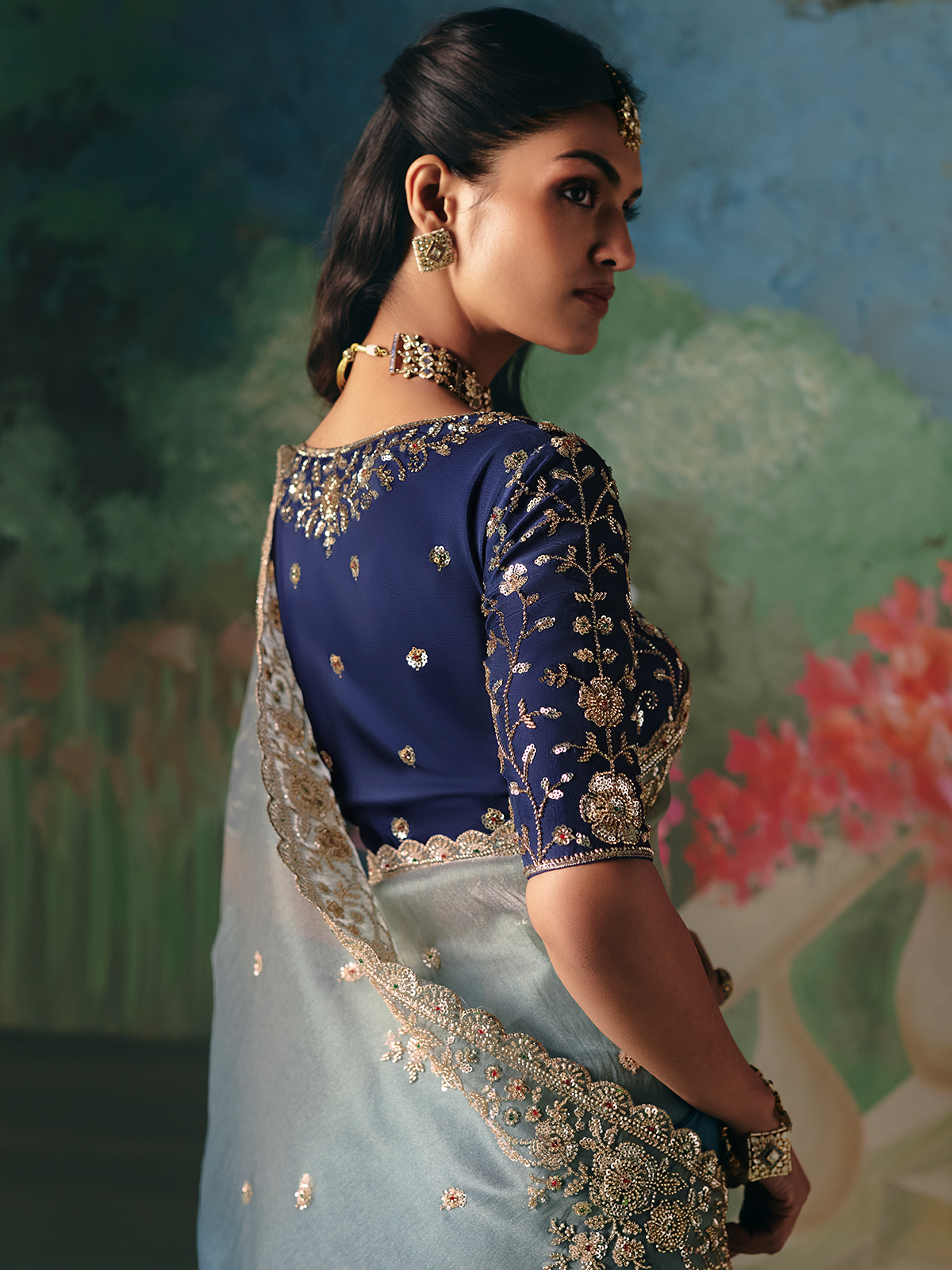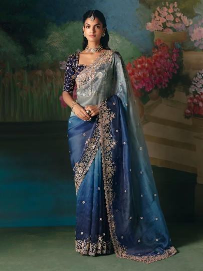 Crafted in shaded blue chinon silk saree. Features a heavy work unstitched blouse highlighted with cutdana, beads and sequin detailing. The elegant drape paired with rich saree work makes it suitable for weddings, receptions, sangeet and festive events.
