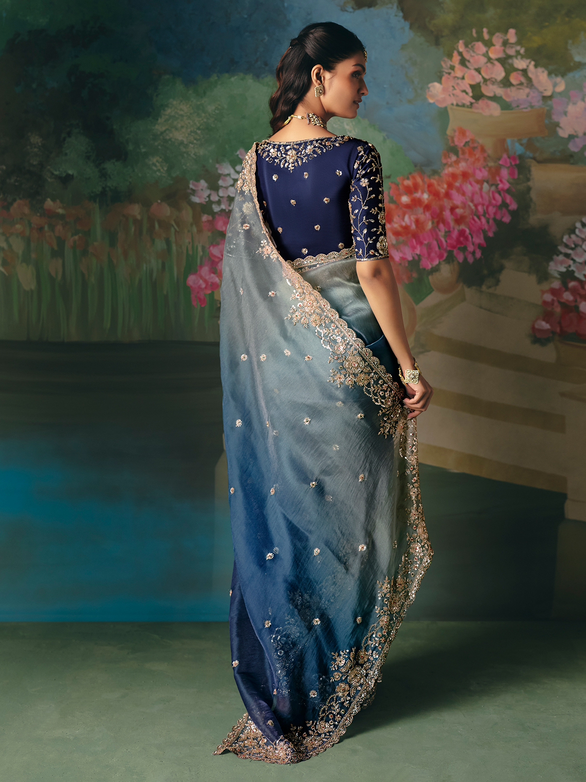 Blue Shaded Chinon Silk Saree With Heavy Work Blouse