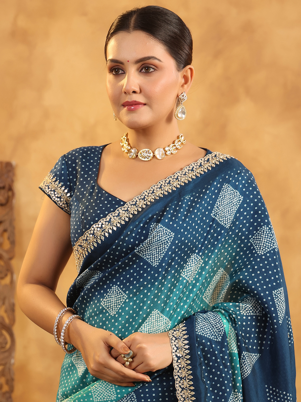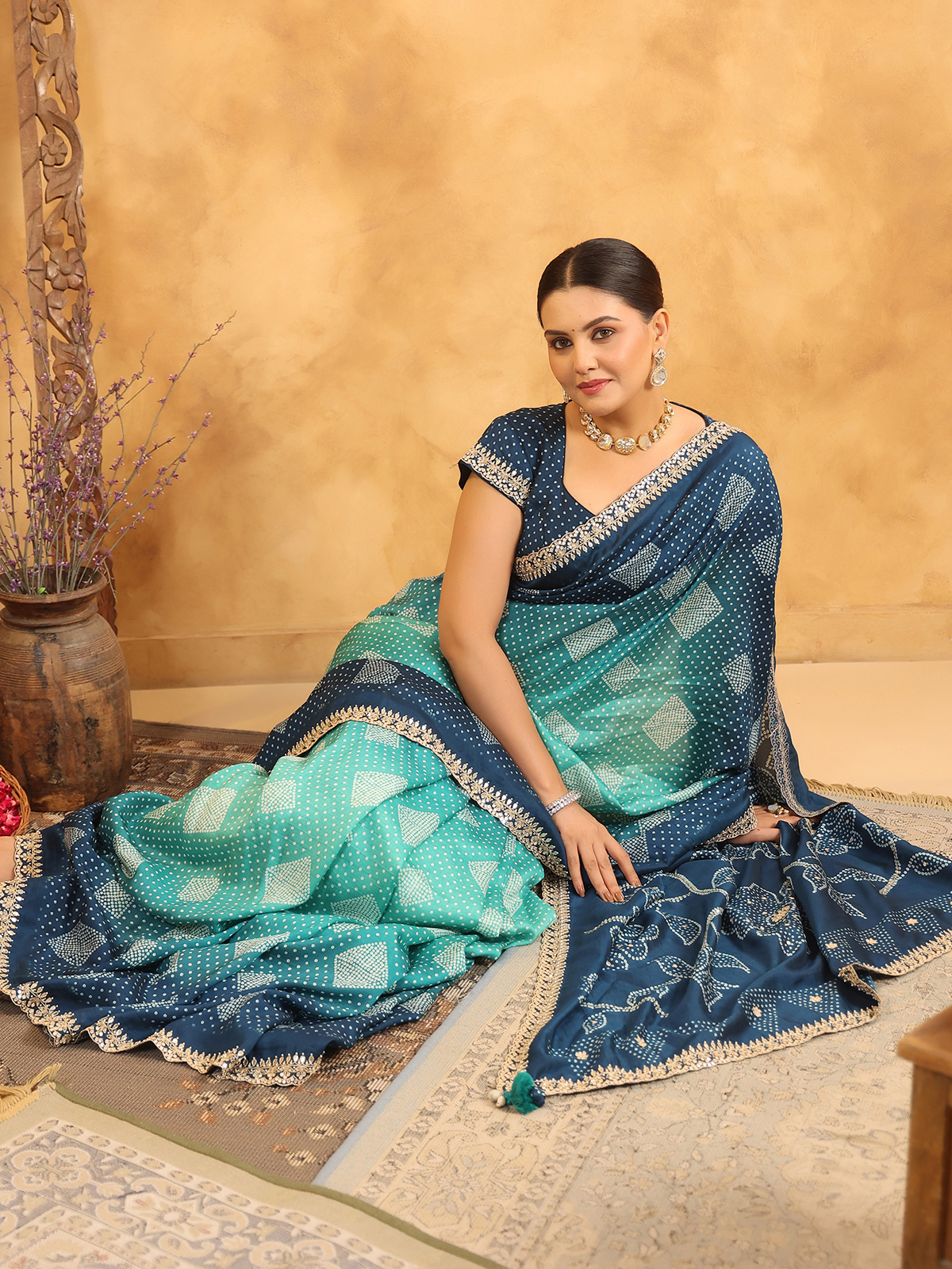 Serene grace moves through the blue silk printed saree, soft and luminous. Resham, gota, beads, cutdana, sequins, and aabla shimmer like jewels. Includes an unstitched blouse piece for weddings and festivals.