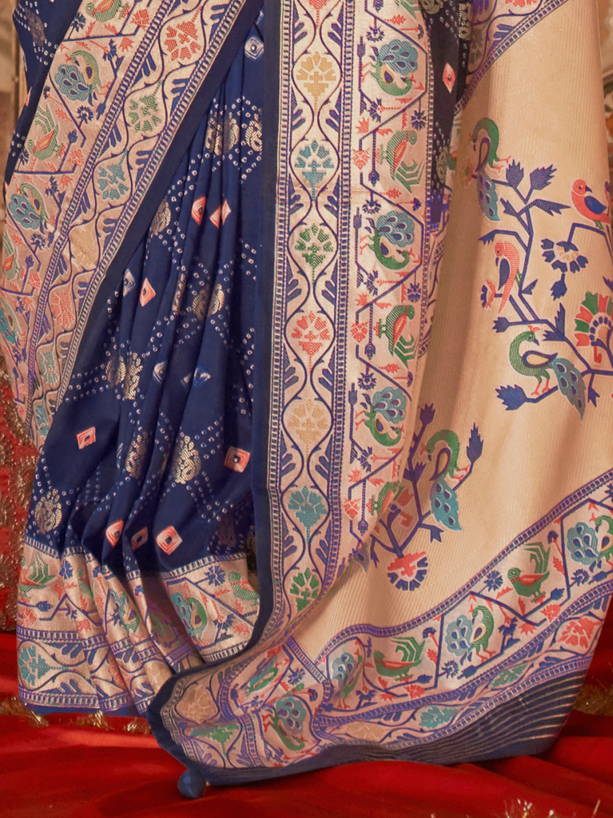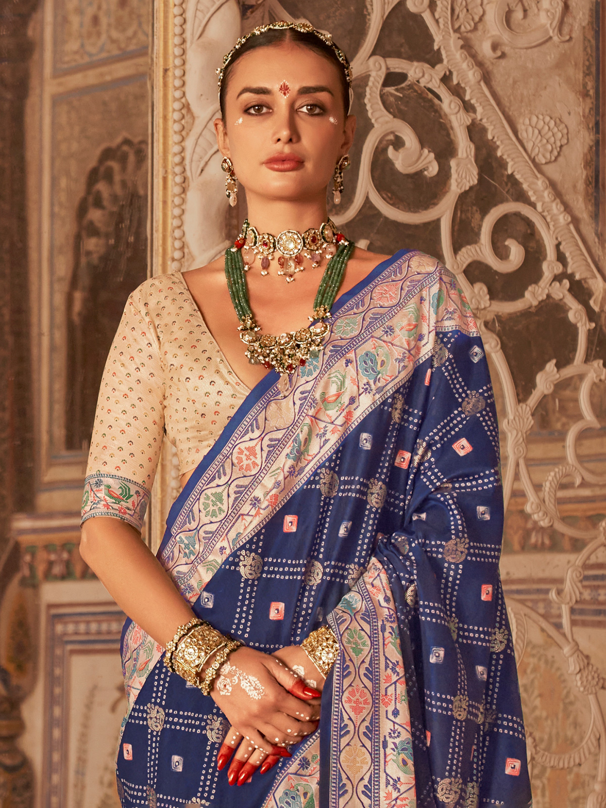 Turn heads in this stunning blue silk saree, adorned with artistic digital prints and shimmering zari detailing. The rich texture and graceful drape make it a perfect pick for festive celebrations or weddings. Includes an unstitched blouse for personalized styling.