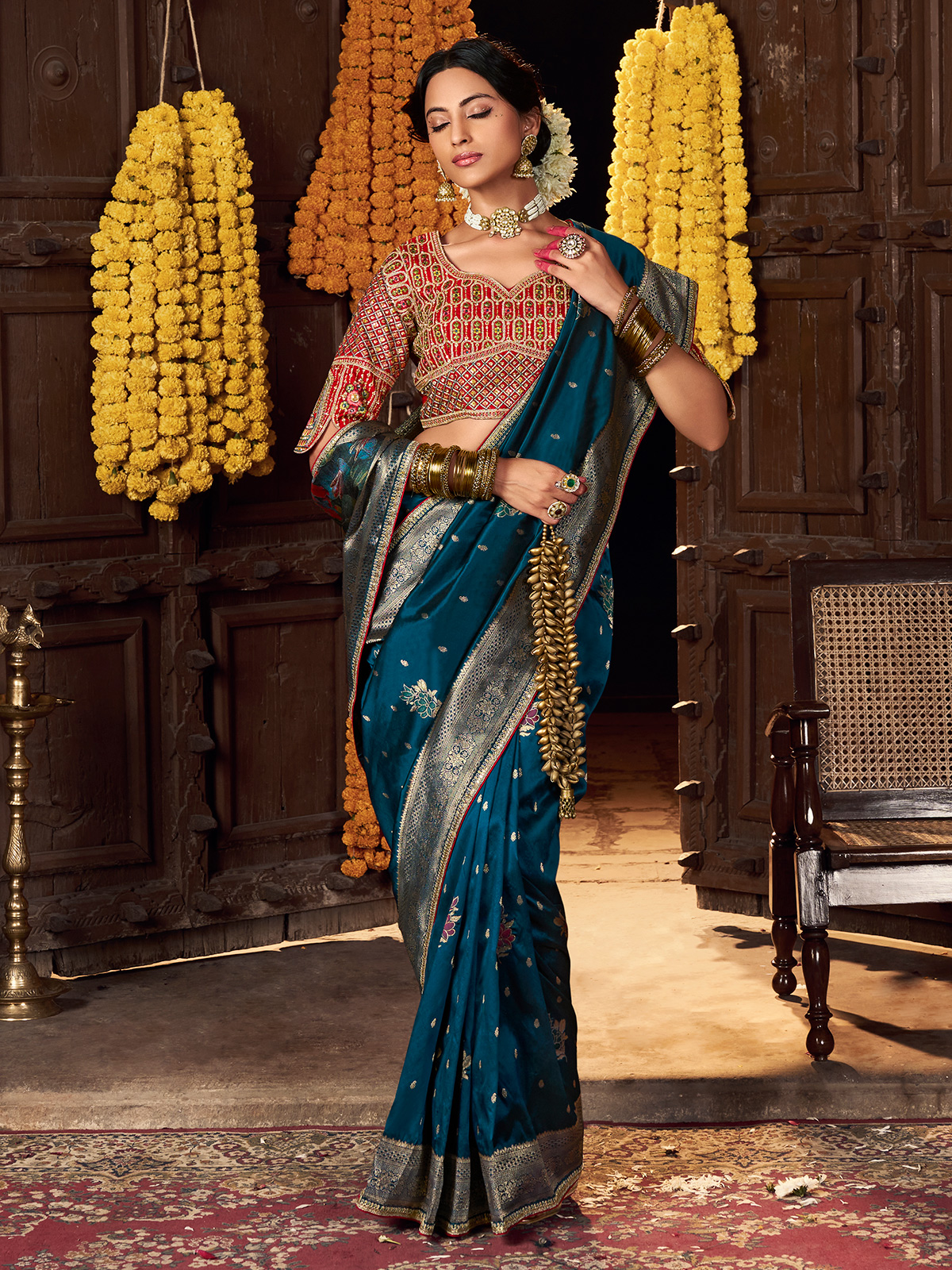 Add a royal touch to your ethnic wardrobe with this gorgeous blue silk saree. Adorned with intricate gold zari work on the saree and borders, and complemented by a rich unstitched blouse with sequin and resham embellishments—ideal for weddings and festivals.
