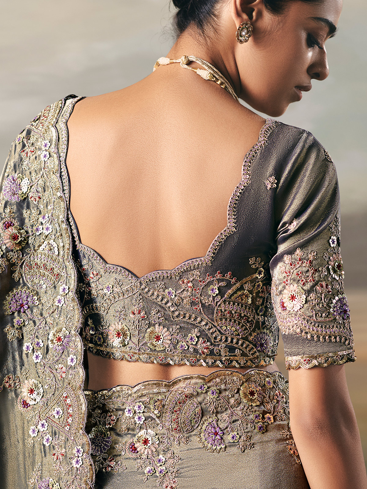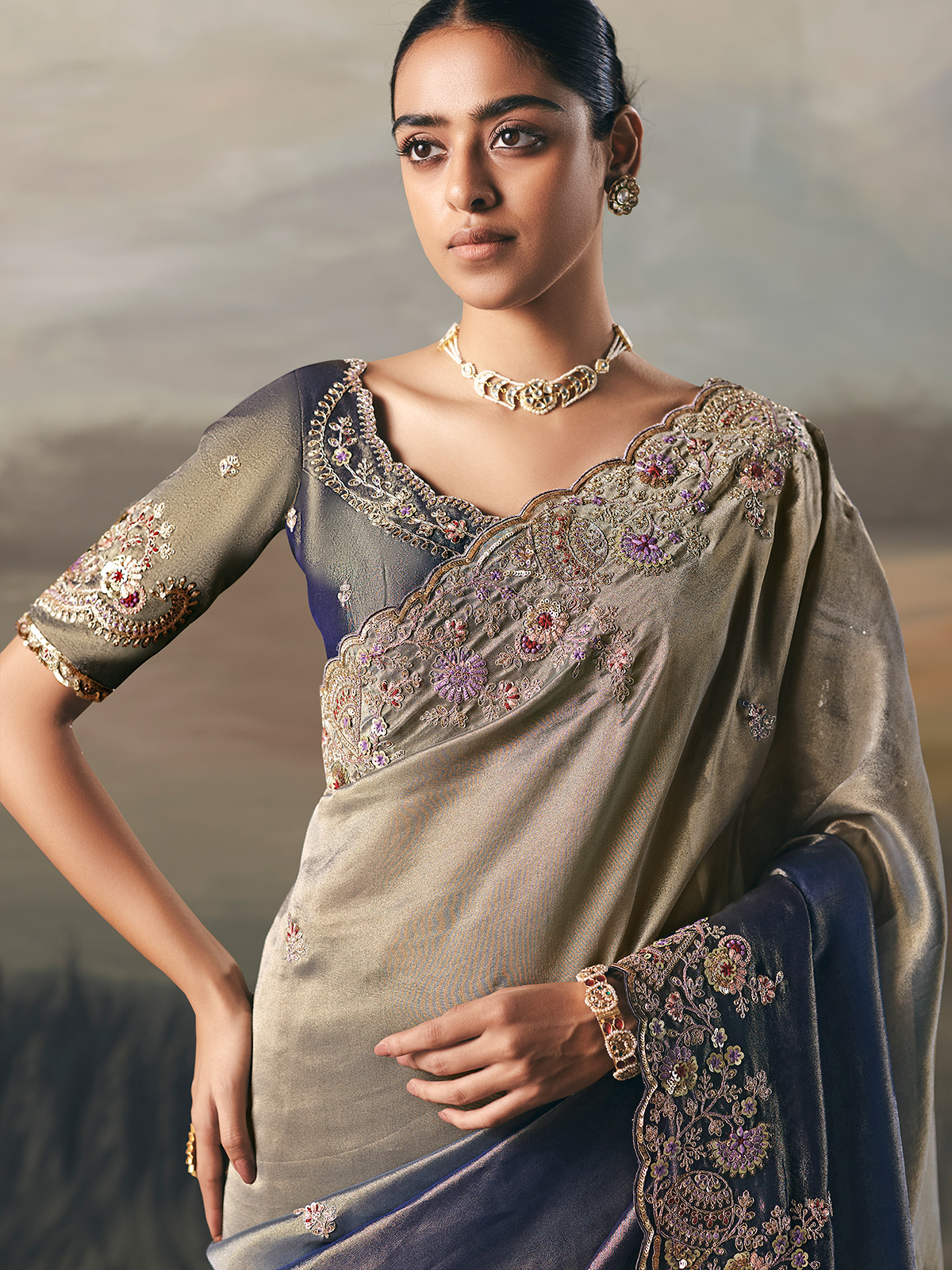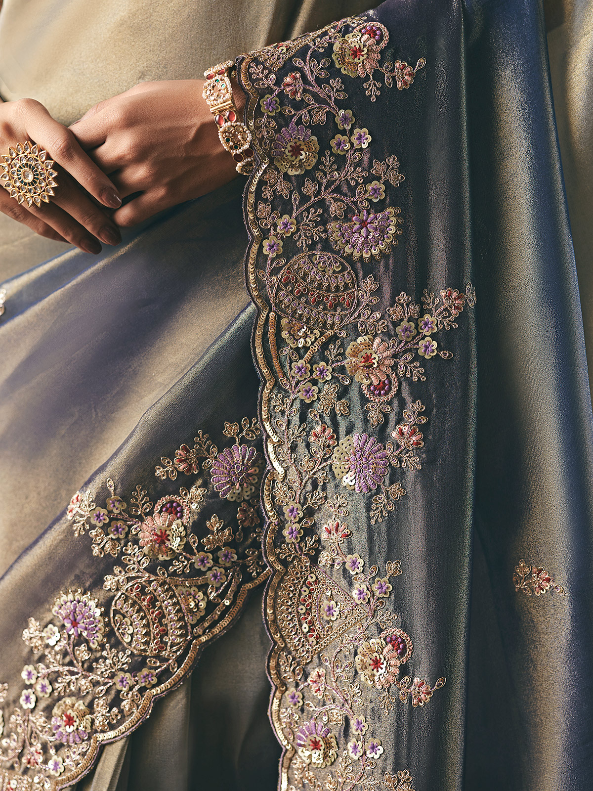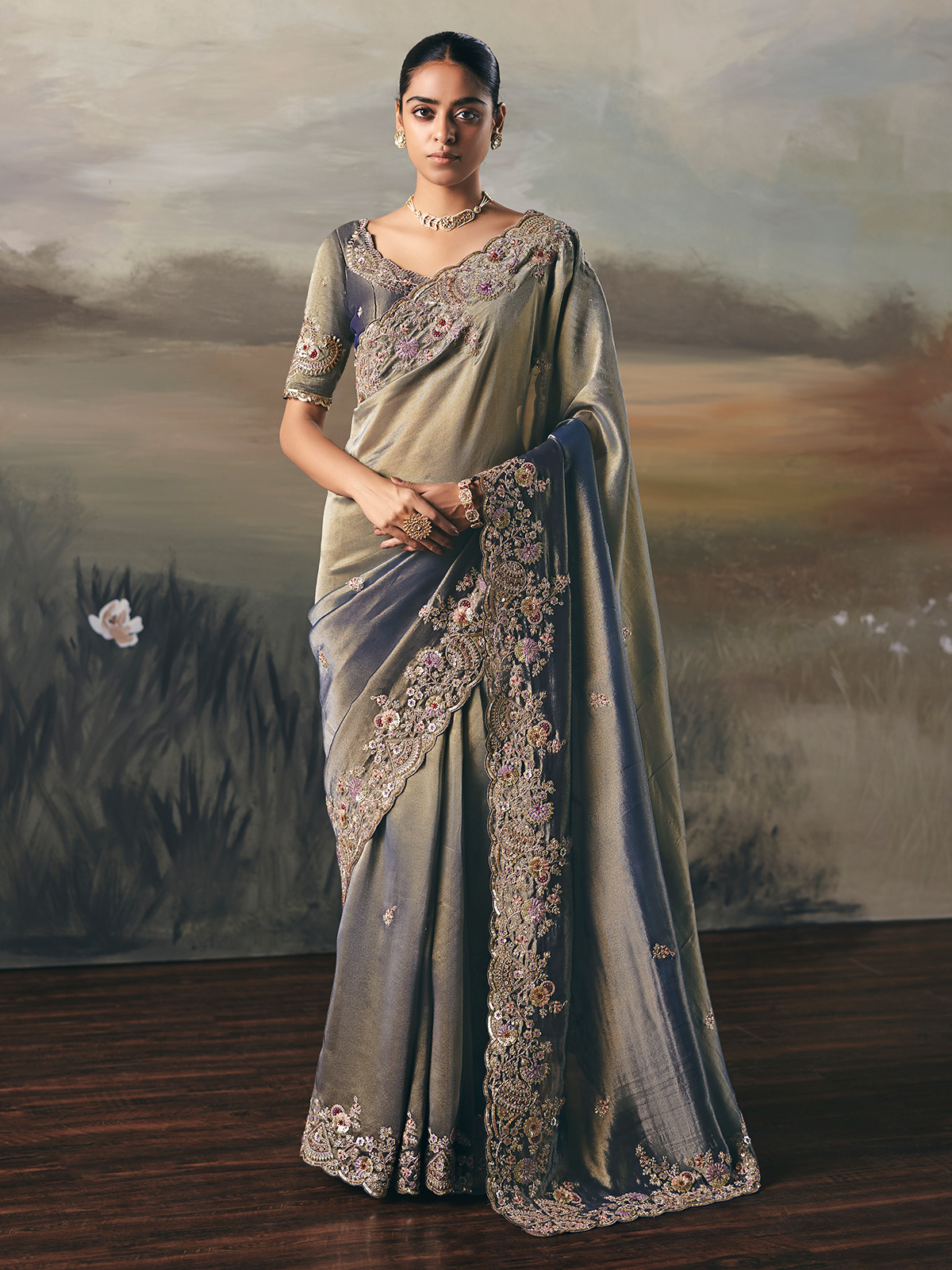 This blue tissue silk saree shines with sequins, stones, zardosi, resham, embroidery, and bead accents. Its magnificently worked border adds depth and richness. Designed for receptions and sangeet, it comes with an unstitched blouse to complete the ensemble.