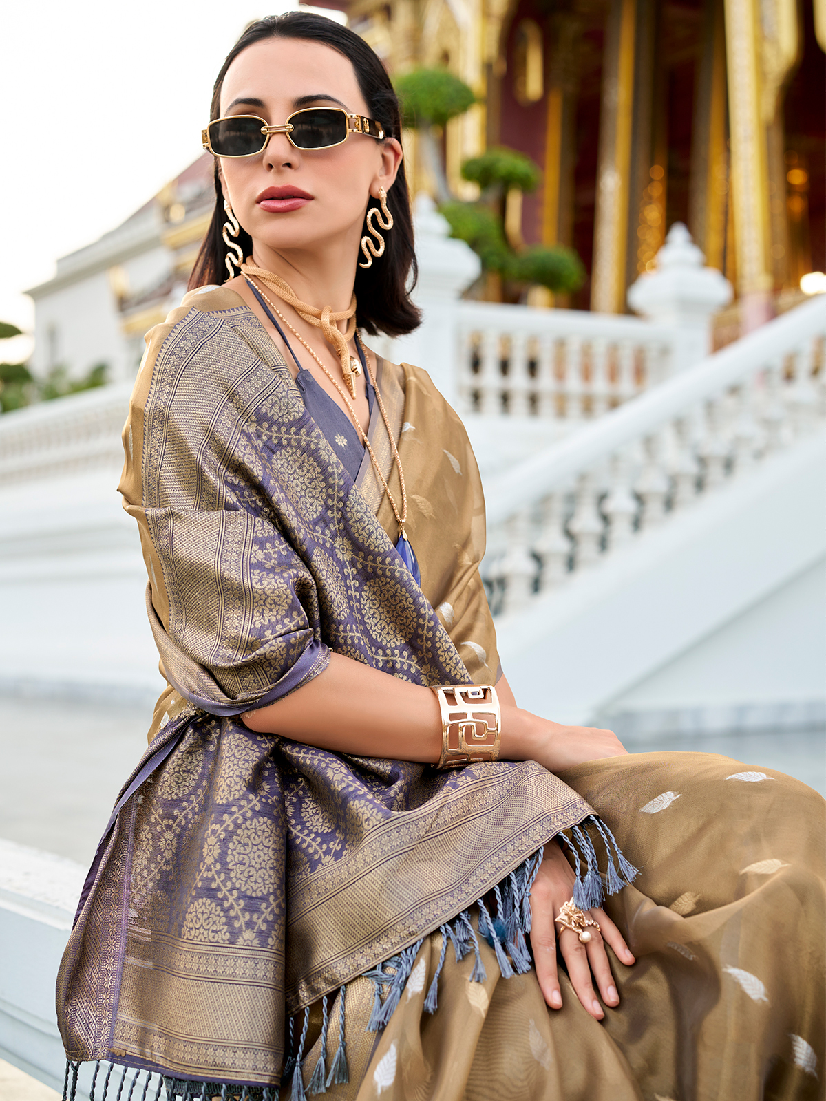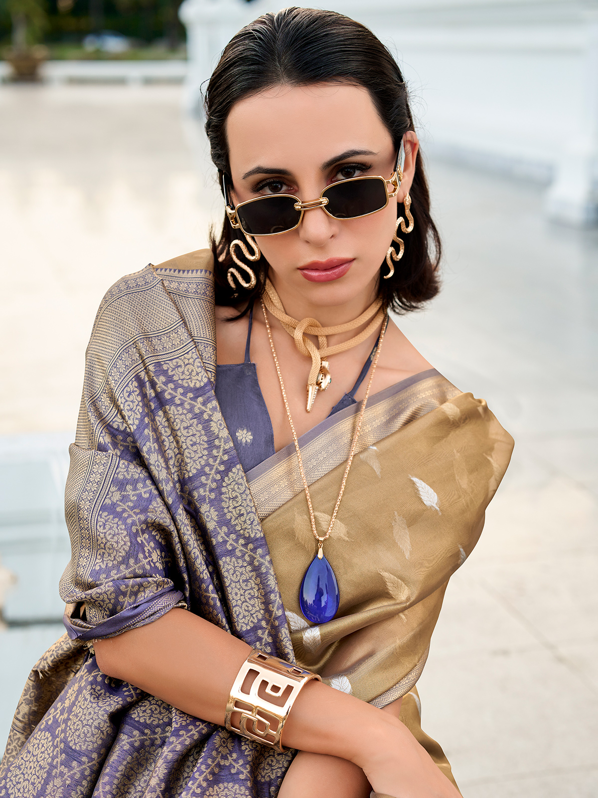 Celebrate timeless beauty in this blue tissue silk saree, woven with radiant golden zari that adds a touch of classic elegance. Ideal for joyful ceremonies and special moments, it includes an unstitched blouse to let your individual style shine.