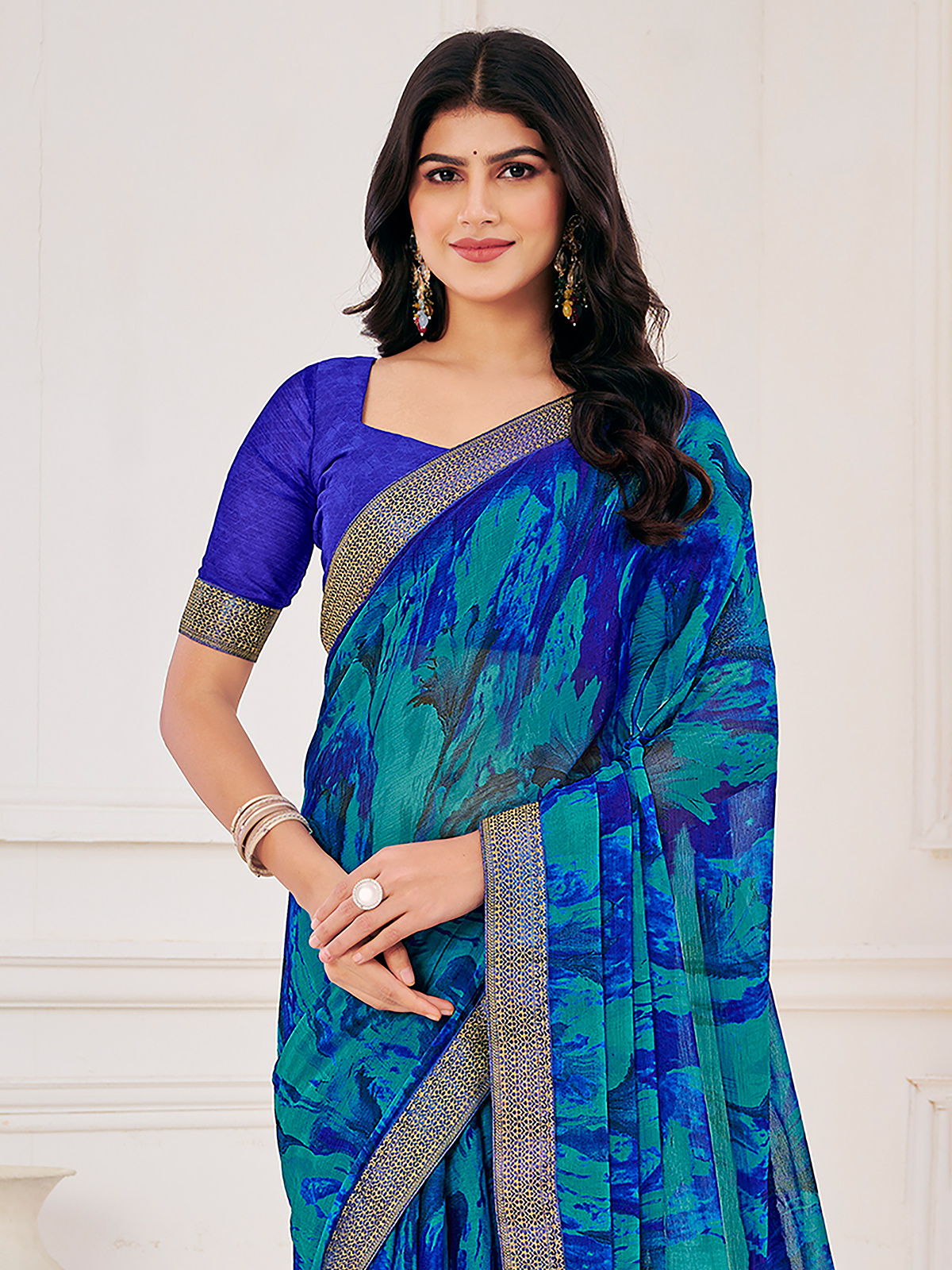 This graceful blue georgette saree showcases refined zari work with timeless printed detailing. Lightweight and flowy, it offers a flattering drape. Comes with an unstitched blouse, making it suitable for casual outings and festive celebrations.