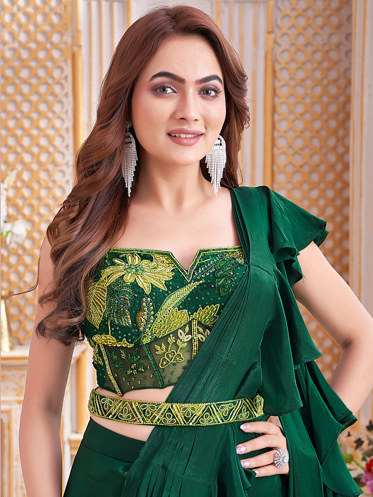 Crafted in luxurious bottle green satin silk ready to wear designer saree is adorned with shimmering cutdana and sequin embellishments. Styled with graceful ruffle detailing and a flattering waist belt, it creates a sculpted silhouette perfect for weddings, receptions and stylish party occasions.
