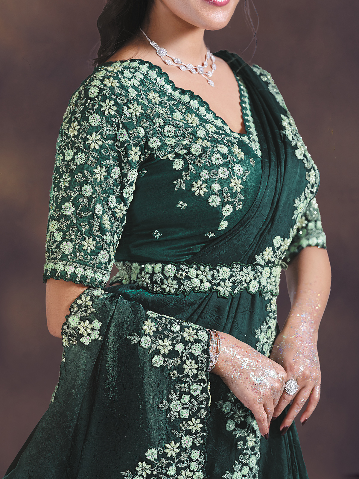 In luxurious bottle green two-tone satin silk, this saree gleams with embroidery, sequins, diamond, and stone detailing. The waist belt highlights its regal silhouette, making it a perfect pick for weddings and evening galas.