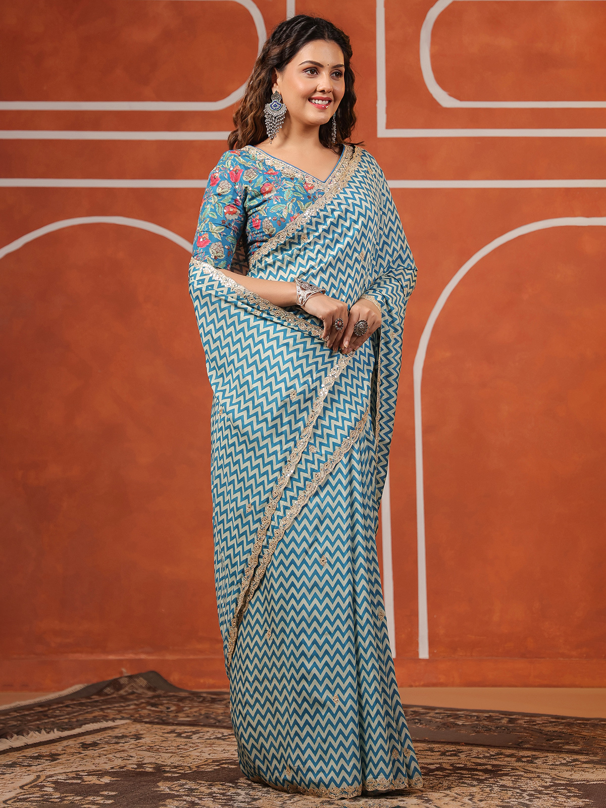Elevate festive moments with our bright blue muslin saree collection, highlighted with mirror, gota, and resham work. Comes with a ready made blouse.