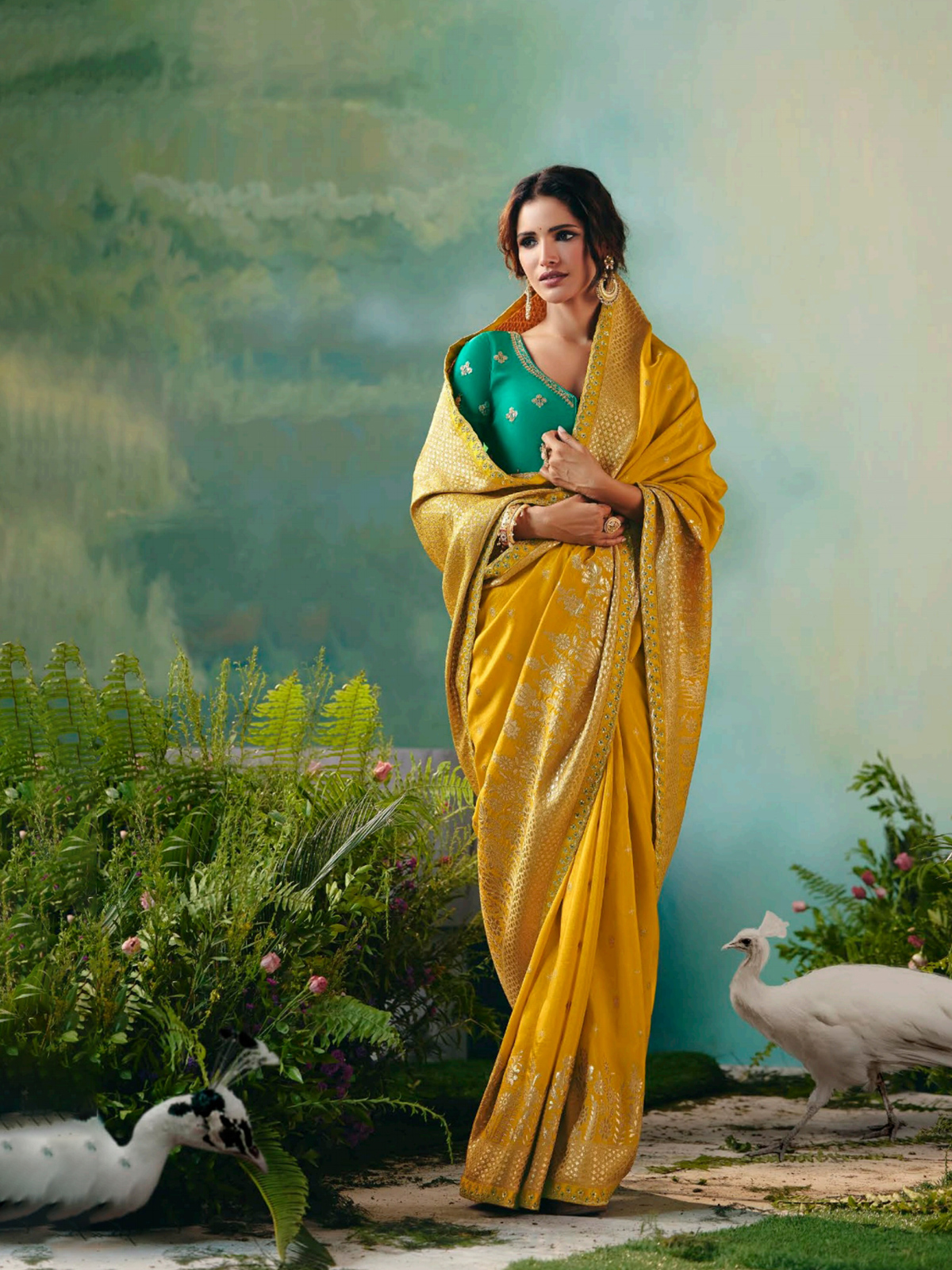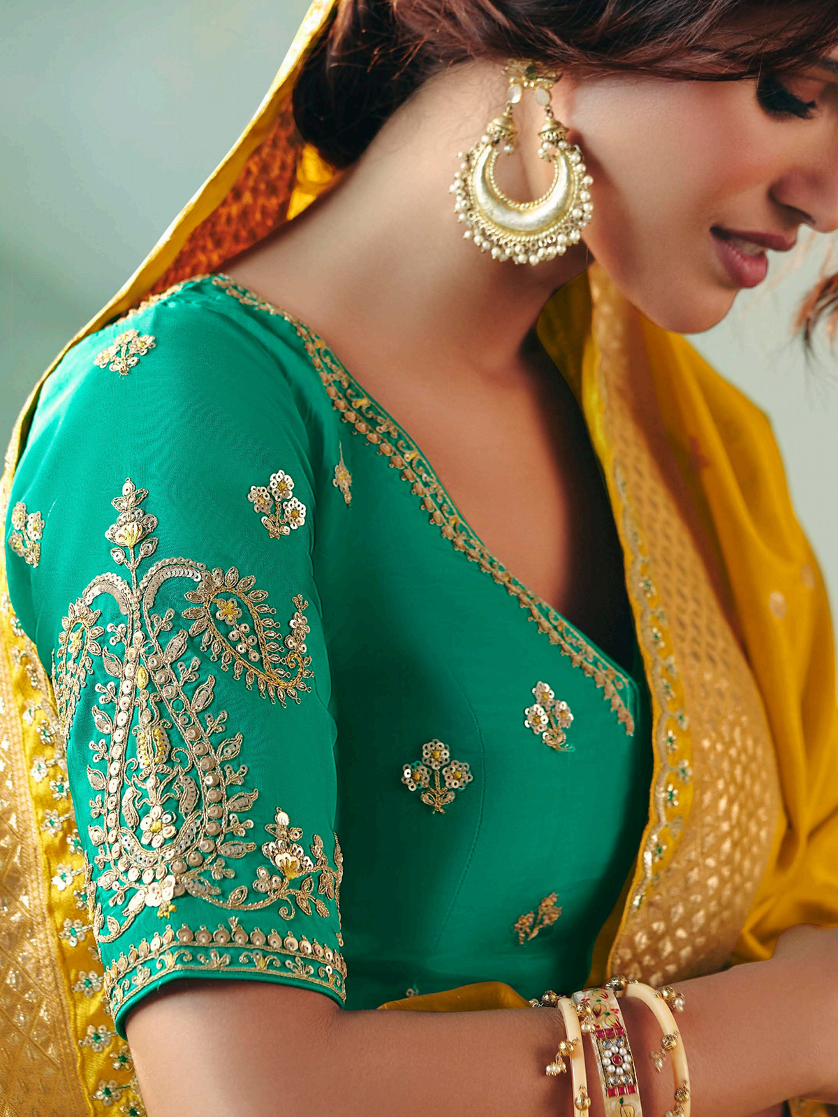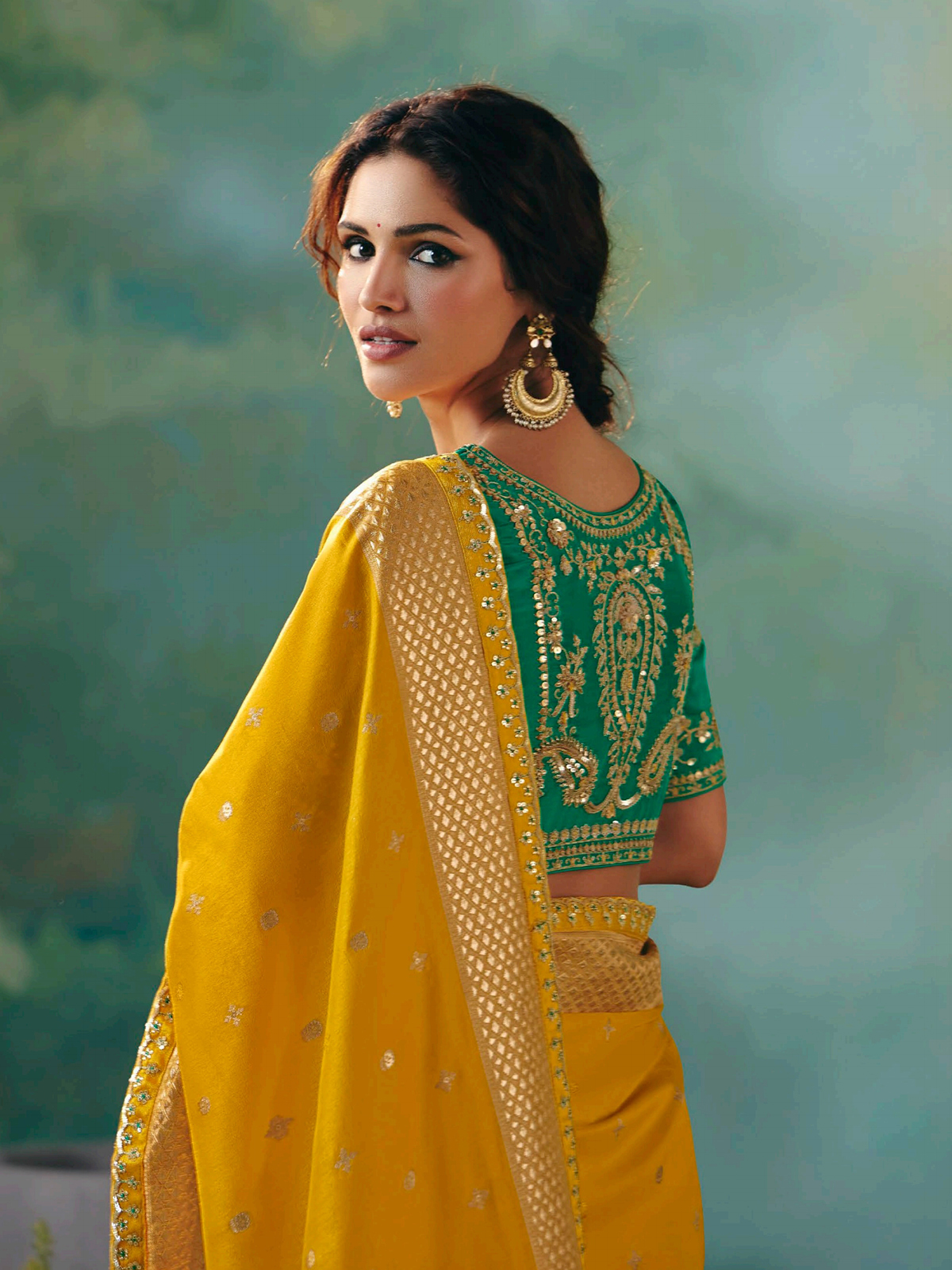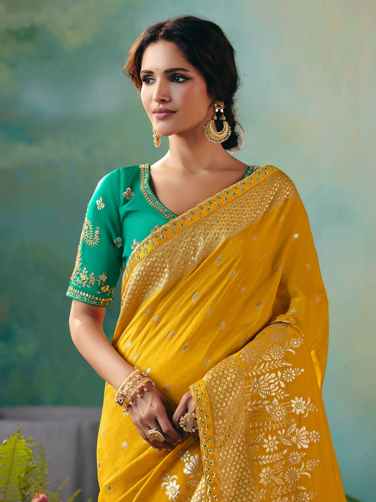 This bright mustard yellow viscose dola silk saree sparkles with resham, thread, zari, and sequins work. Perfect for mehendi and festive weddings, it radiates joy and elegance. Includes an unstitched blouse piece to let you tailor your own stunning ensemble.