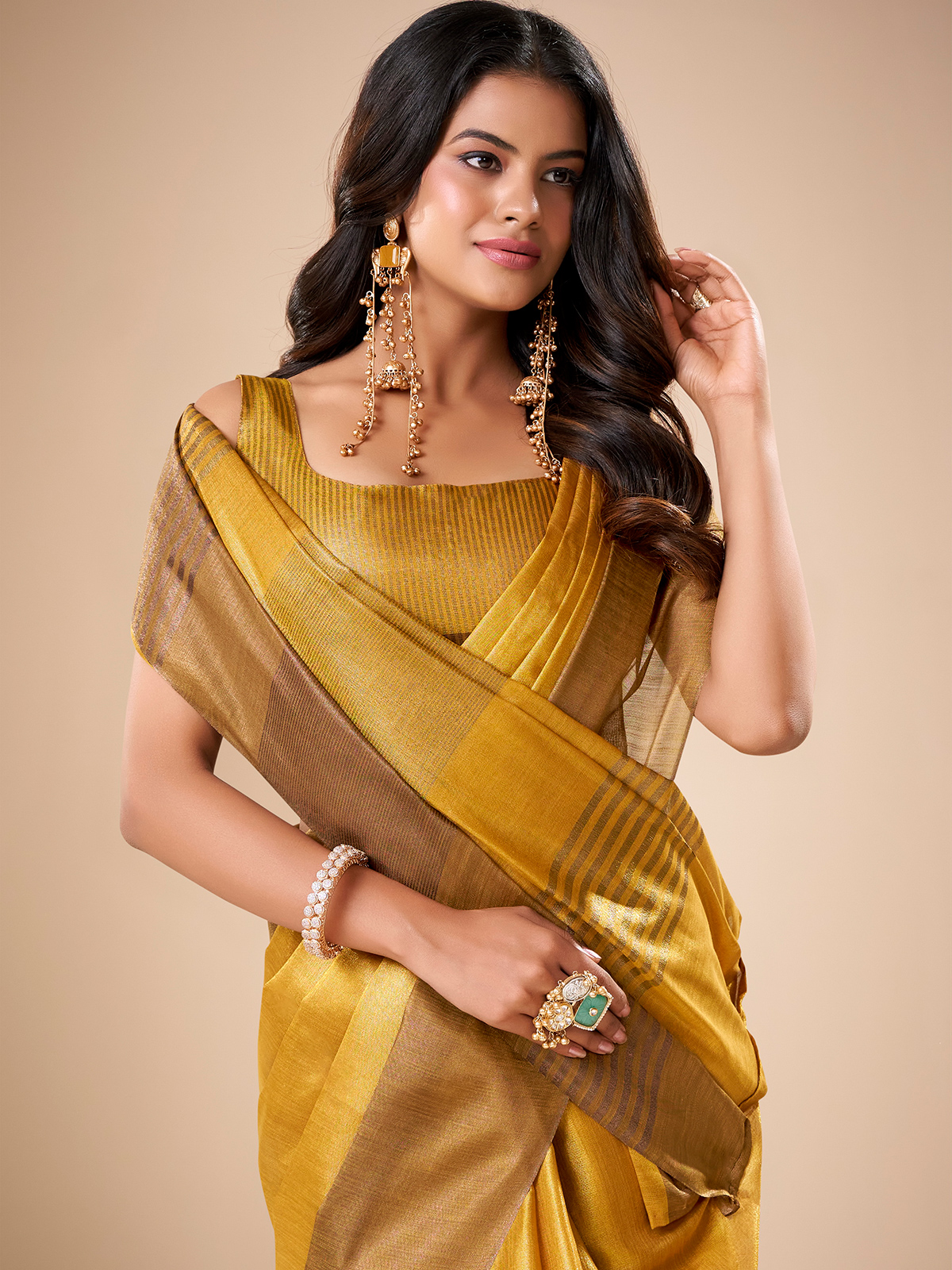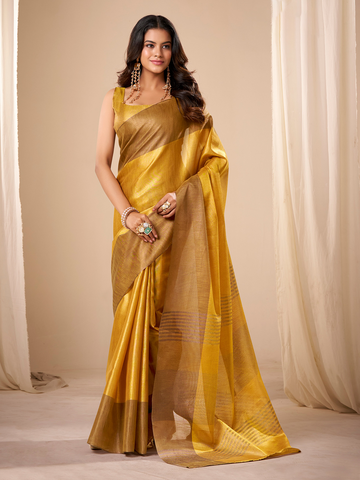 Designed in bright yellow tissue silk, this saree is adorned with elegant zari work that radiates festive charm. Paired with an unstitched blouse piece, it drapes effortlessly, making it a beautiful pick for weddings, haldi functions, sangeet celebrations and joyful festive occasions.