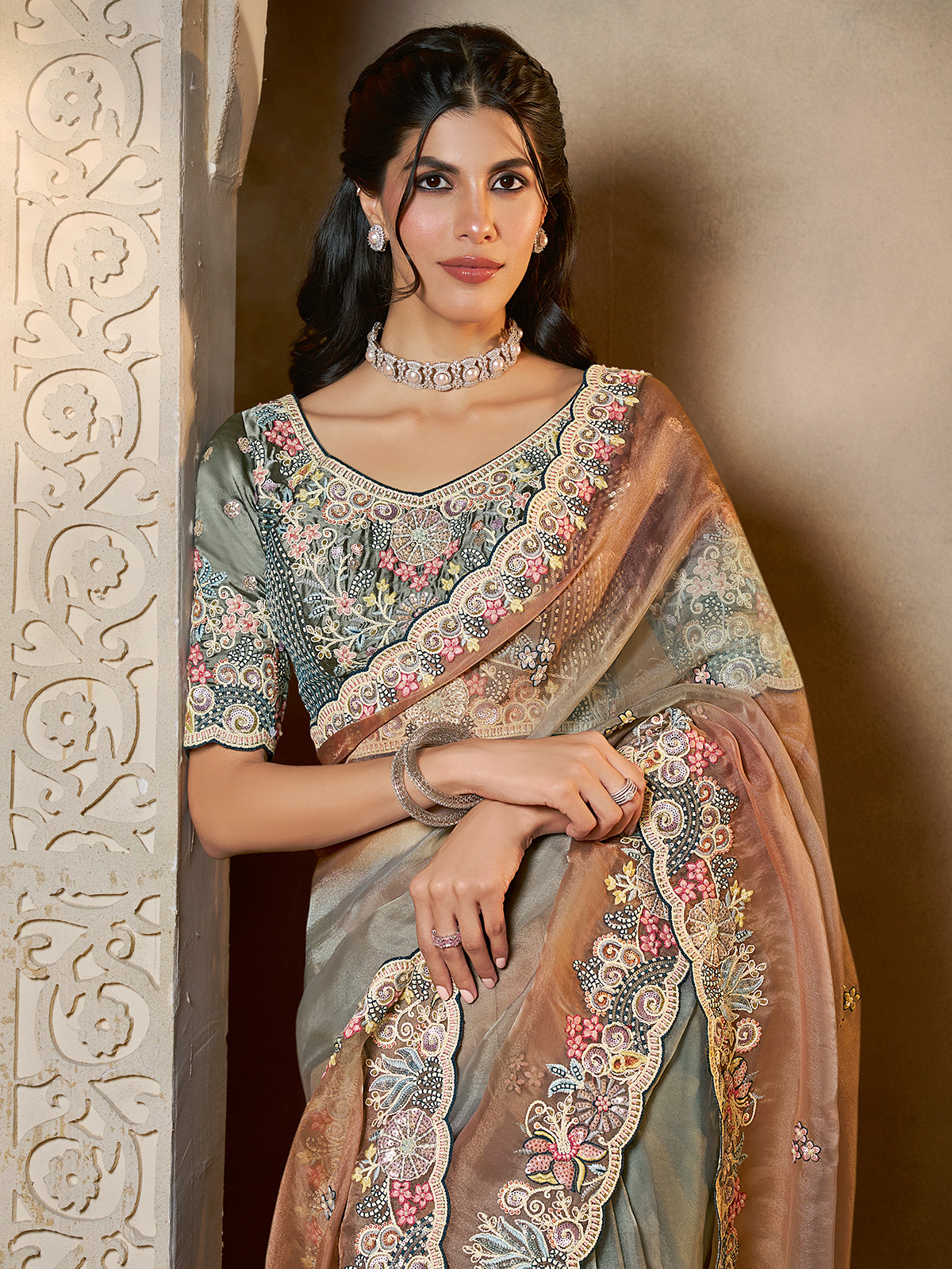 Brown And Grey Shaded Organza Satin Saree Of Dual Grace