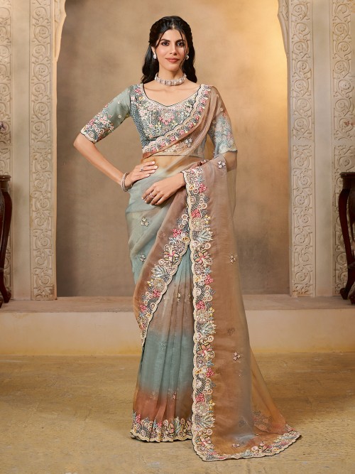 This shaded brown and grey organza satin saree exudes elegance with embroidery, sequins, and pearl detailing. The soft color gradient adds a modern flair to festive and party ensembles. Comes with an unstitched blouse piece.
