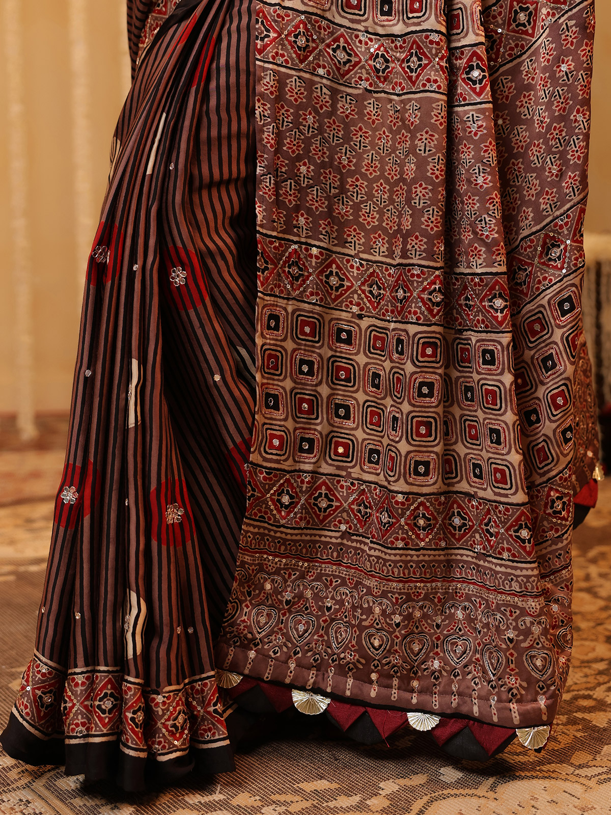 Brown Cotton Silk Printed Saree With Sequins Work For Women