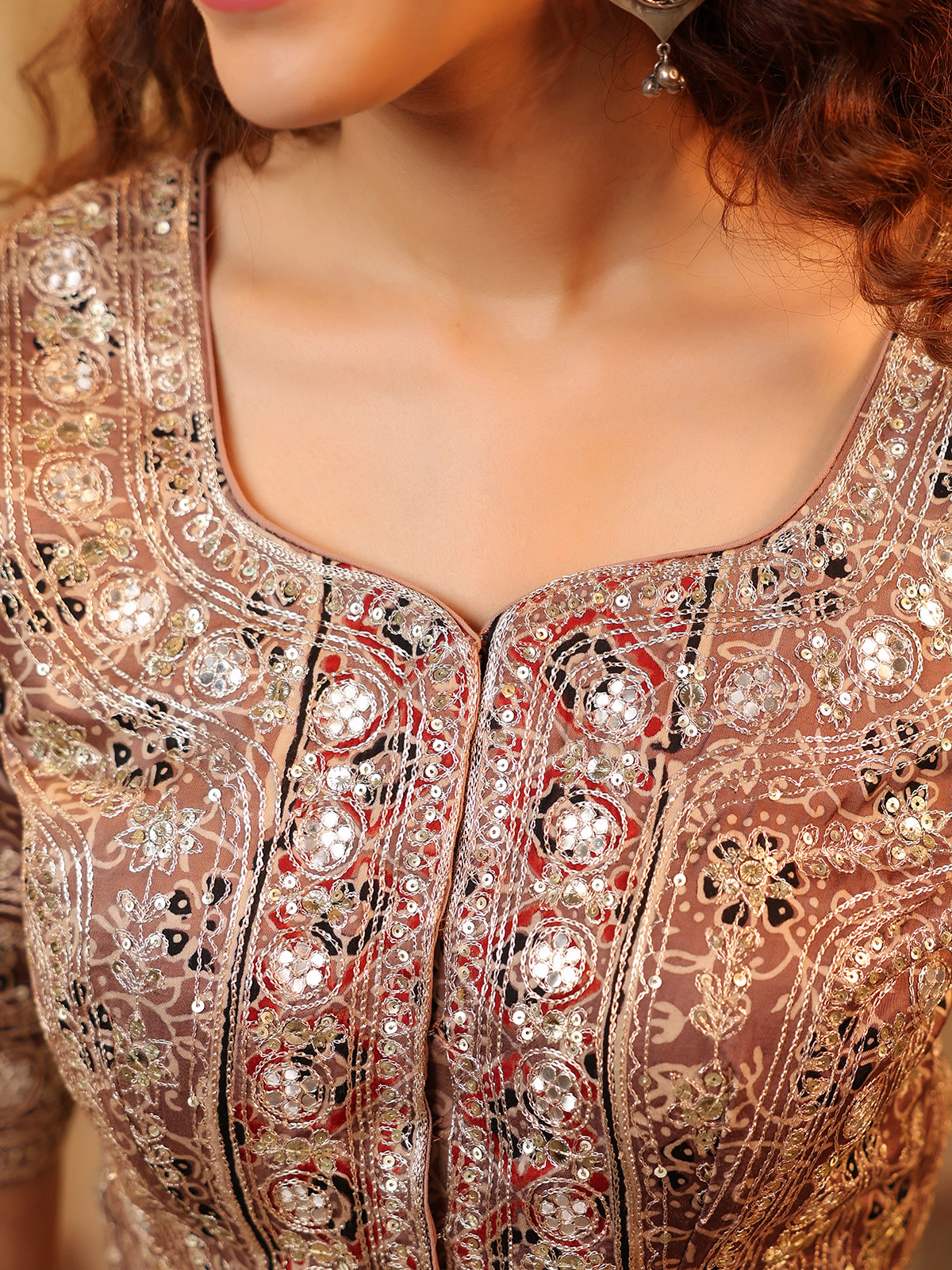 An earthy brown cotton silk printed saree glows softly with resham, sequins, and mirror work, evoking understated festive charm. Enhanced by a readymade blouse, it carries heritage beauty with natural grace. Ideal for cultural gatherings, it flows effortlessly with quiet radiance, creating a timeless celebration of tradition.