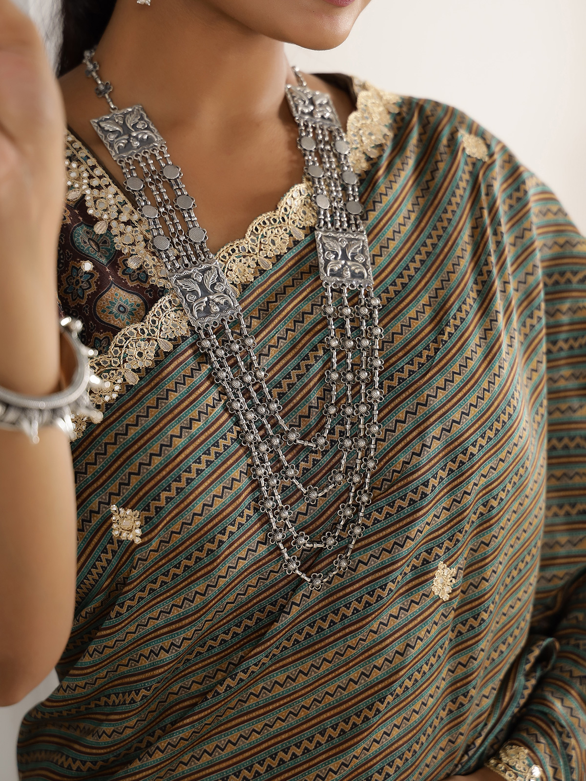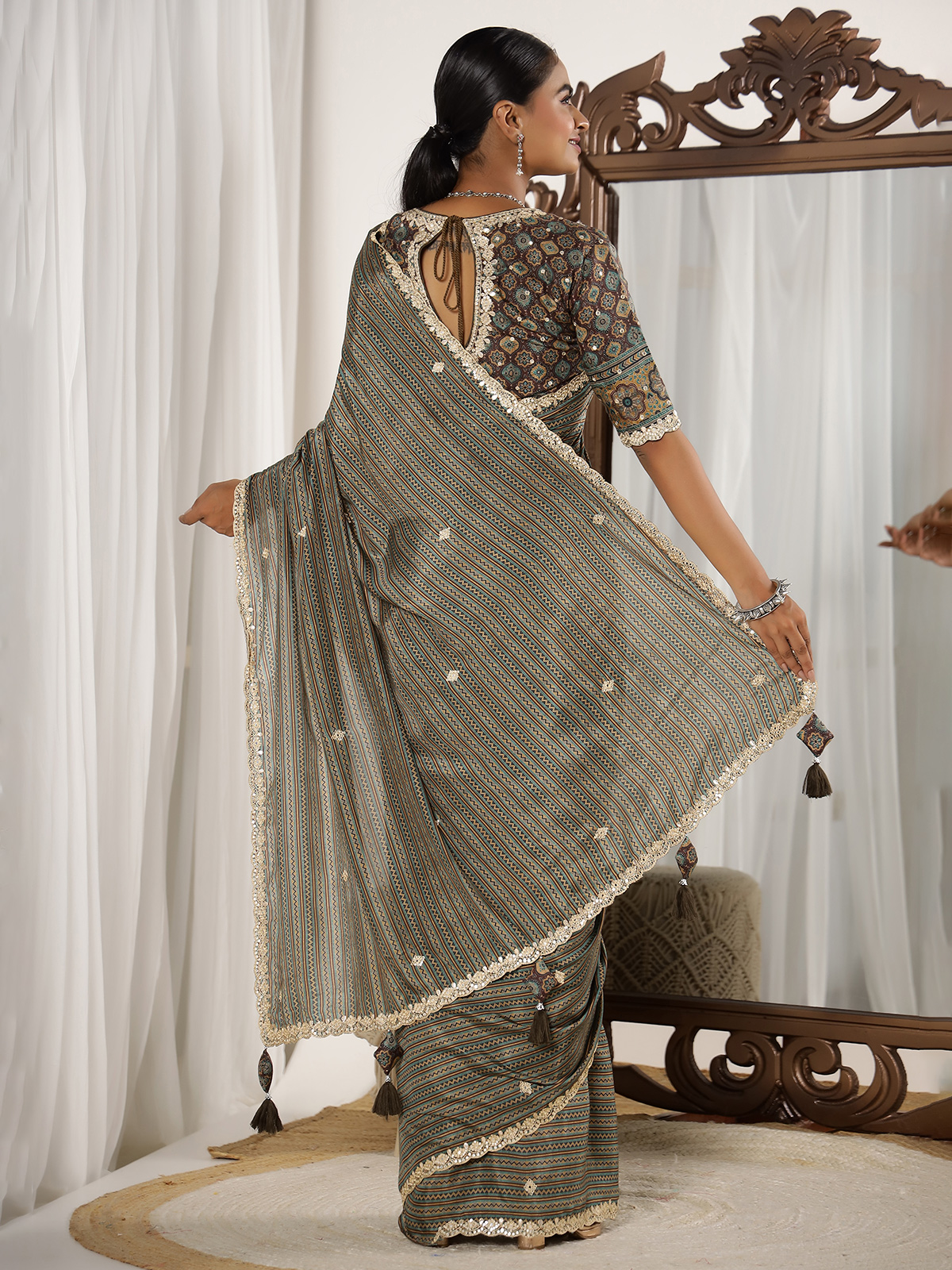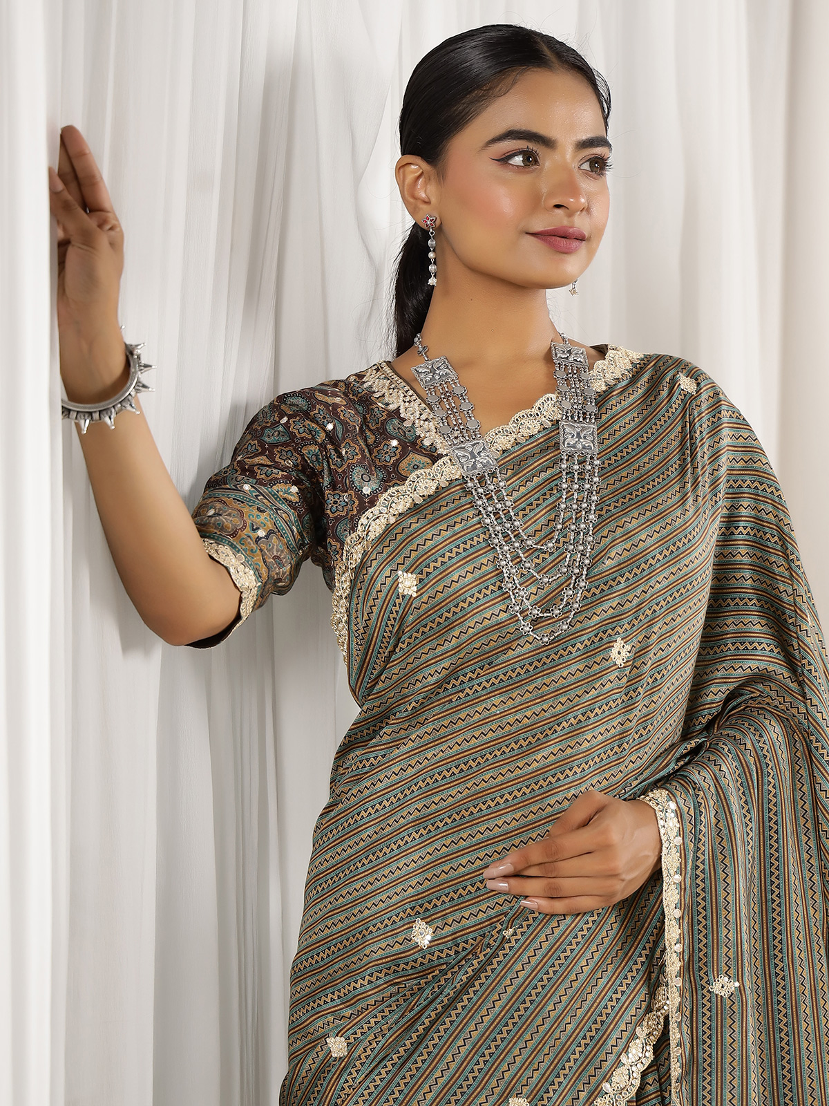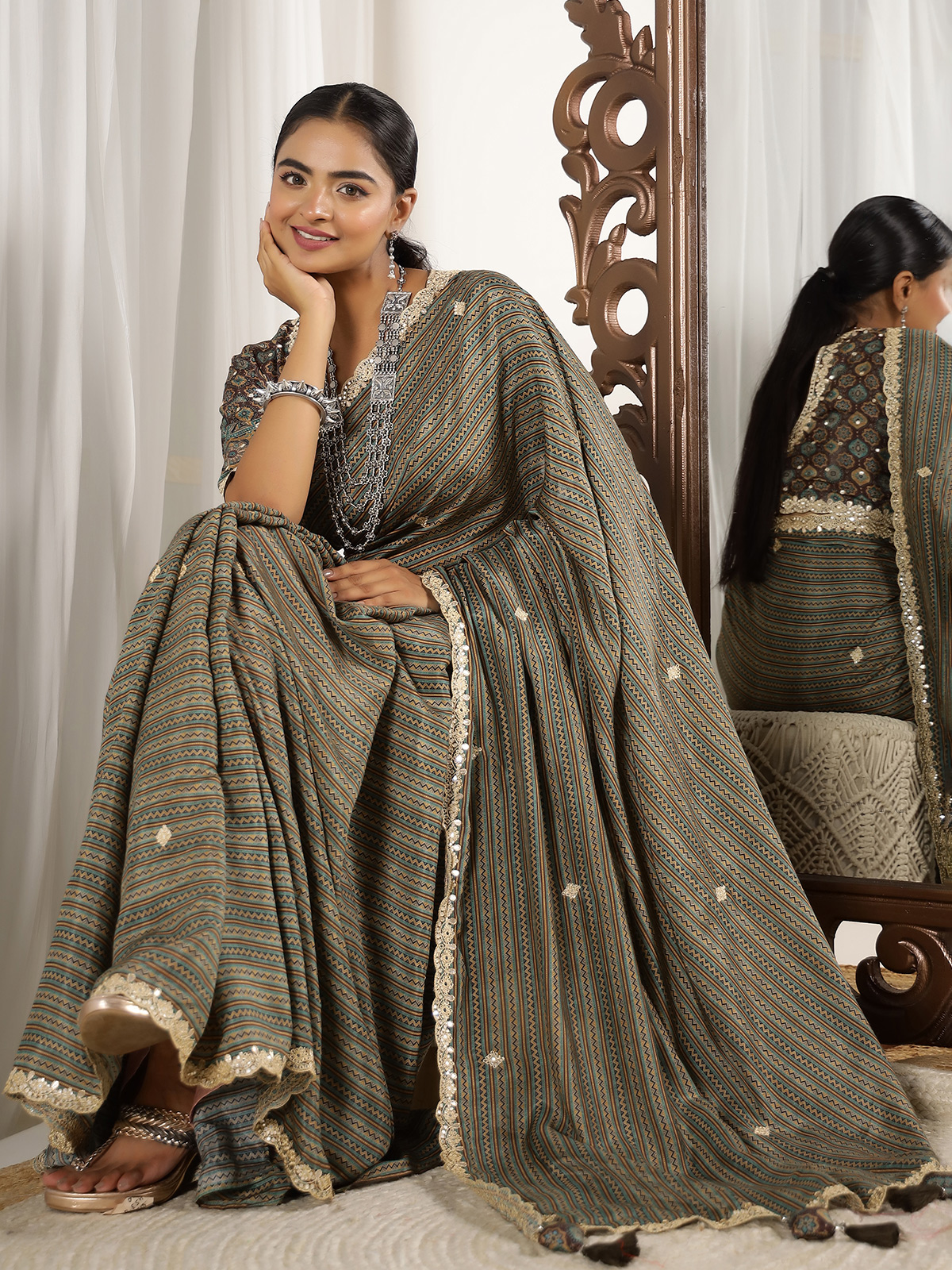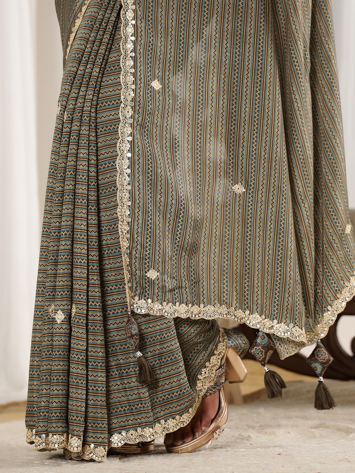Turn heads with the bold brown muslin saree, accentuated by chic mirror, gota, and resham detailing. Includes a ready made blouse.