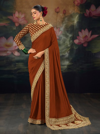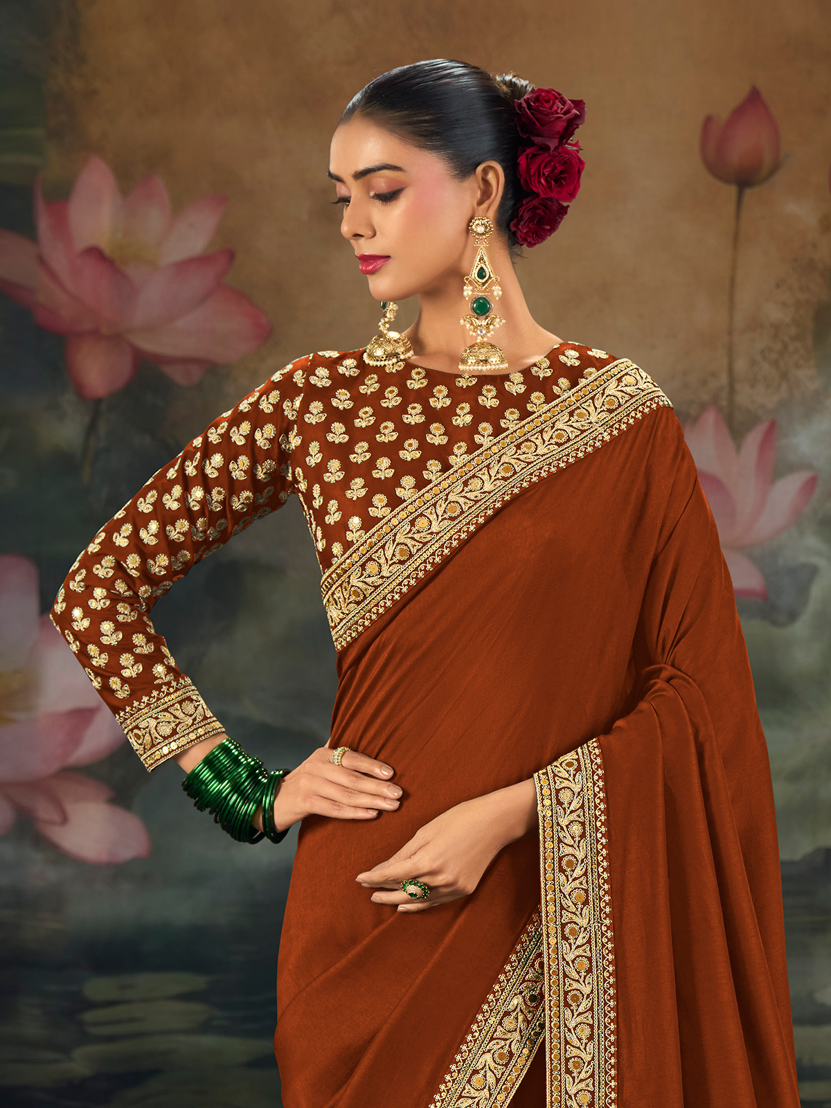 Elegant and regal, this brown saree offers a luxurious festive appeal. Designed in smooth pure munga silk with a soft sheen, it features a bold golden border enhanced with delicate resham and sequin floral work. A heavily embroidered unstitched blouse with classic gold buttis makes it perfect for weddings and celebrations.