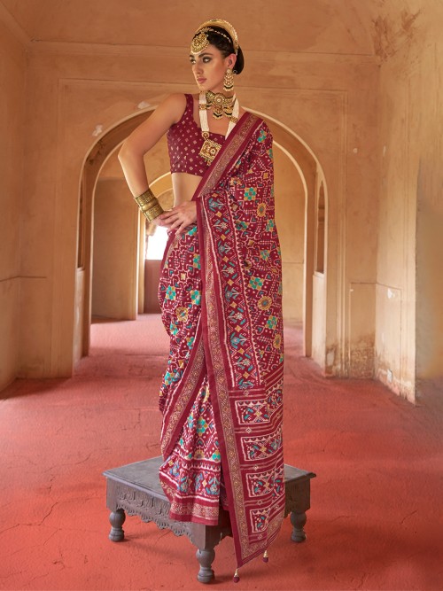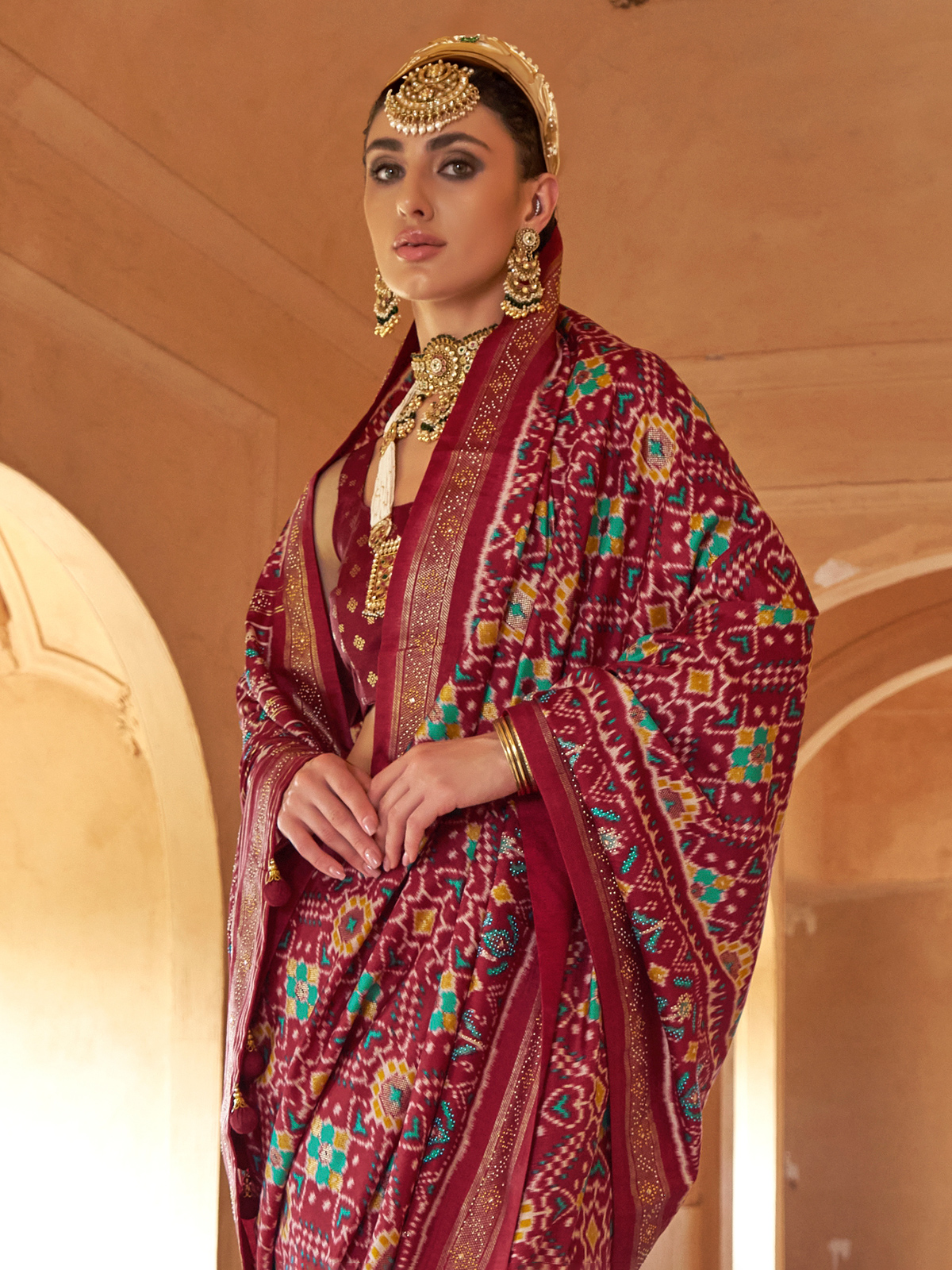This deep brown patola silk saree exudes understated charm with its detailed ikkat design and ornate lace-stone border. Lightweight and elegant, it comes with a matching blouse and is perfect for adding sophistication to festive occasions.