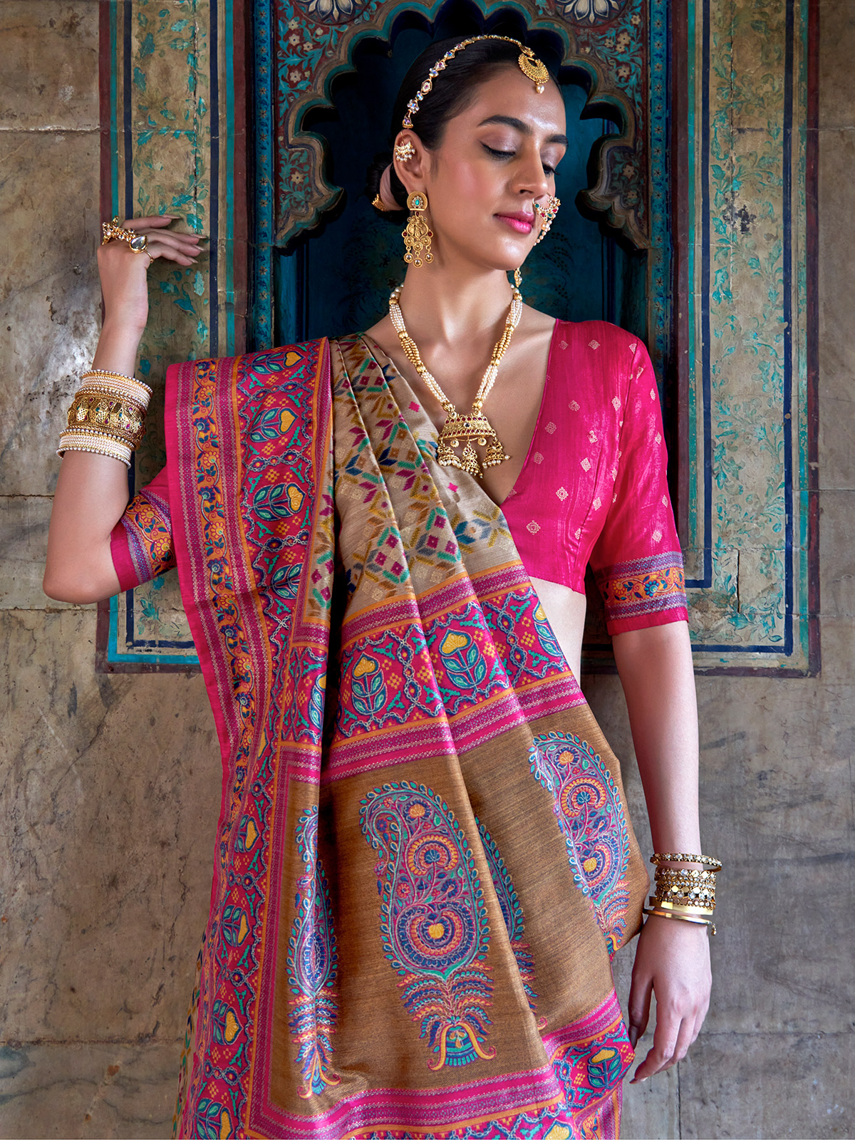 This brown and pink silk saree features an artistic glory finish print that adds depth and elegance. Designed for weddings, receptions, sangeet ceremonies, and festive occasions, it drapes beautifully and feels luxe. Includes an unstitched blouse to complement the saree’s sophisticated appeal.