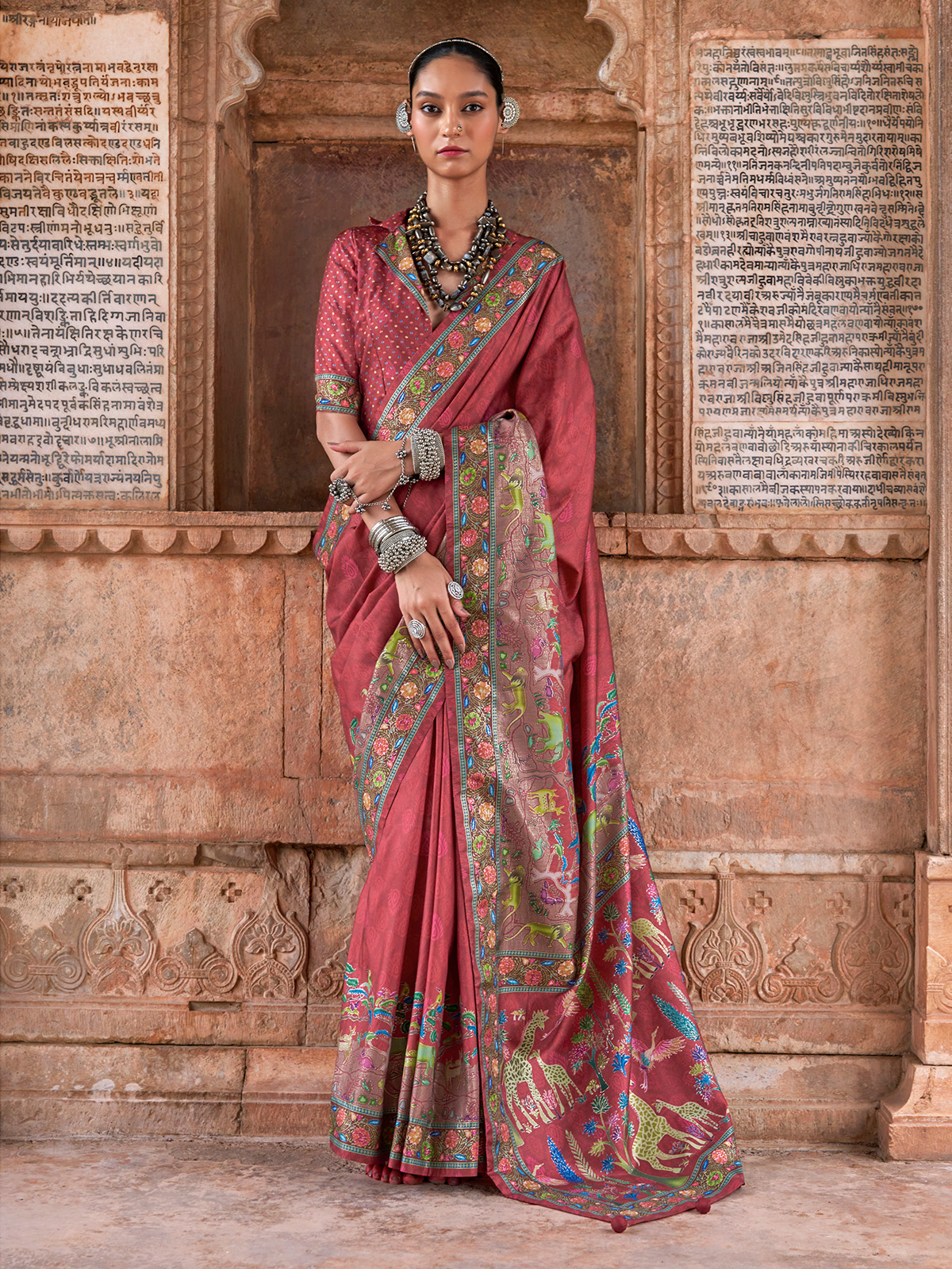 This brown silk saree carries the warmth of earth after rain, gentle and grounded. Printed designs stir memories like fallen leaves in a soft breeze. It comes with an unstitched blouse piece, crafted for festive days and timeless traditions.
