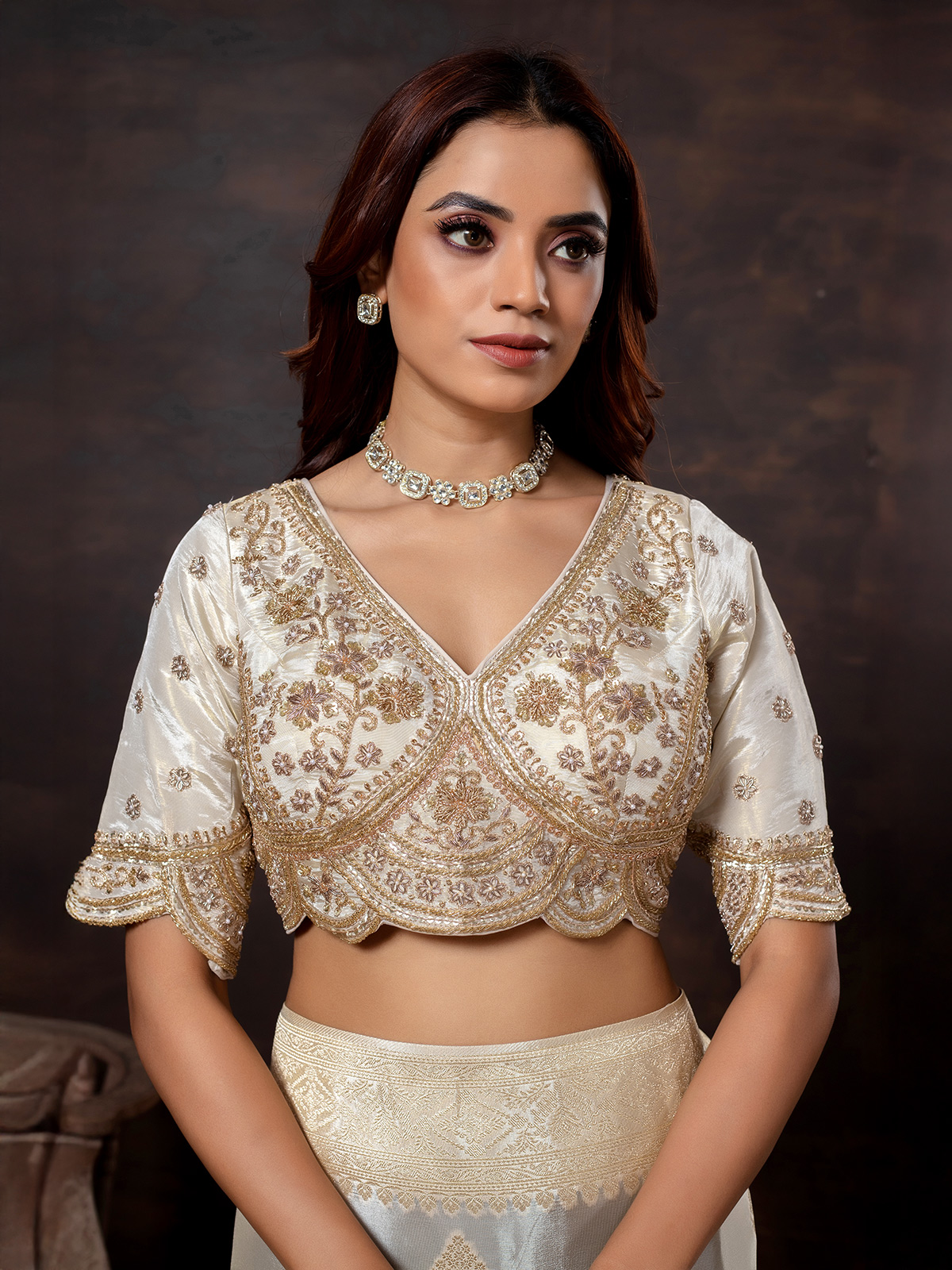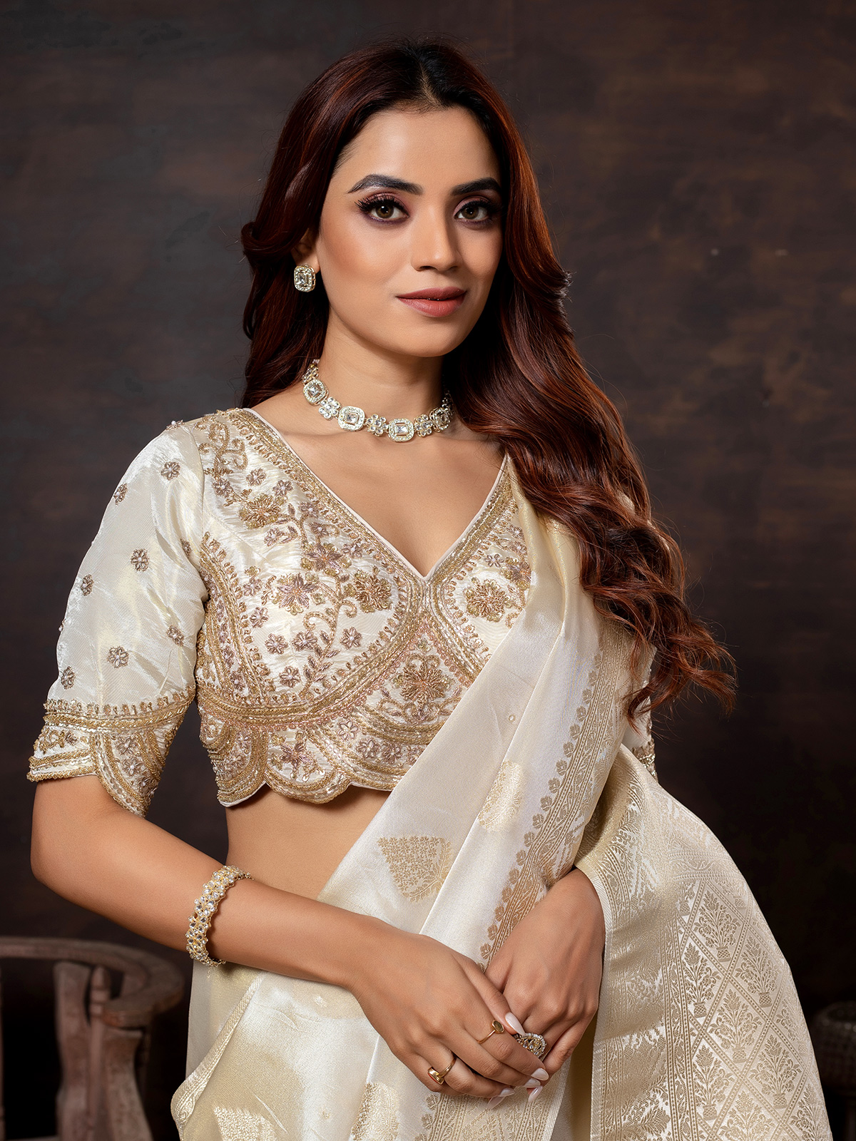 Timeless in appeal, this off-white dola silk saree shines with embellishments of beads, sequins, cutdana, zardosi, resham, and zari. The sleeveless V-neck blouse adds a modern touch, enhancing the grandeur of the traditional work. Perfect for weddings and festive gatherings, this saree drapes beautifully, reflecting grace with understated sophistication. Its versatile hue makes it an essential choice for women seeking an elegant ensemble that blends charm, refinement, and luxury seamlessly.