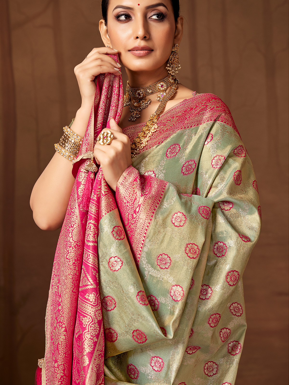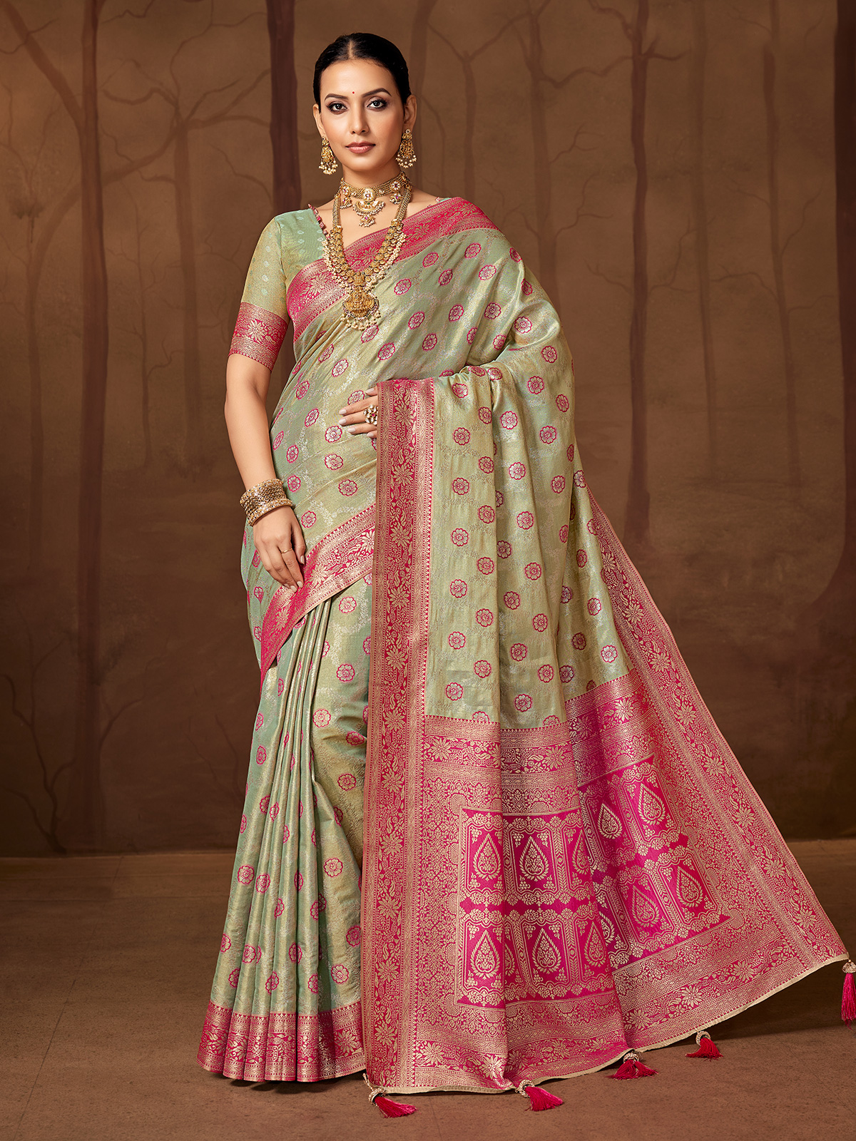 This pista green silk saree captivates with fine floral motifs across the body and beautifully crafted meena floral patterns on the border and pallu. Extensive zari detailing adds a brilliant metallic glow, enhancing its festive allure. Paired with an unstitched blouse, it is perfect for weddings, sangeet, reception and mehndi occasions.
