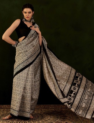 Chic Beige Bhagalpuri Silk Saree Featuring Beautiful Prints