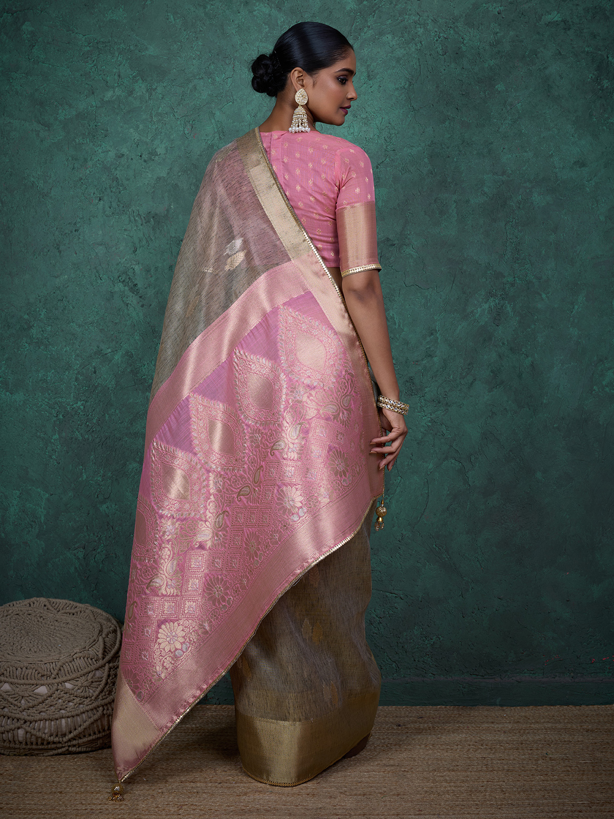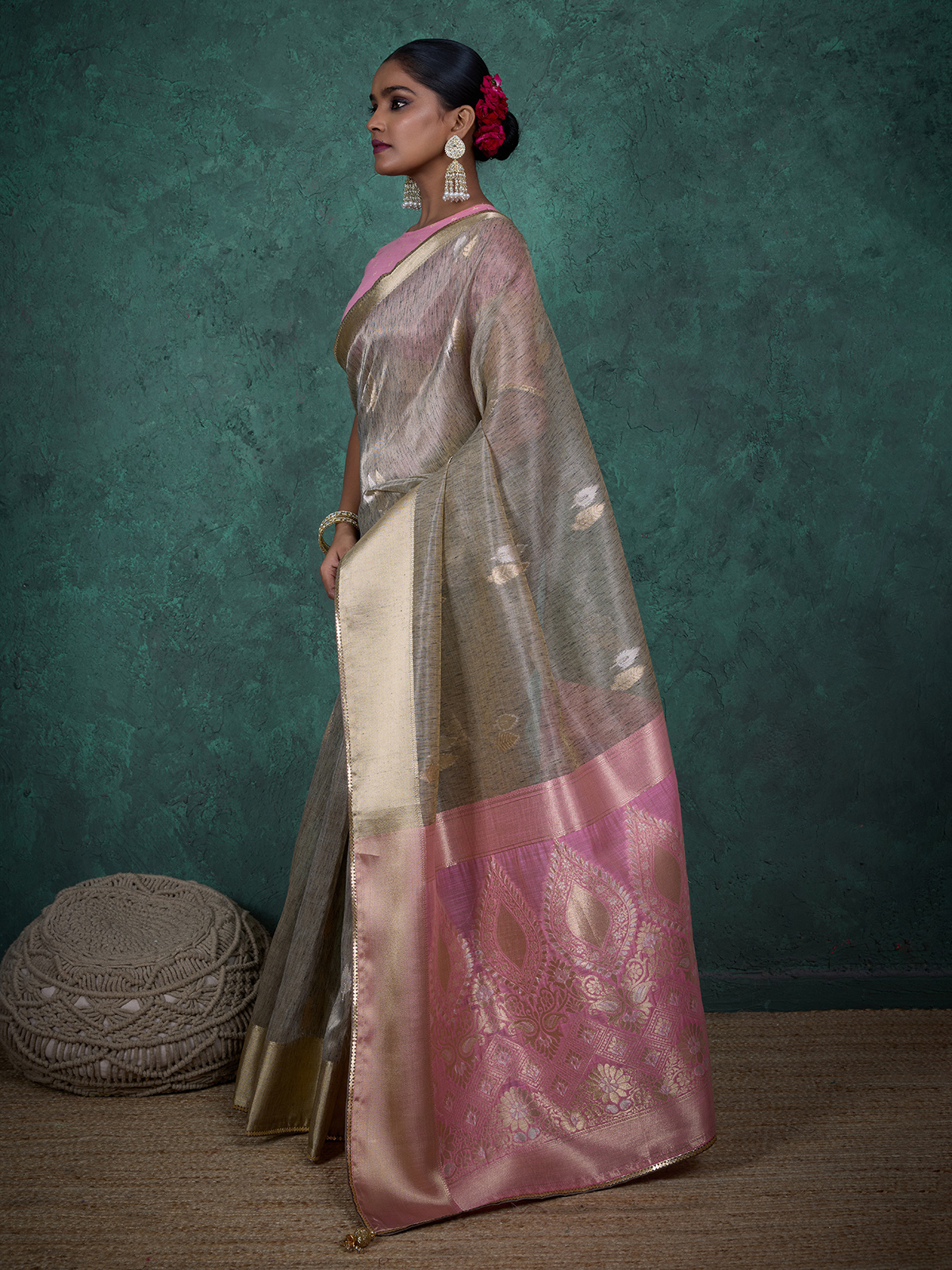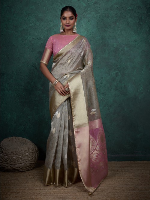 Chic Grey Zari Woven Linen Blend Saree Design