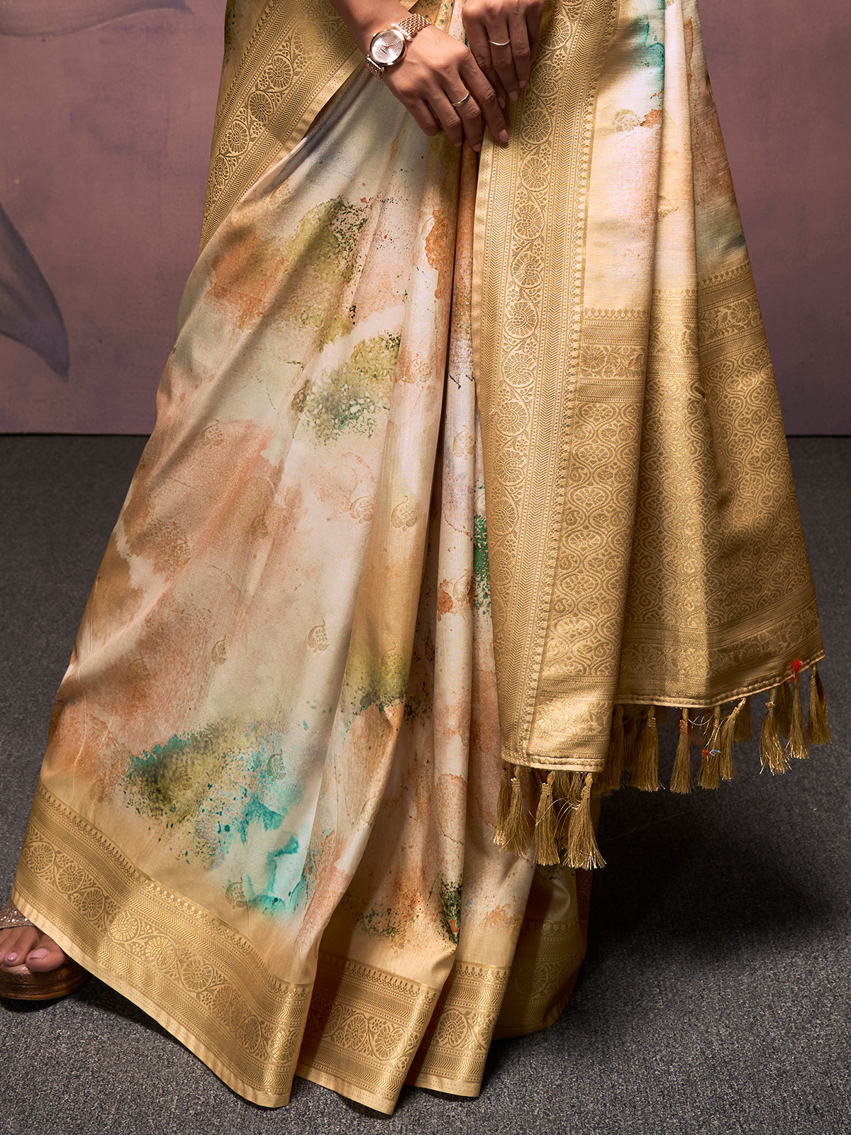 This women saree pairing highlights an unstitched blouse fashioned from rich handloom silk. Subtle beige hues are enhanced with artistic painting and ornate zari detailing, lending a graceful festive finish. Suitable for weddings and special functions, it effortlessly balances traditional heritage with contemporary elegance.