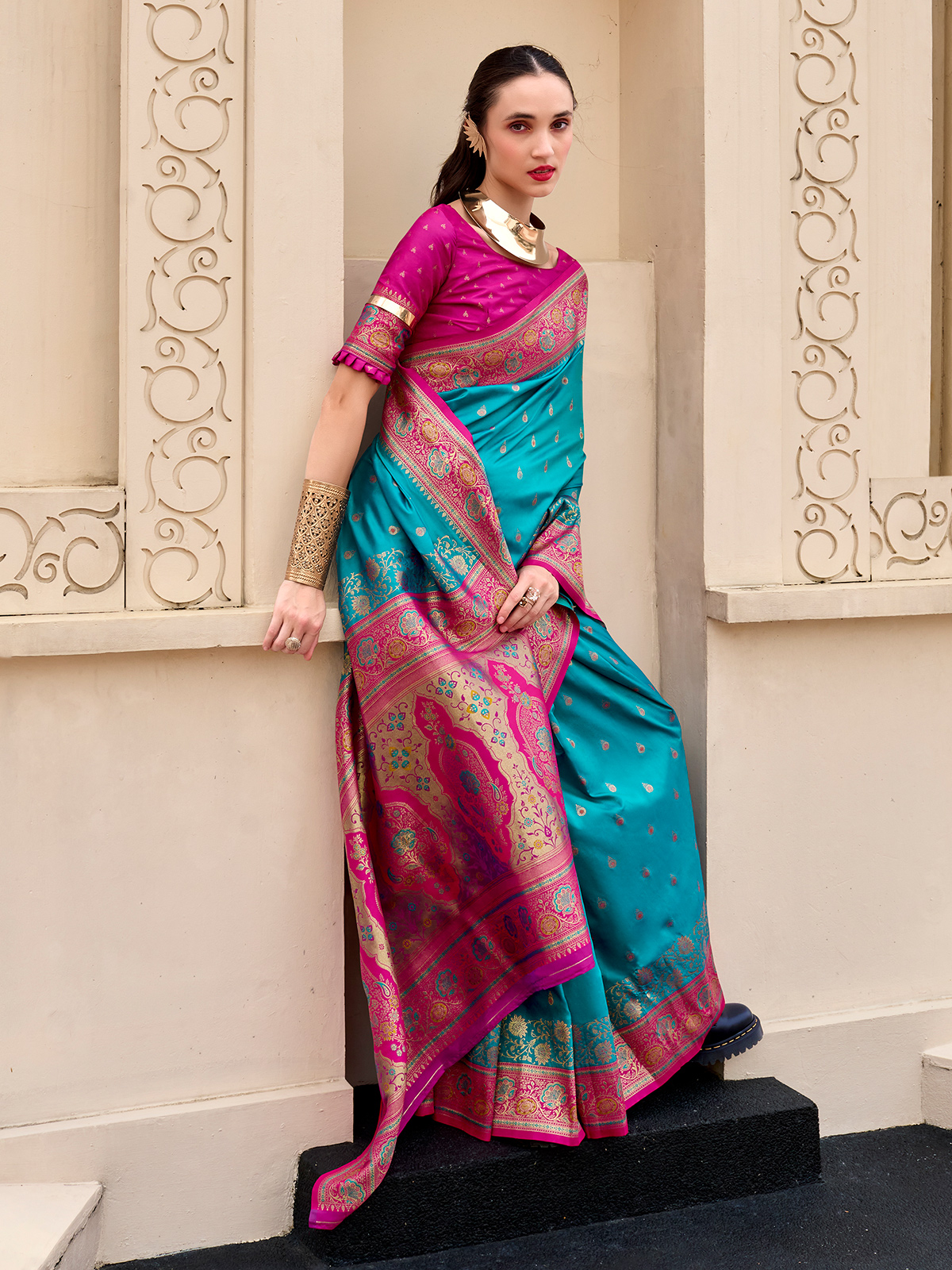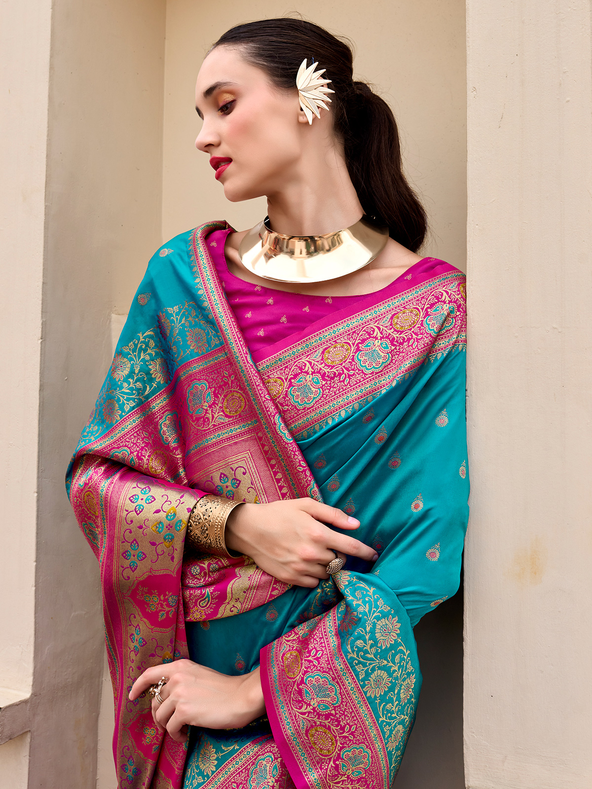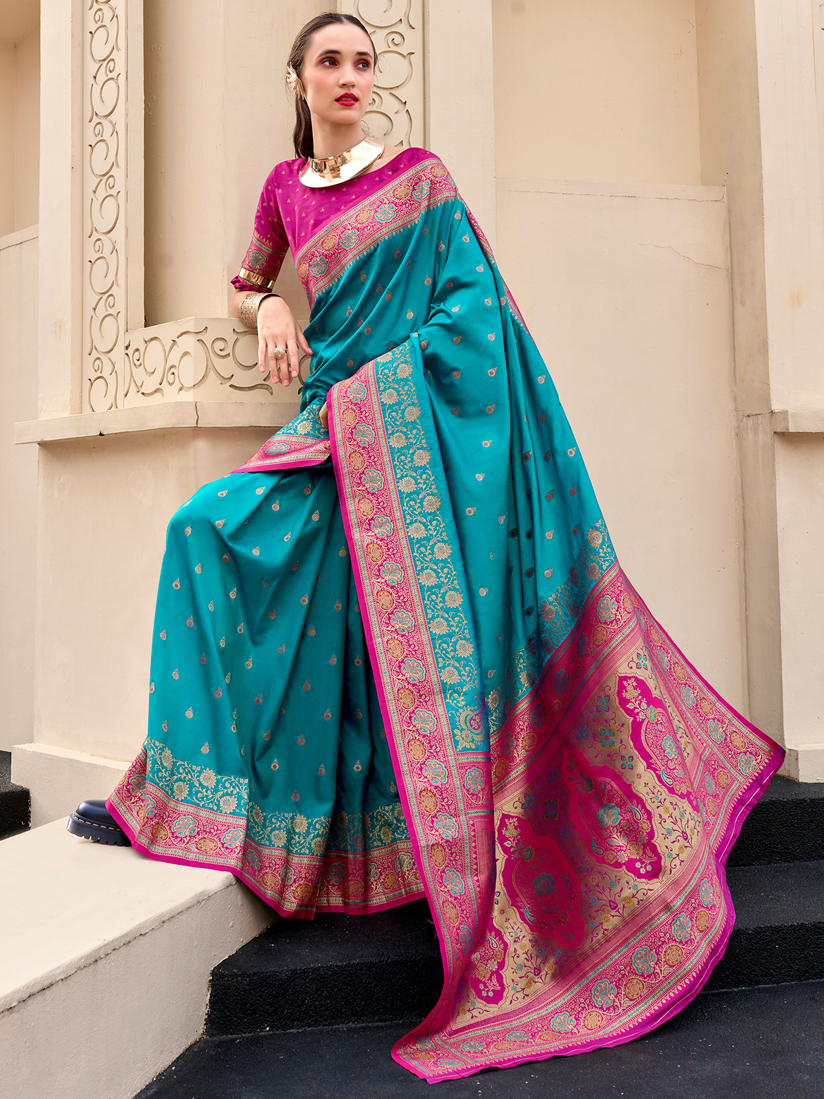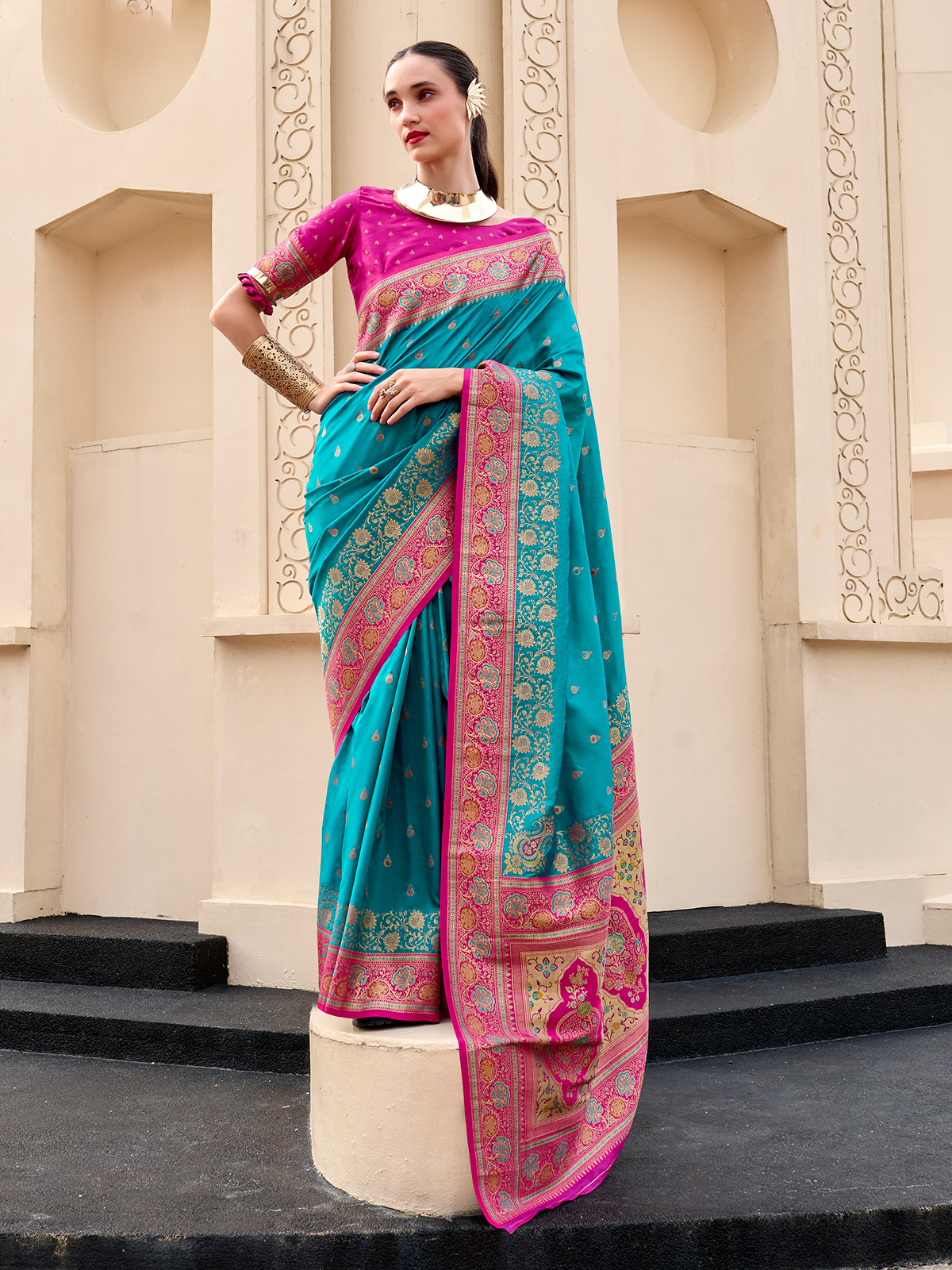 Woven from classic blue pure soft banarasi silk, this women saree reflects refined elegance through shimmering gold and silver zari work. Exquisite motifs enhance its traditional beauty, while the unstitched blouse offers styling flexibility. Suitable for weddings, sangeet celebrations, and festive occasions, it blends heritage craftsmanship with timeless sophistication.