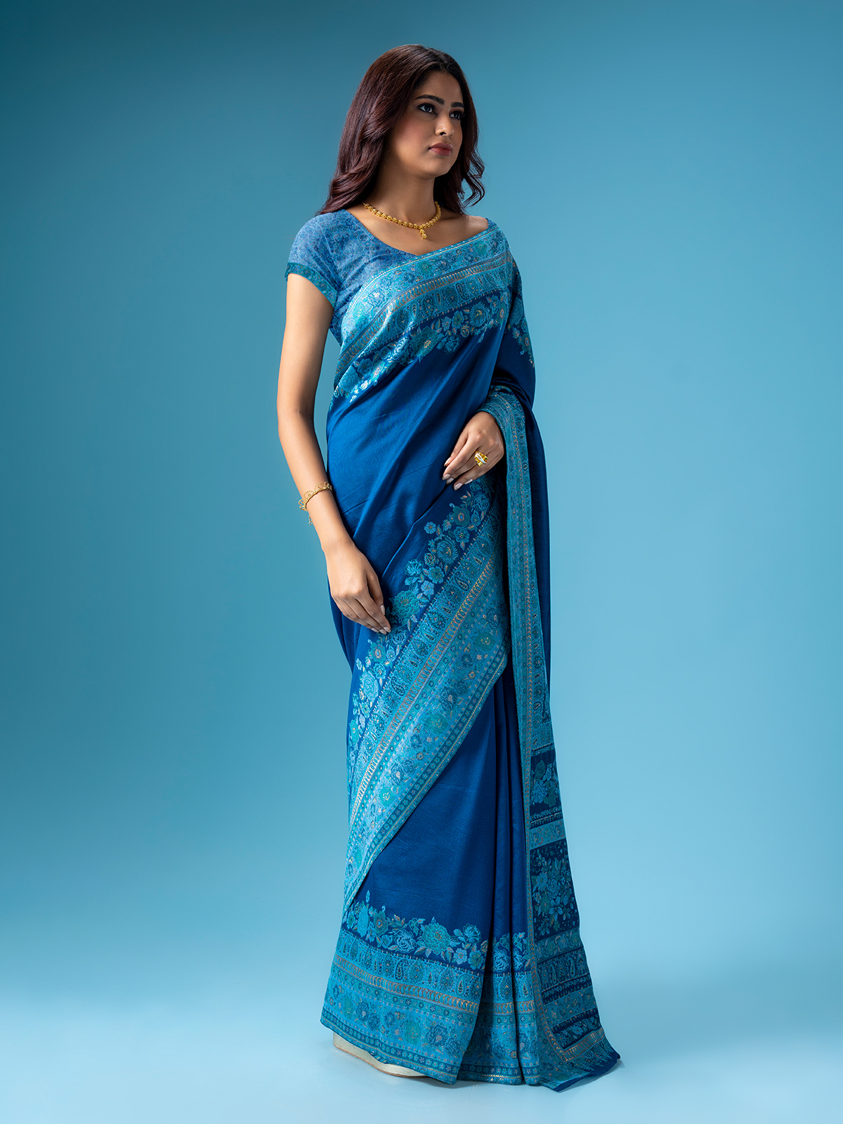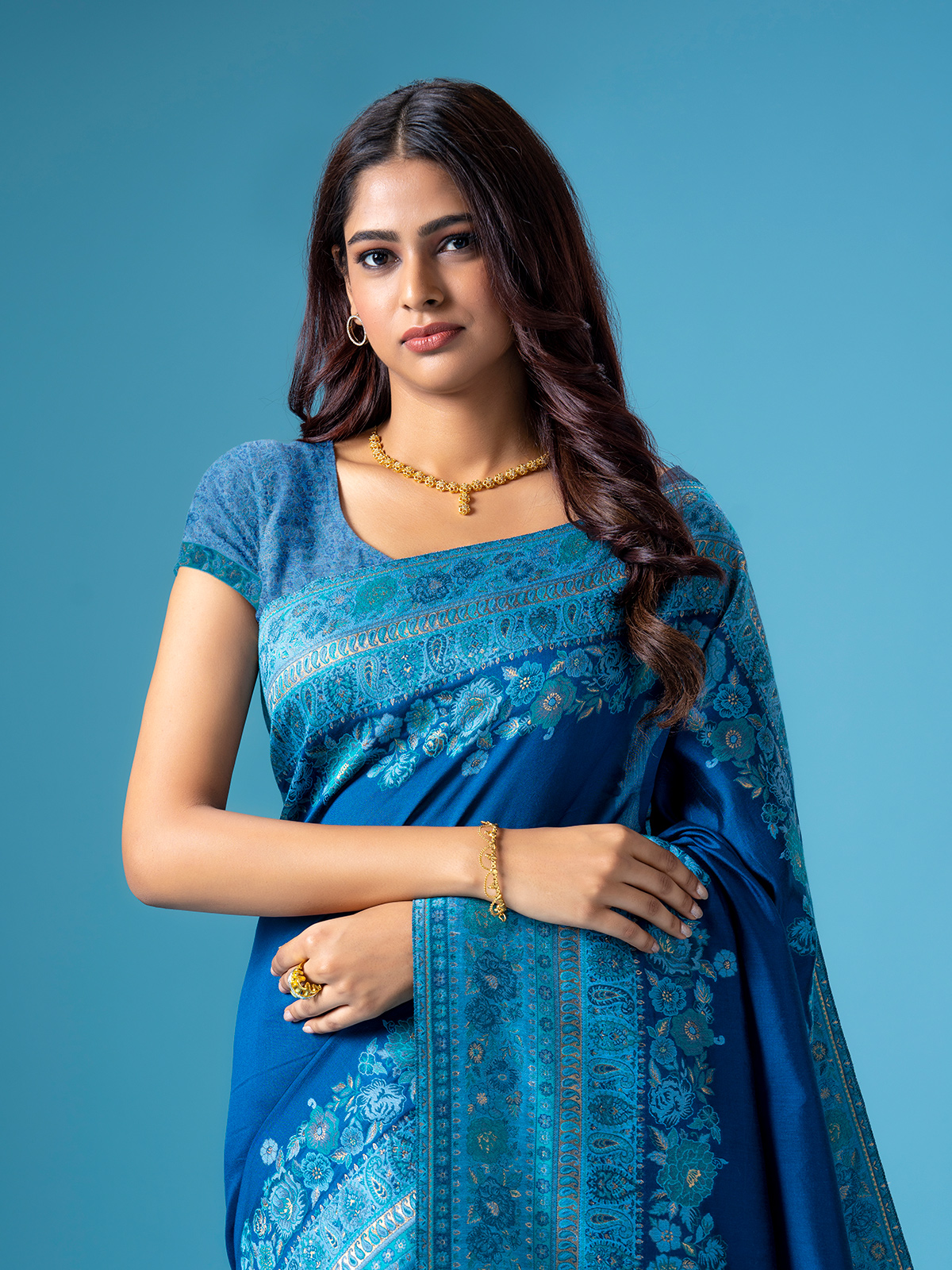 Elevate your ethnic style with this classic blue pashmina silk saree, beautifully detailed with traditional Kashmiri weaving. A timeless choice for graceful occasions. Comes with a matching blouse piece.