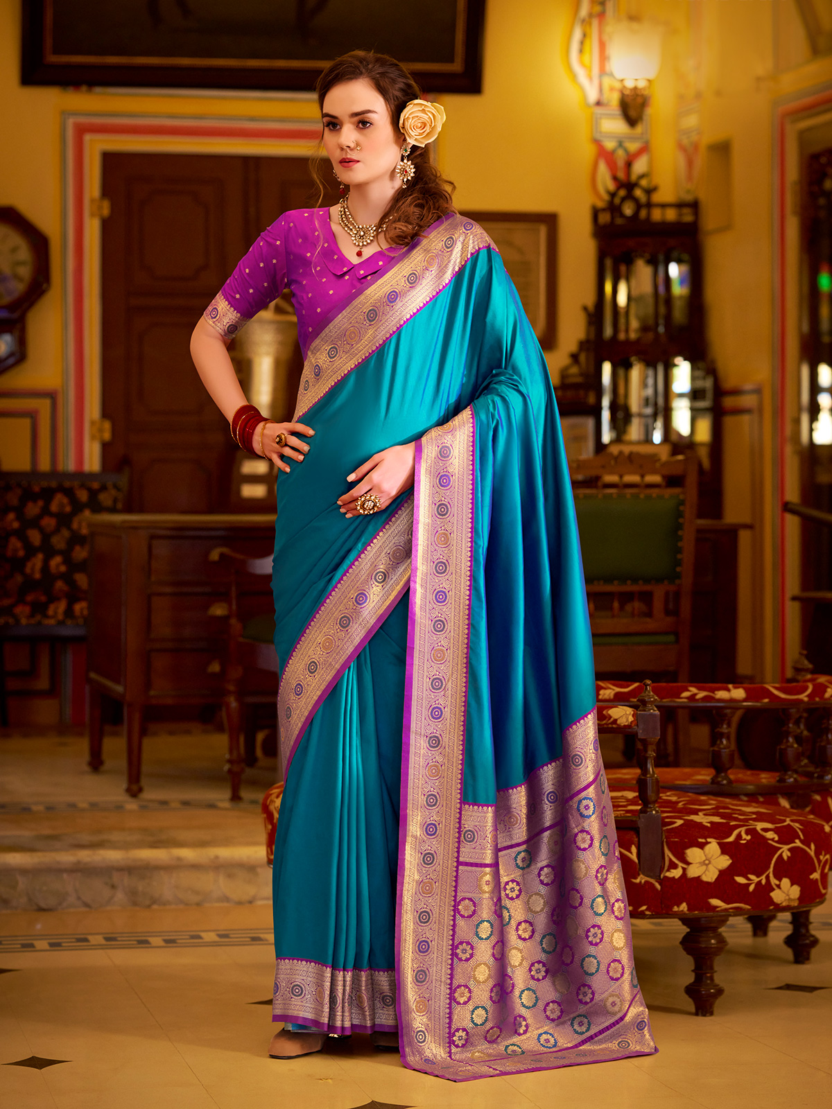 Crafted in soft silk, this blue saree carries refined zari work only along the border for a subtle and traditional appeal. Paired with an unstitched blouse, it is ideal for weddings, puja, and party wear. Its graceful drape and rich tone elevate any festive moment.