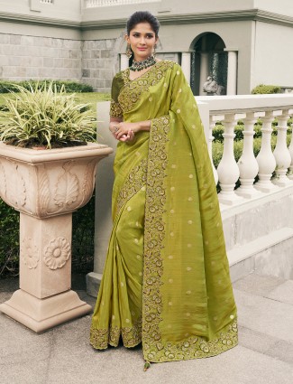 Go classic with a touch of freshness in this green tissue silk saree, designed with mirror details, zari borders, thread work, stone accents and zardosi motifs. Ideal for poojas or traditional gatherings. Includes an unstitched blouse piece for your personalized ethnic fit.