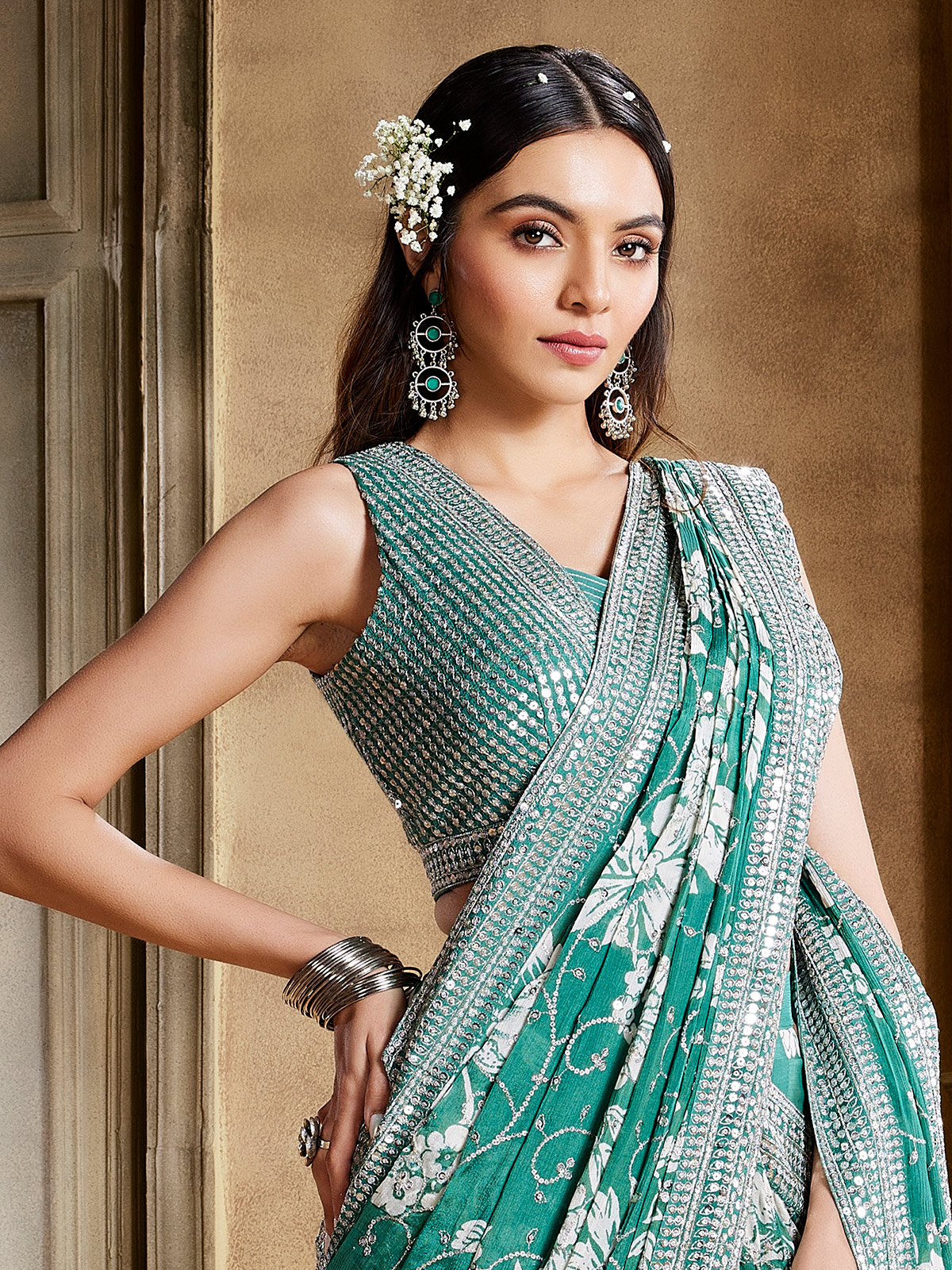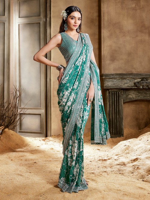 Effortlessly combine comfort and style with this classic sea green georgette pre dreap saree. Enhanced with sequins and resham work with amazing printed pattern, comes with a ready made blouse for a timeless appeal.