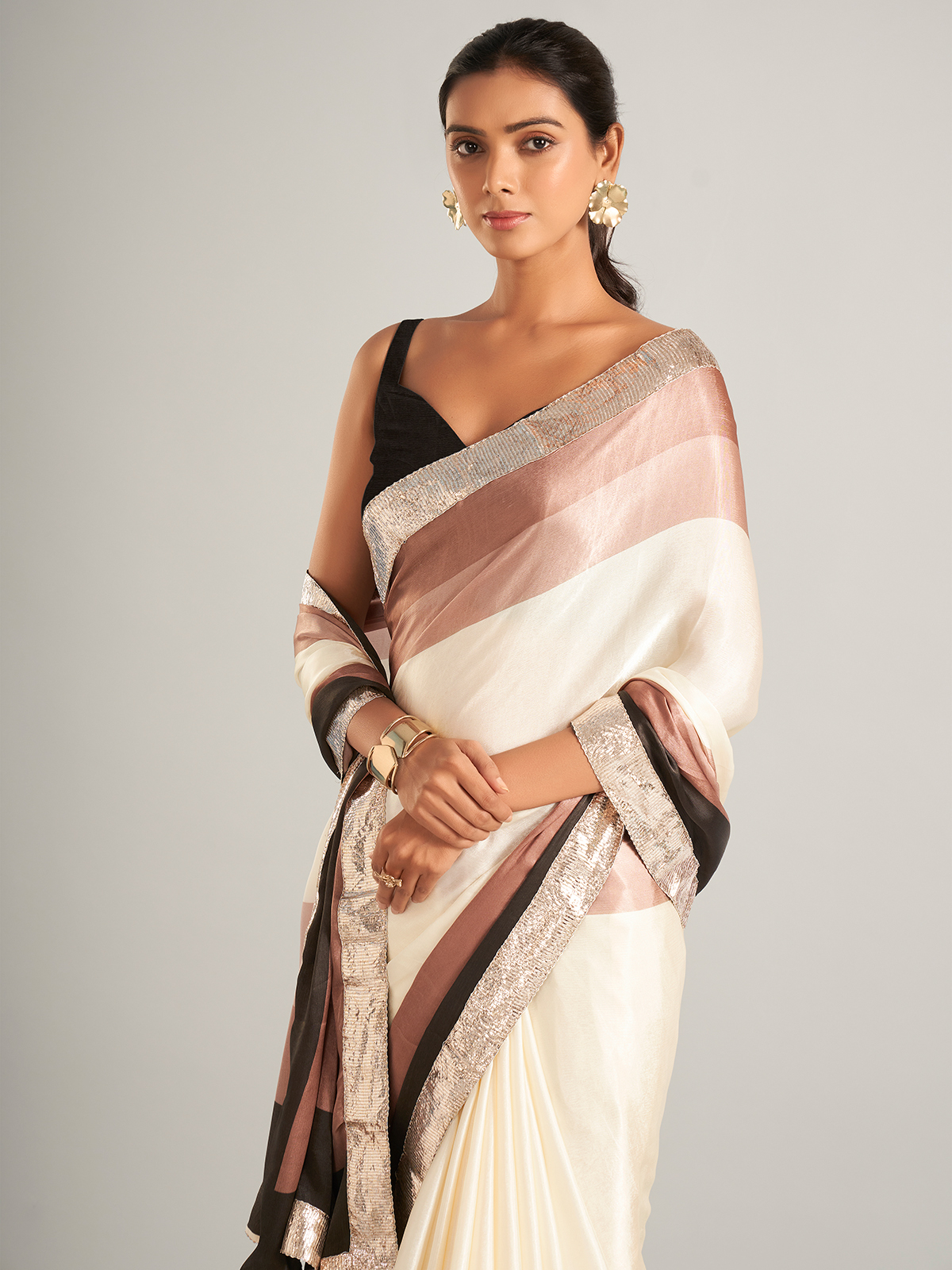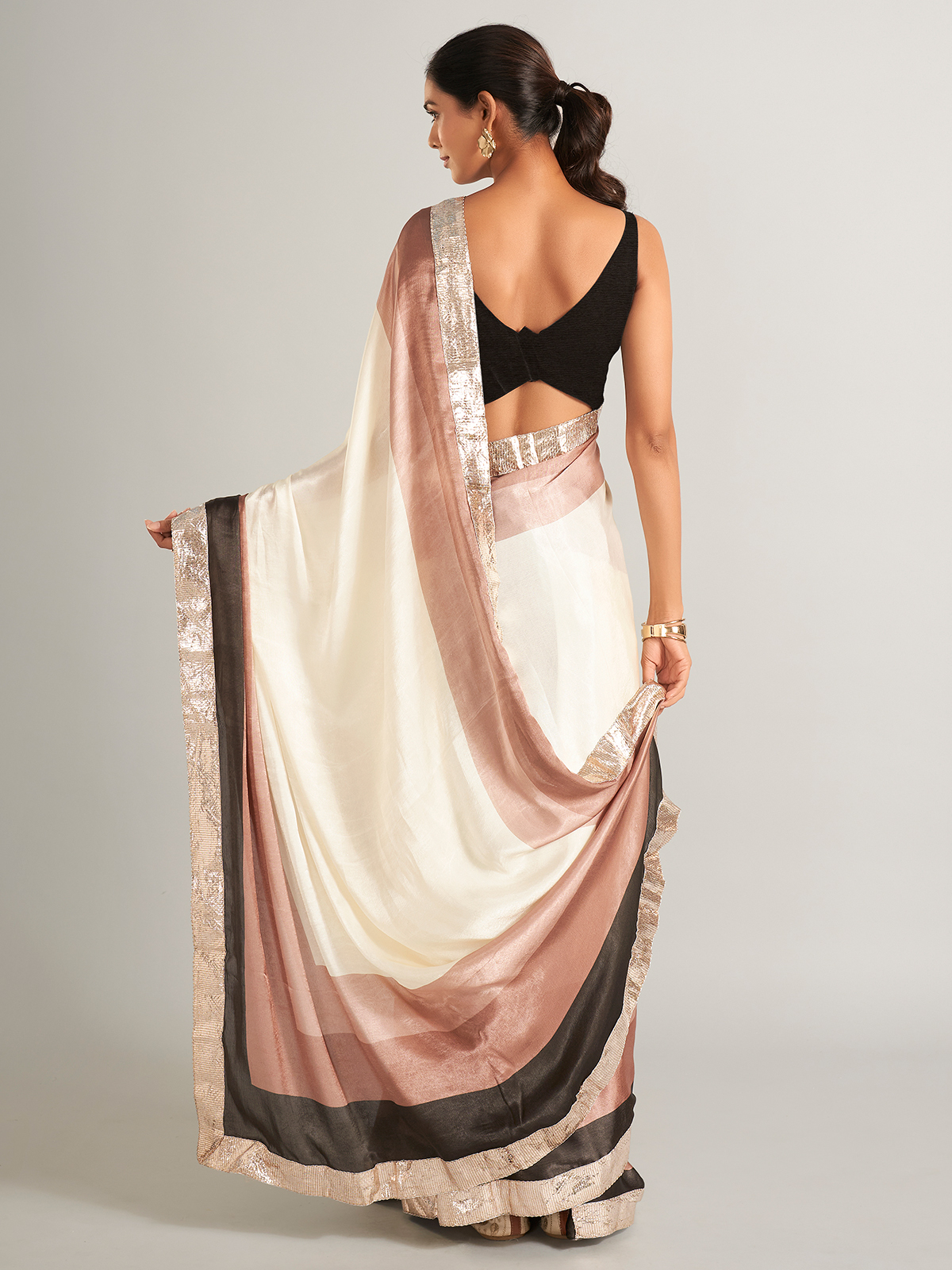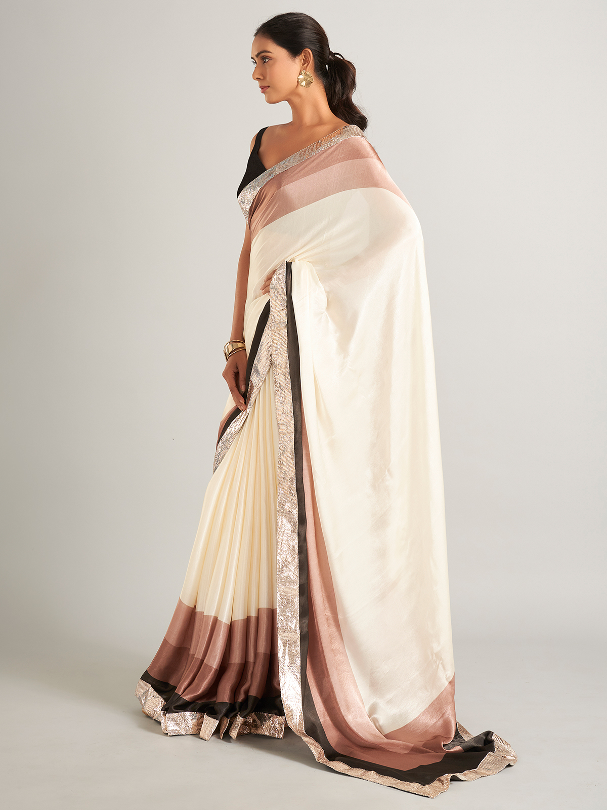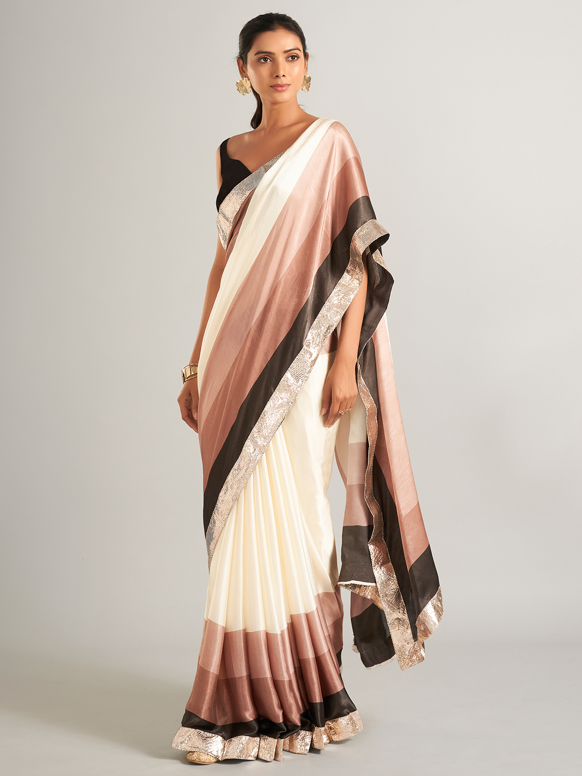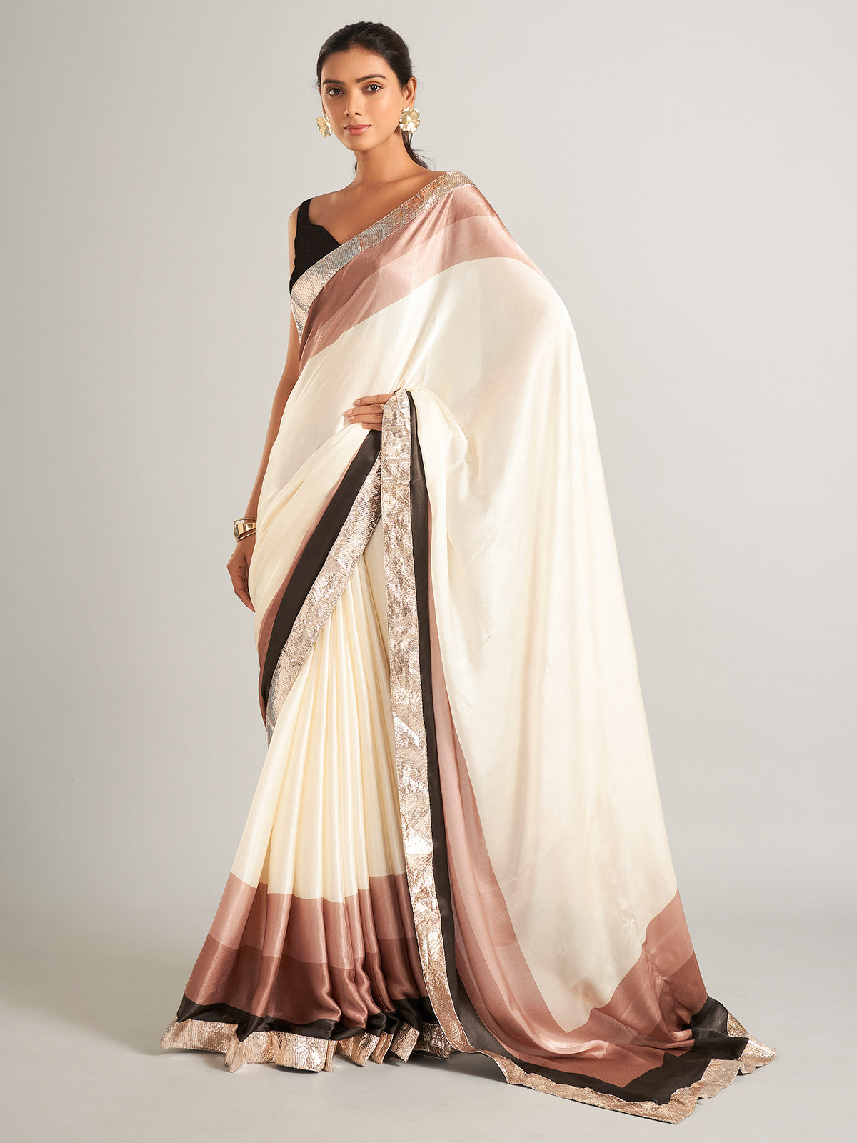 Wear this cream and brown Masru silk saree to look stunning and sophisticated. Here is a small touch-up of beauty with a stripe and golden lace close to the border. includes a blouse. Wear it to a party to receive flattering remarks. It comes with an unstitched blouse.