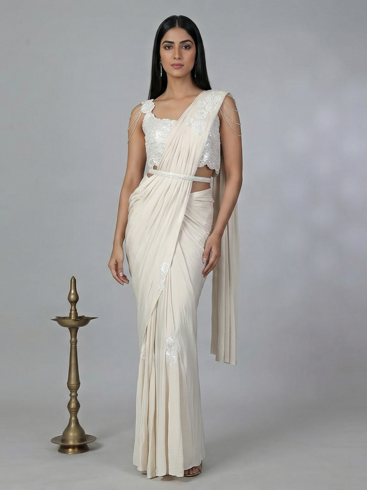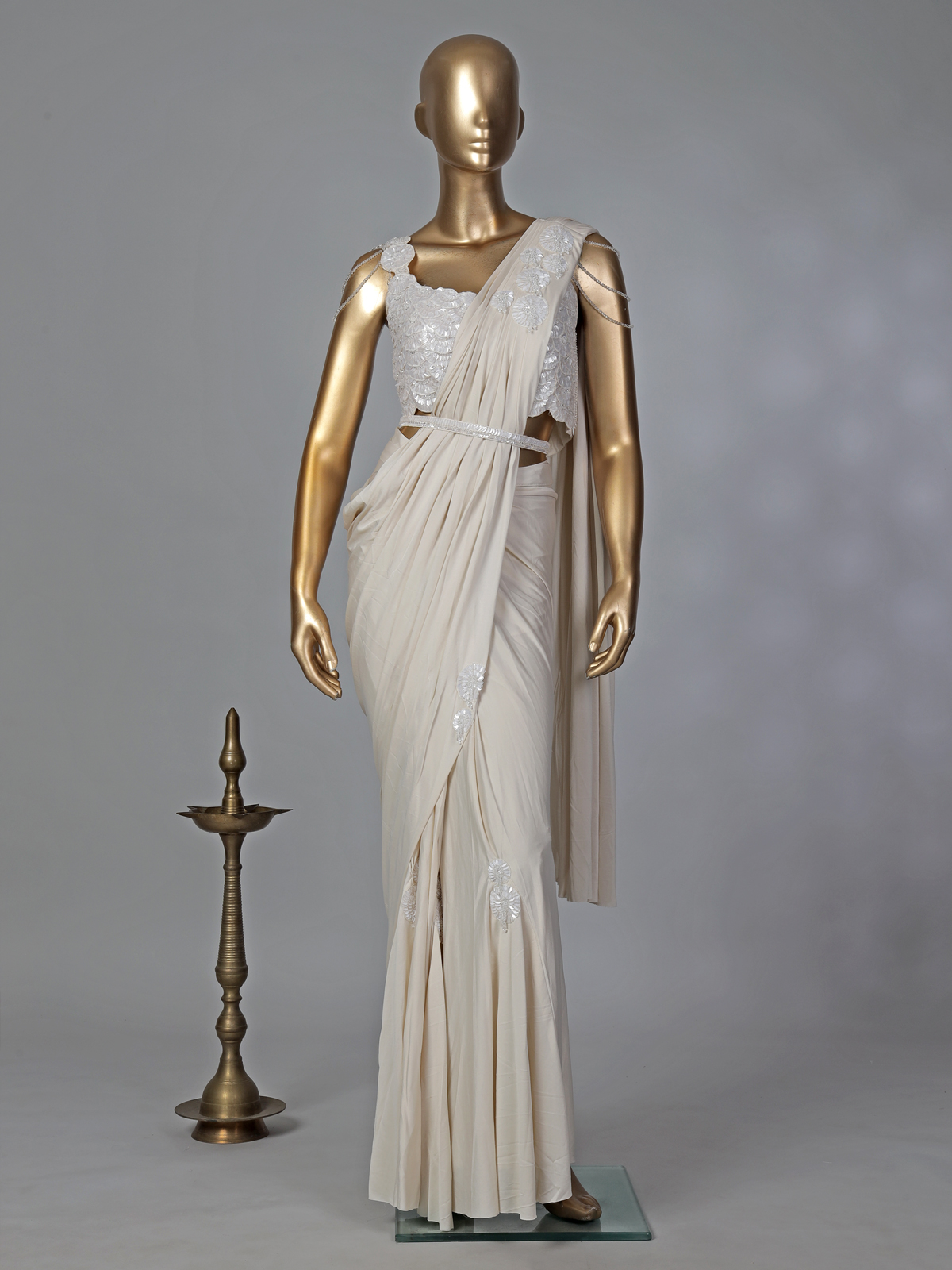 Classy Cream Lycra Ready To Wear Saree With Belt