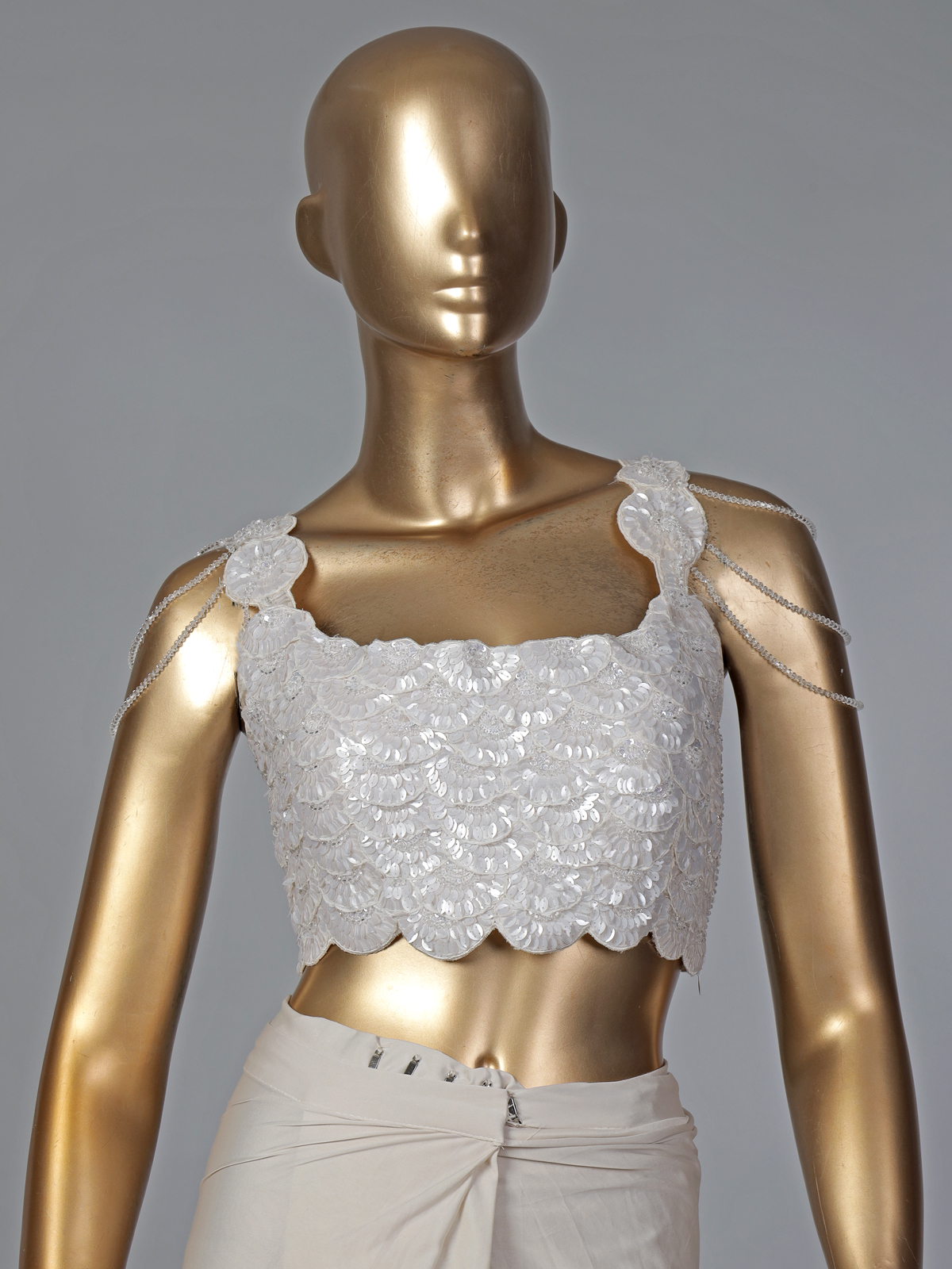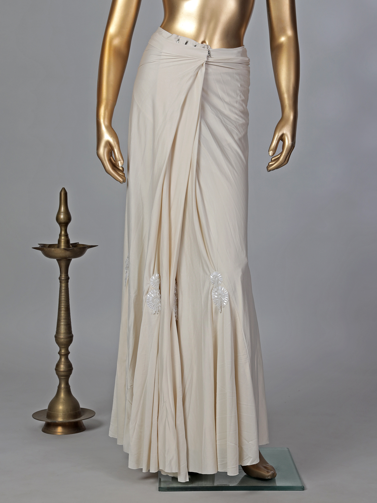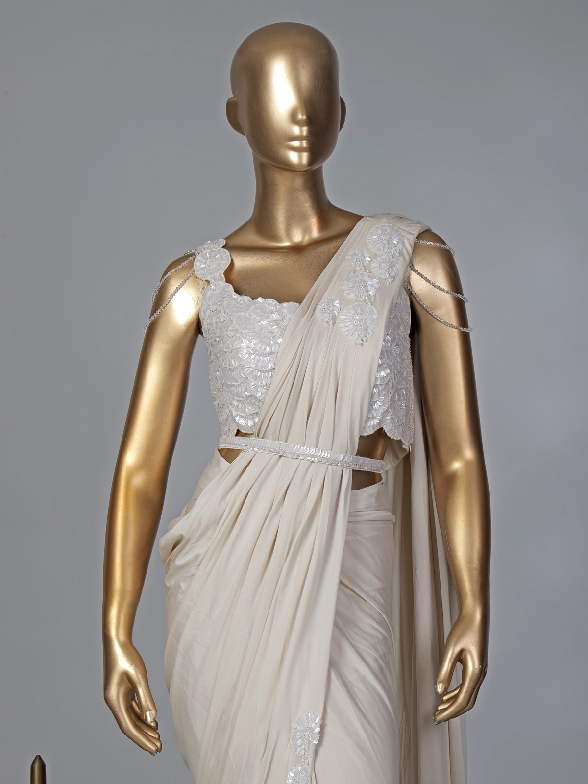 Understated yet glamorous, this cream lycra ready-to-wear saree reflects refined festive style. The sleeveless square-neck blouse is detailed with sequins, cutdana, and bead embellishments that add radiant charm. Completed with a stylish belt, it is perfect for weddings and party occasions.