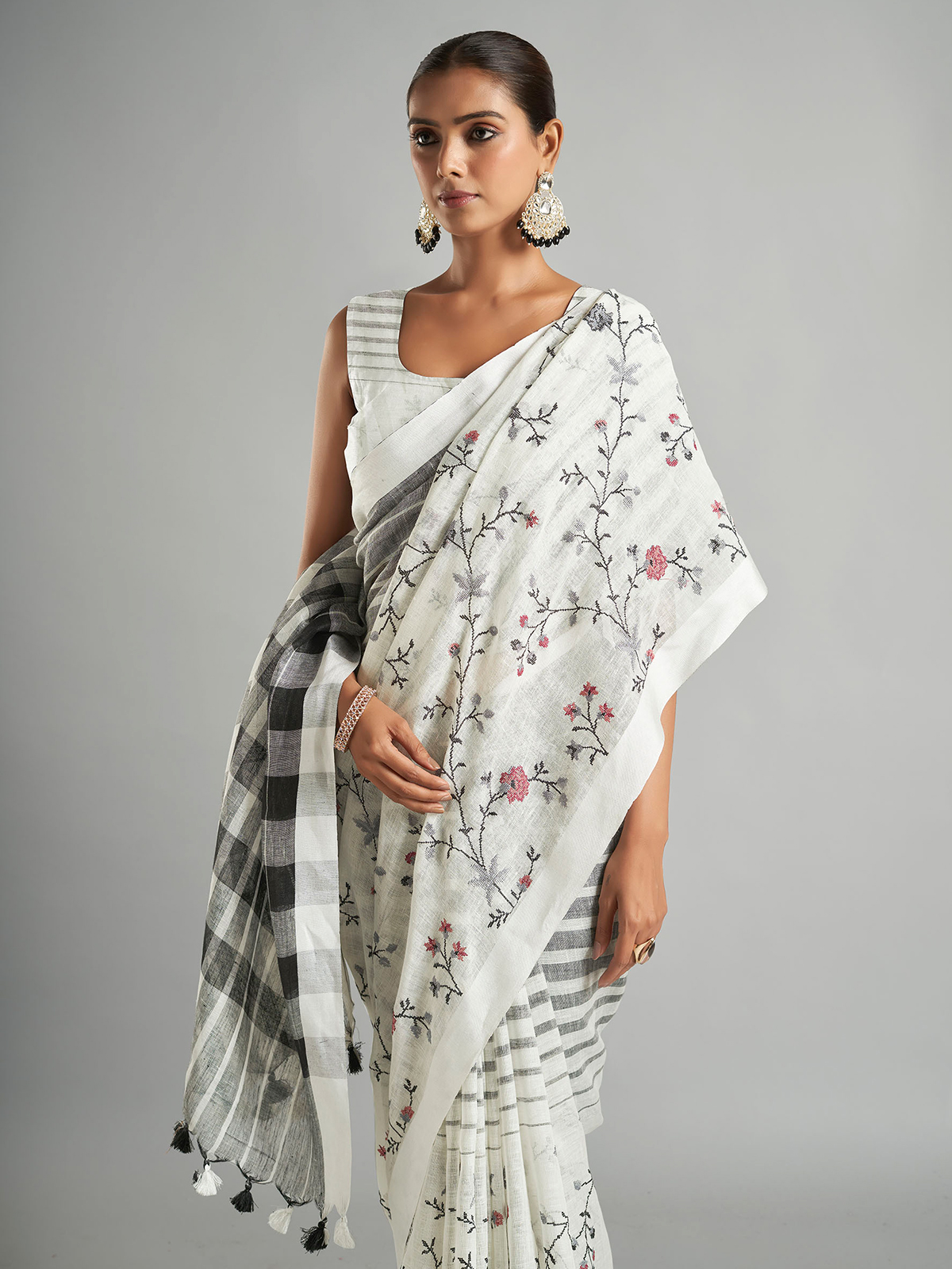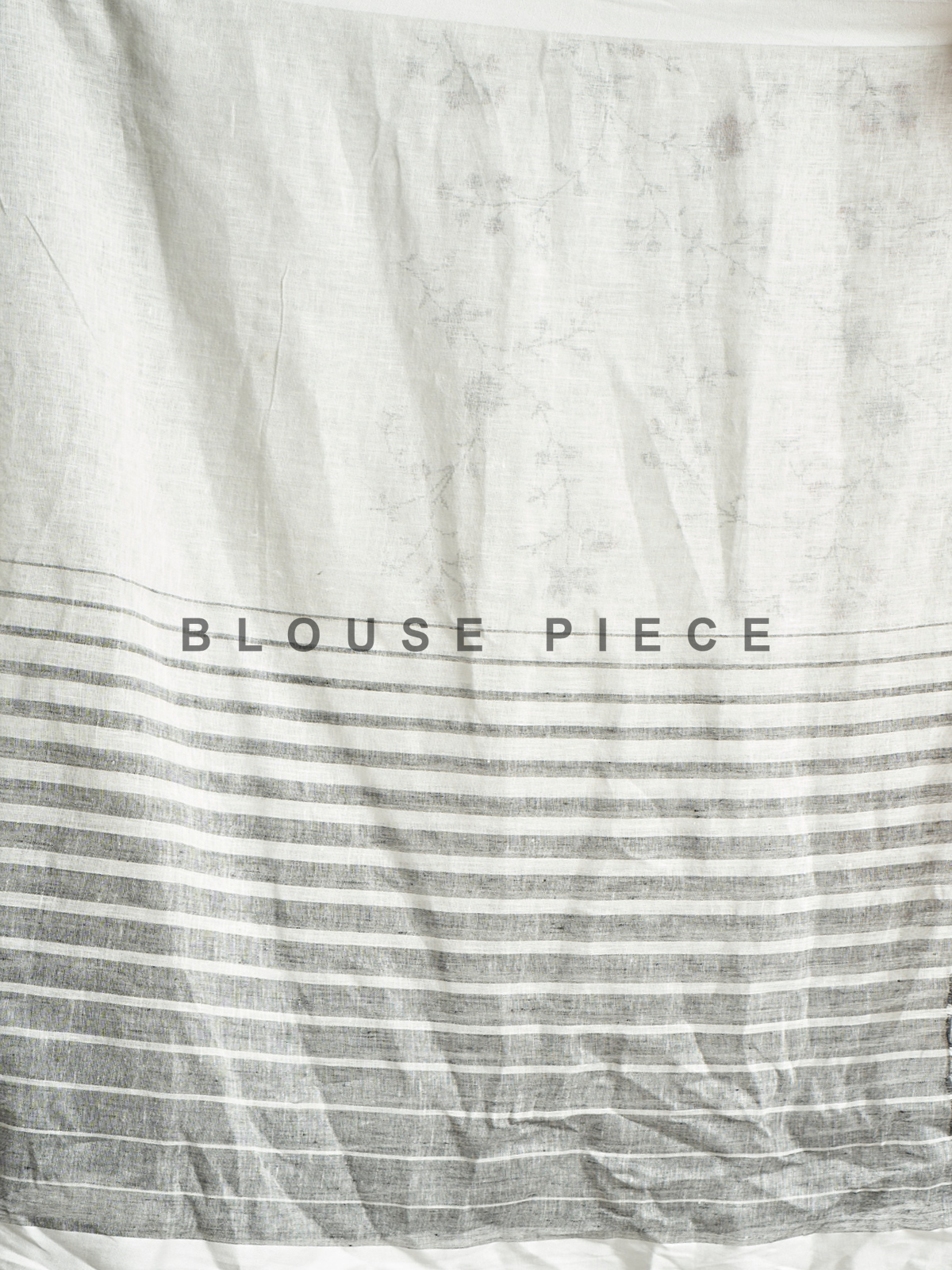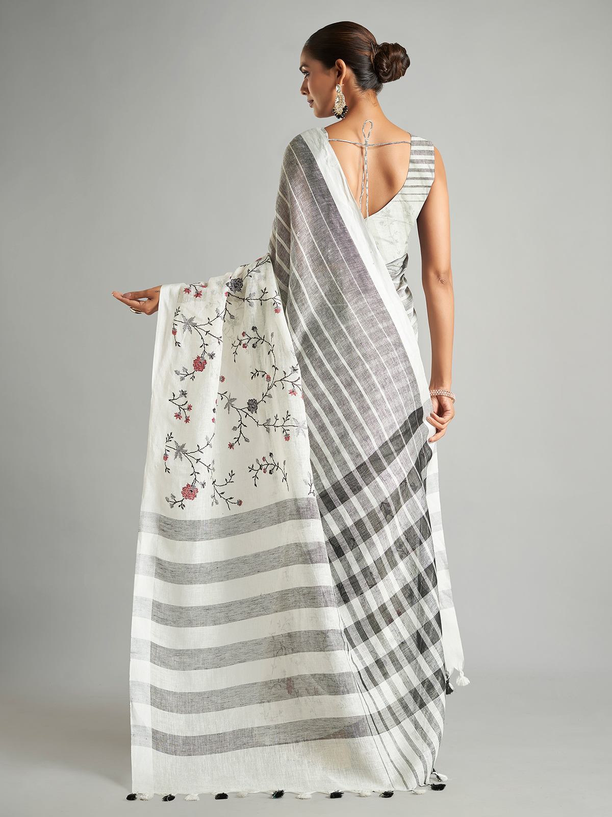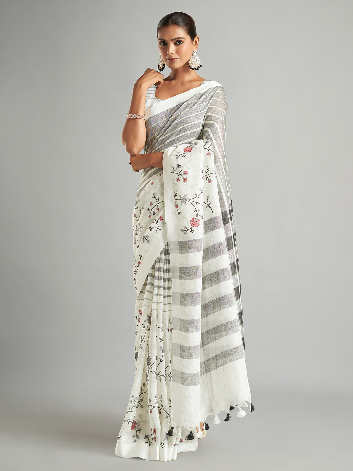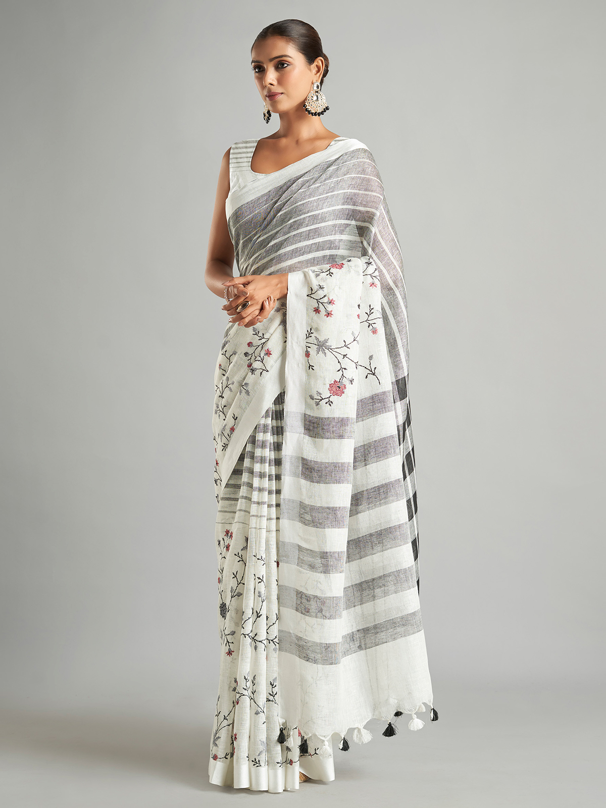 With easy draping, this white cotton linen stripe saree can be worn for any occasion. Enhanced with a floral thread weaving design that highlights the saree well, it comes with an unstitched blouse.
