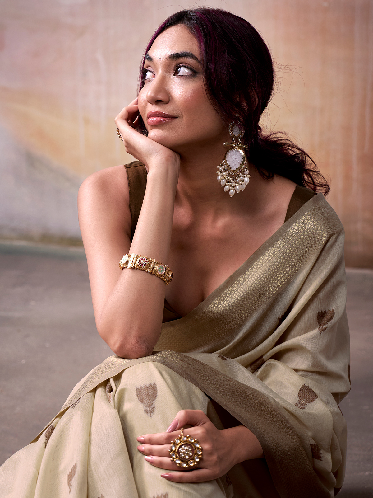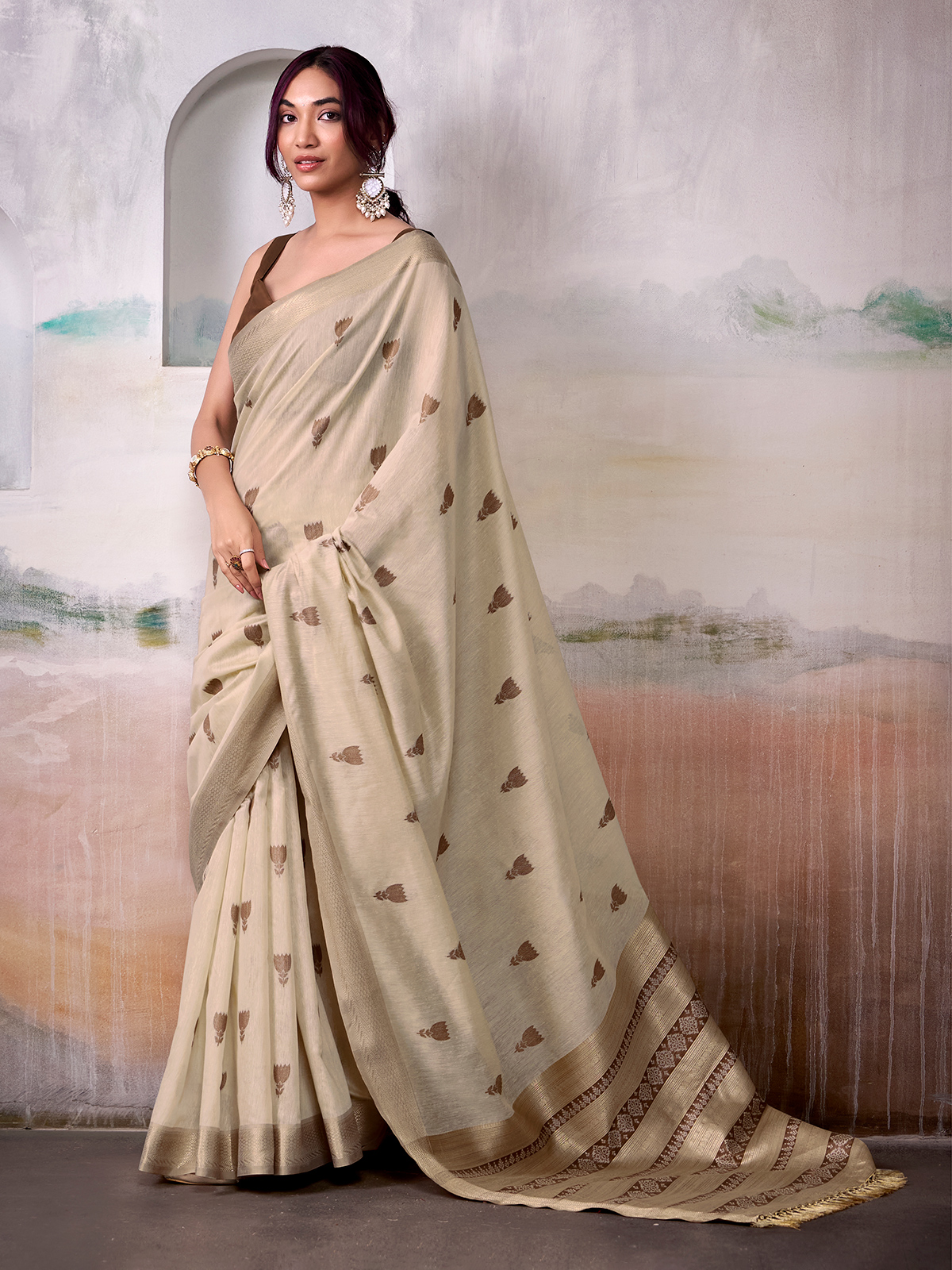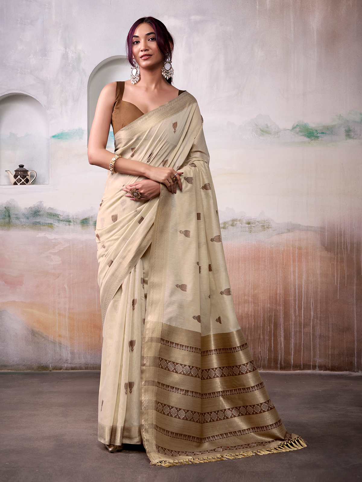 A graceful fusion of tradition and charm, this soft beige cotton saree features intricately crafted motifs and a striking brown border. Ideal for festive occasions and daytime celebrations, it includes an unstitched blouse piece for a complete, polished ensemble.