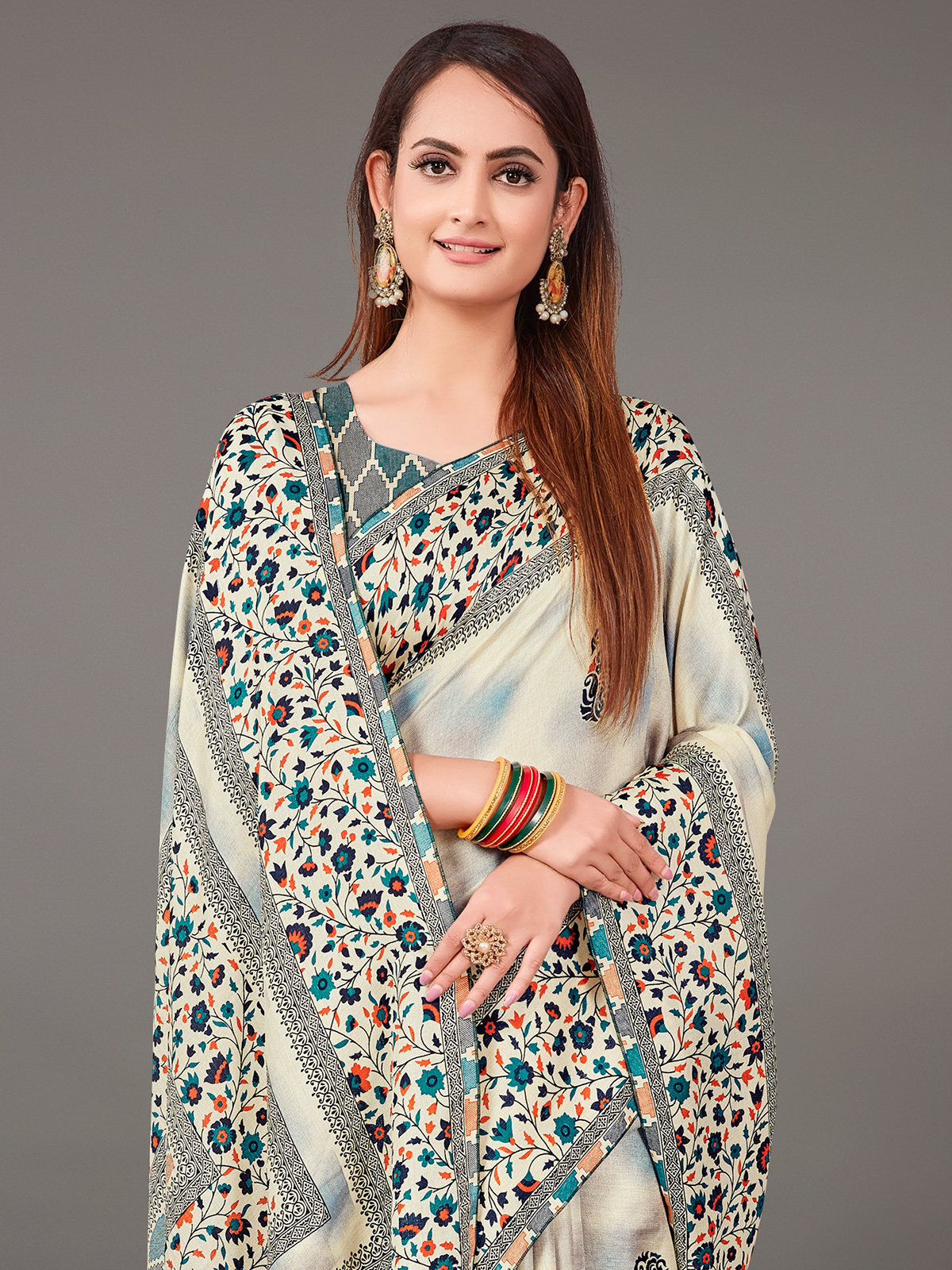 Blending tradition with modern flair, this cream and blue saree in pashmina silk features a bold printed design that exudes subtle sophistication. Ideal for daytime events or casual evening outings, it comes with an unstitched blouse piece for a customized fit.