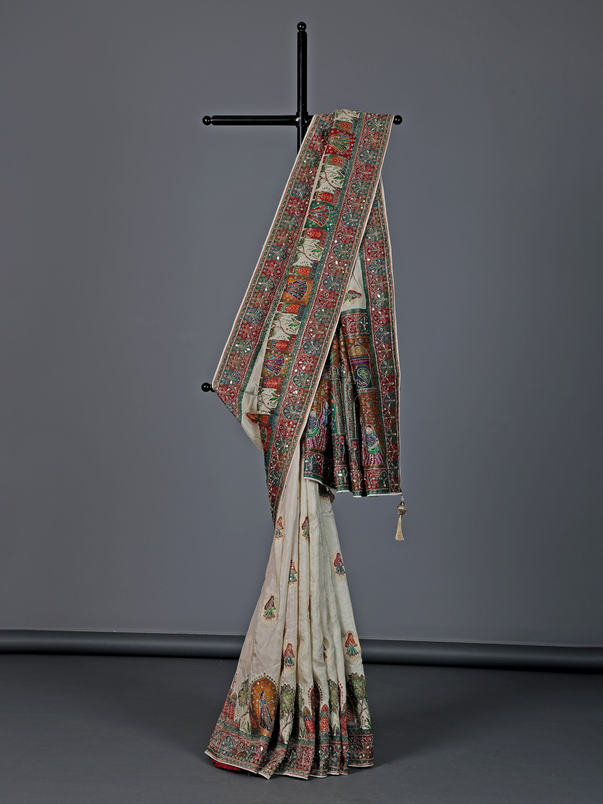 Soft and sophisticated cream art silk saree features colorful motifs enriched with cutdana, mirror, zardosi, sequins and diamond work. It reflects subtle luxury, making it perfect for weddings and celebrations. Comes with an unstitched blouse piece for elegant customization.