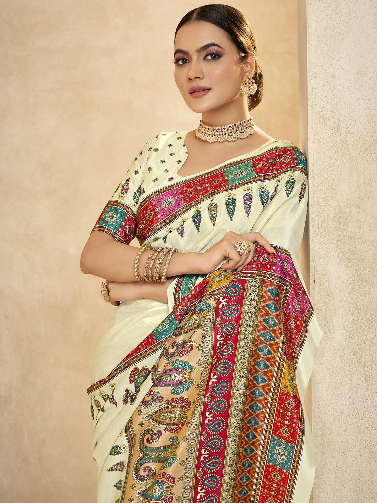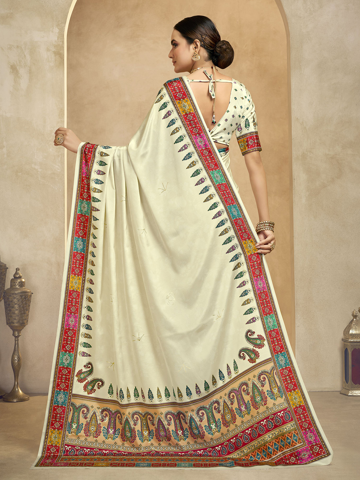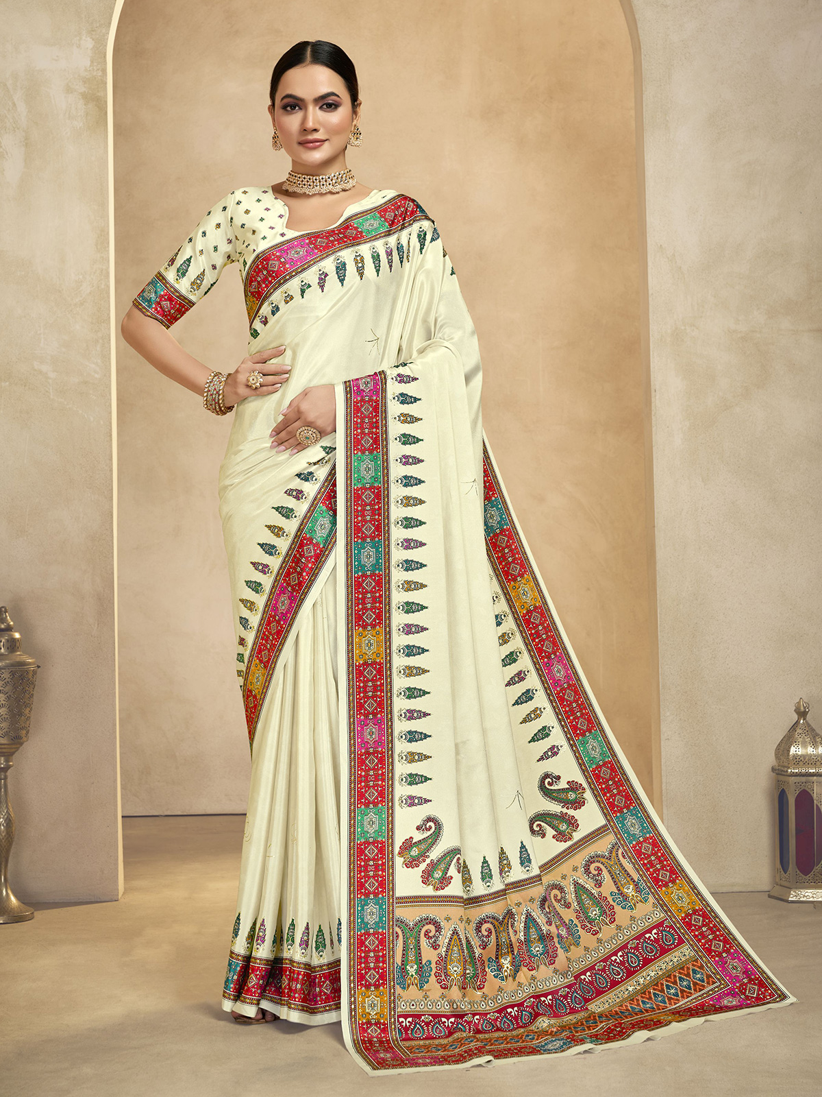 Subtle and graceful, this cream crepe silk saree is enhanced with soft digital prints that add refined festive appeal. Lightweight and comfortable, it comes with an unstitched blouse piece, making it perfect for festive wear, casual outings and traditional daytime functions.