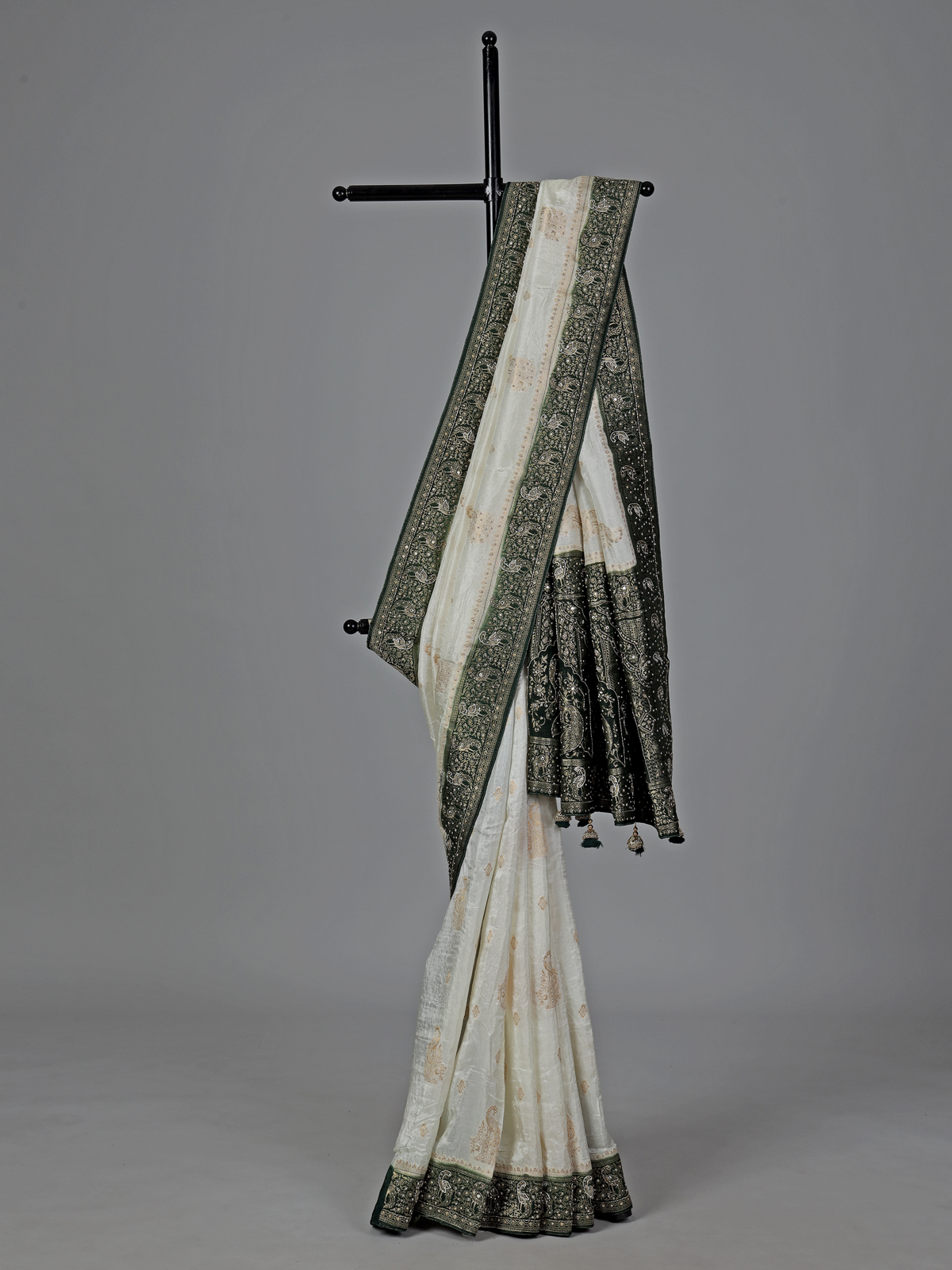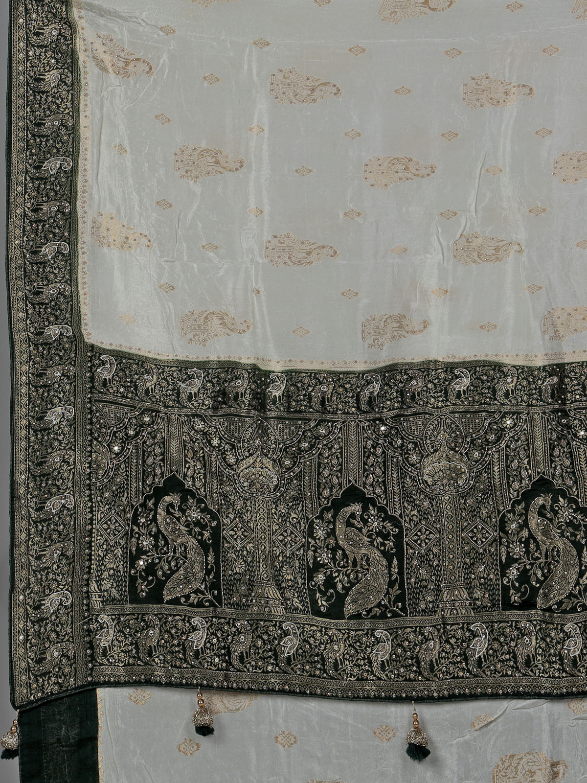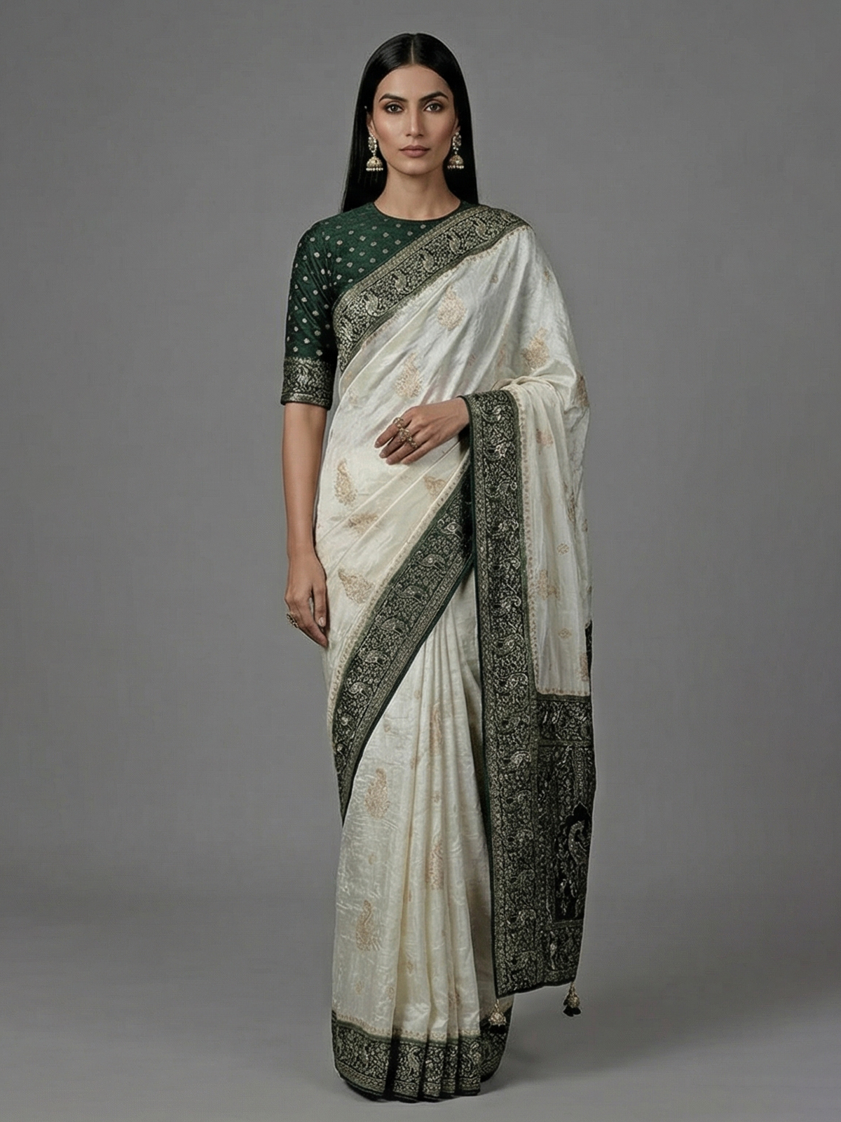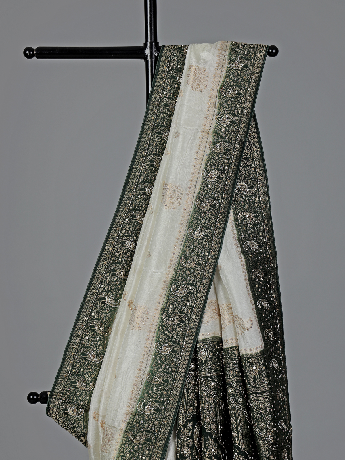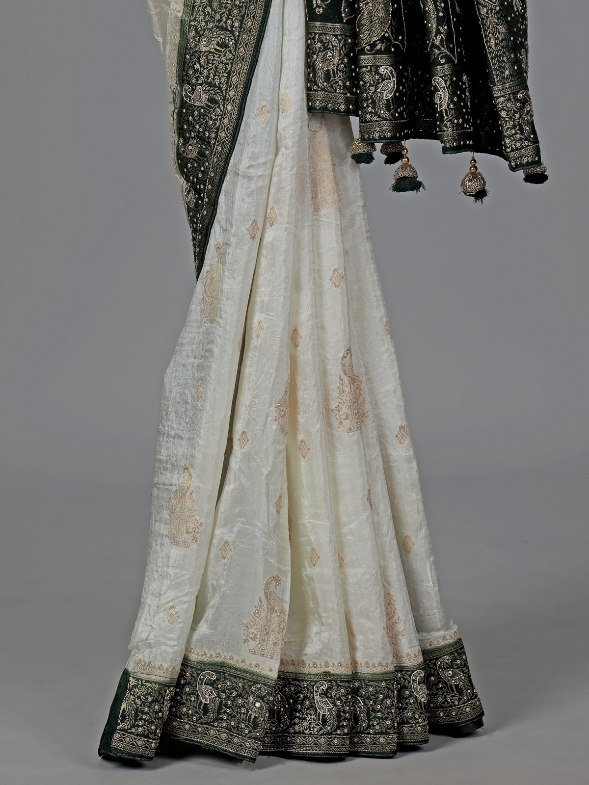 Timeless cream elegance meets intricate craftsmanship in this dola silk saree, featuring detailed cutdana, sequins, thread, mirror, stone and zari work. The green contrast border and pallu add a refreshing festive touch. Ideal for weddings and occasions, it comes with an unstitched blouse piece.